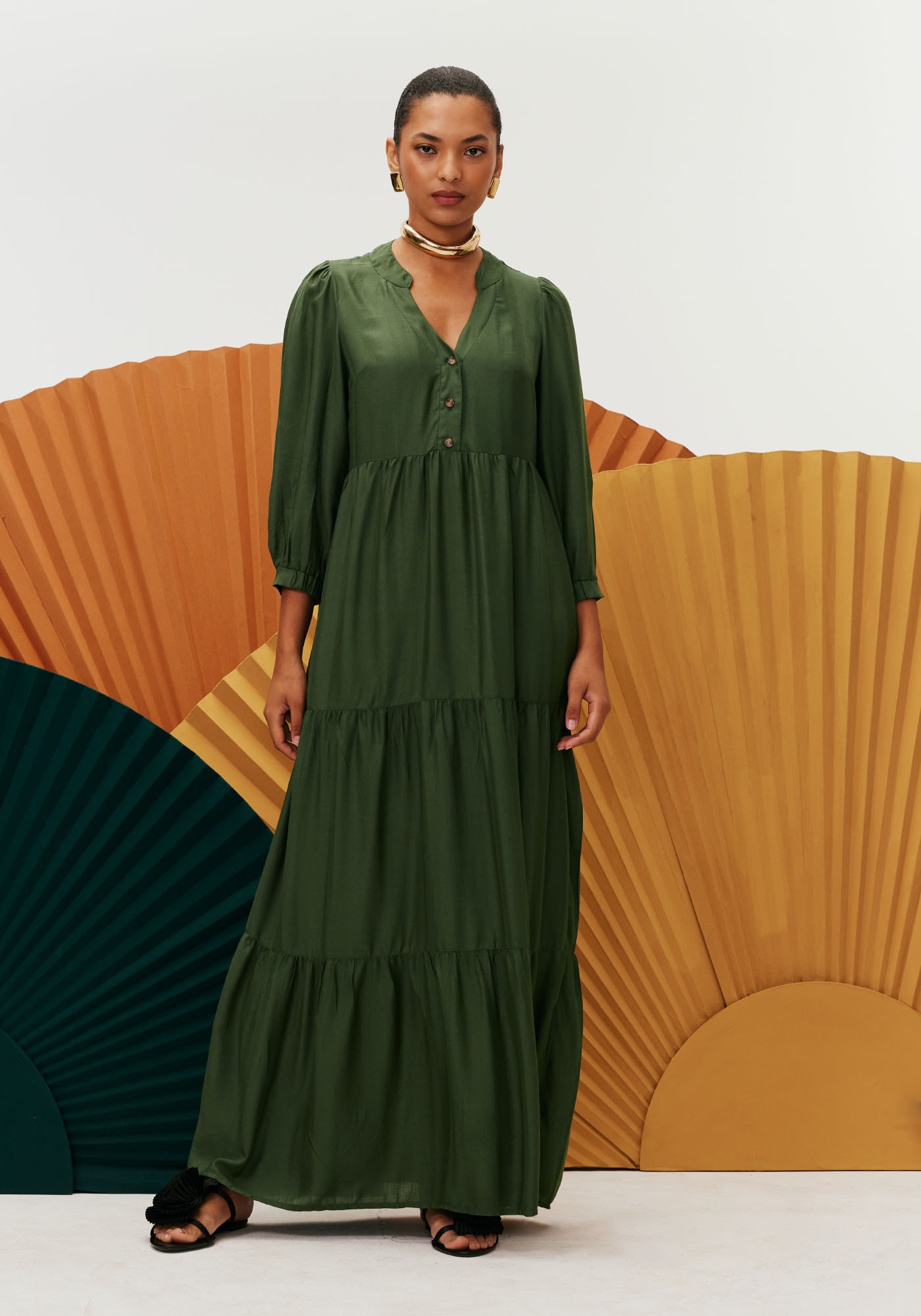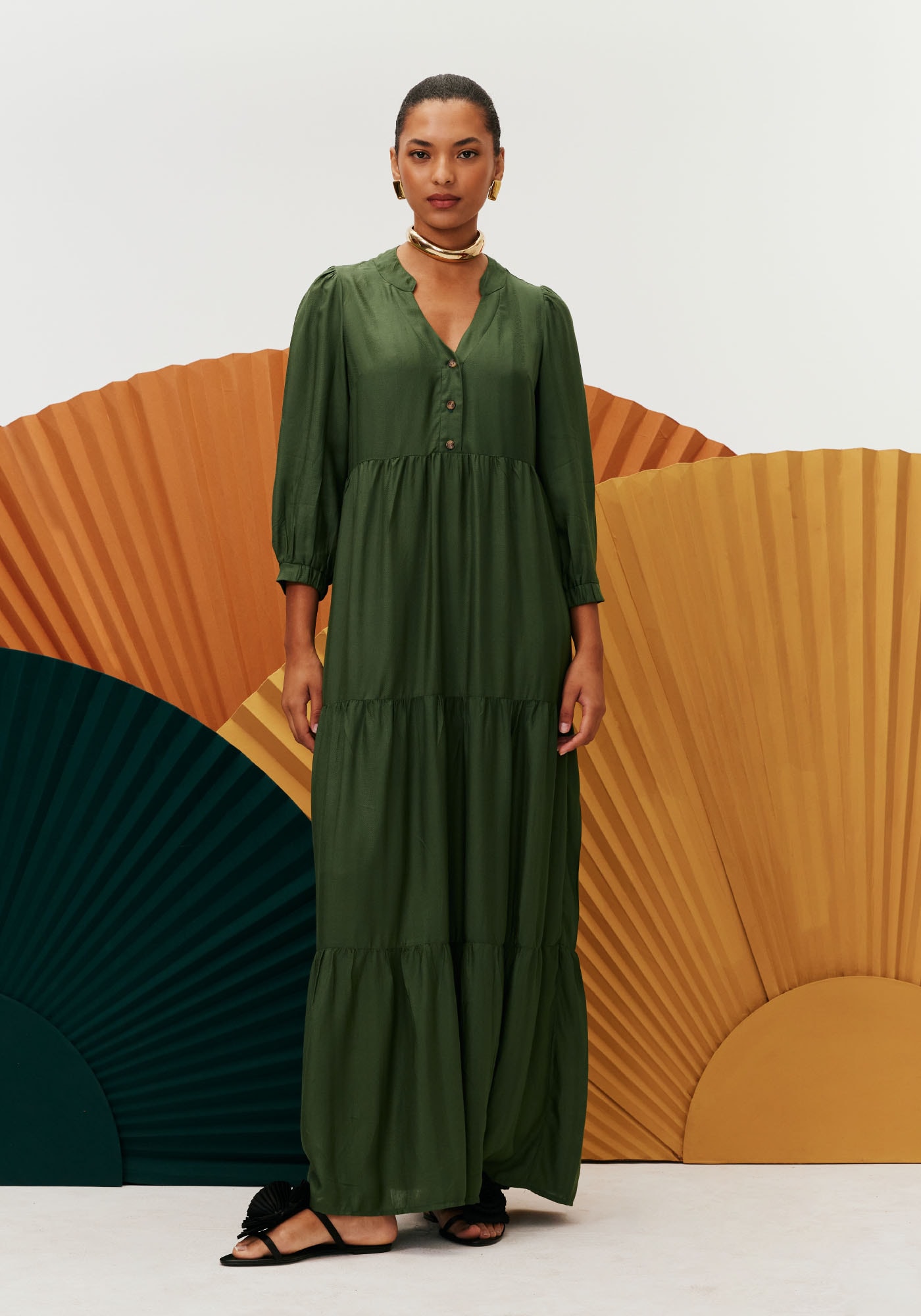 O vestido longo liso é aquela peça versátile sofisticada, que pode ser usada em qualquer ocasião. O modelo de mangas ¾ eabotoamento frontal possui duas marias a longo do comprimento que dão fluidez àpeça.