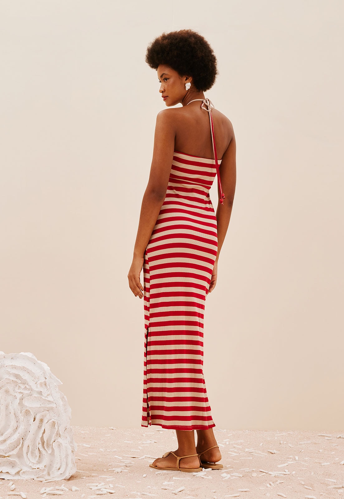 O vestido longo listrado é confeccionado em tecido 95% viscose e 5% elastano. O modelo justo ao corpo possui decote franzido com amarração no pescoço e fendas laterais.
