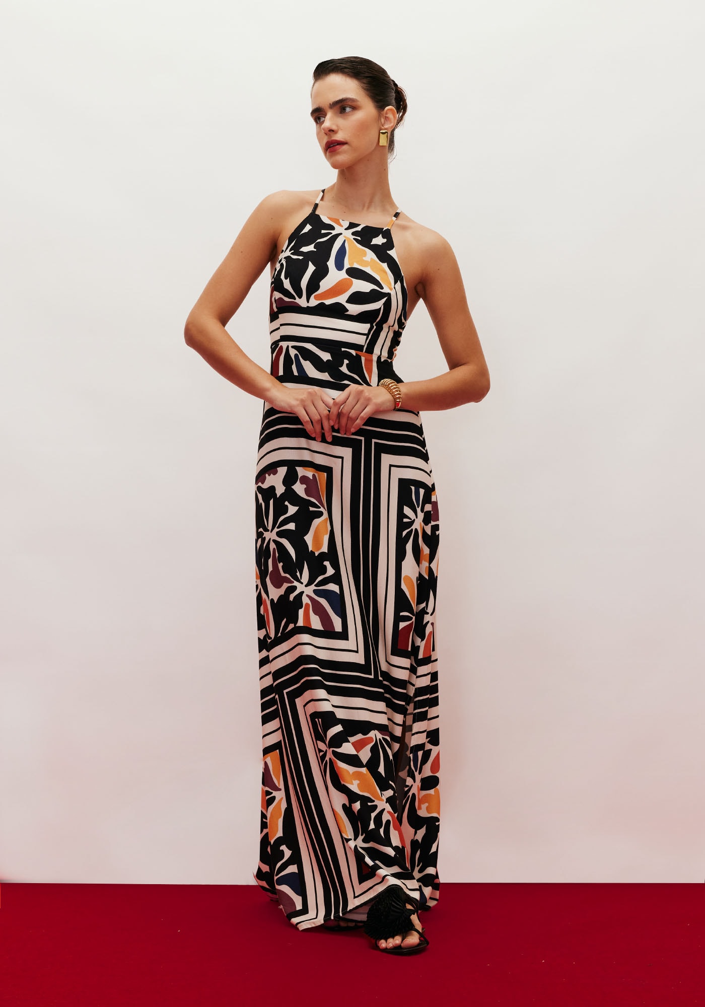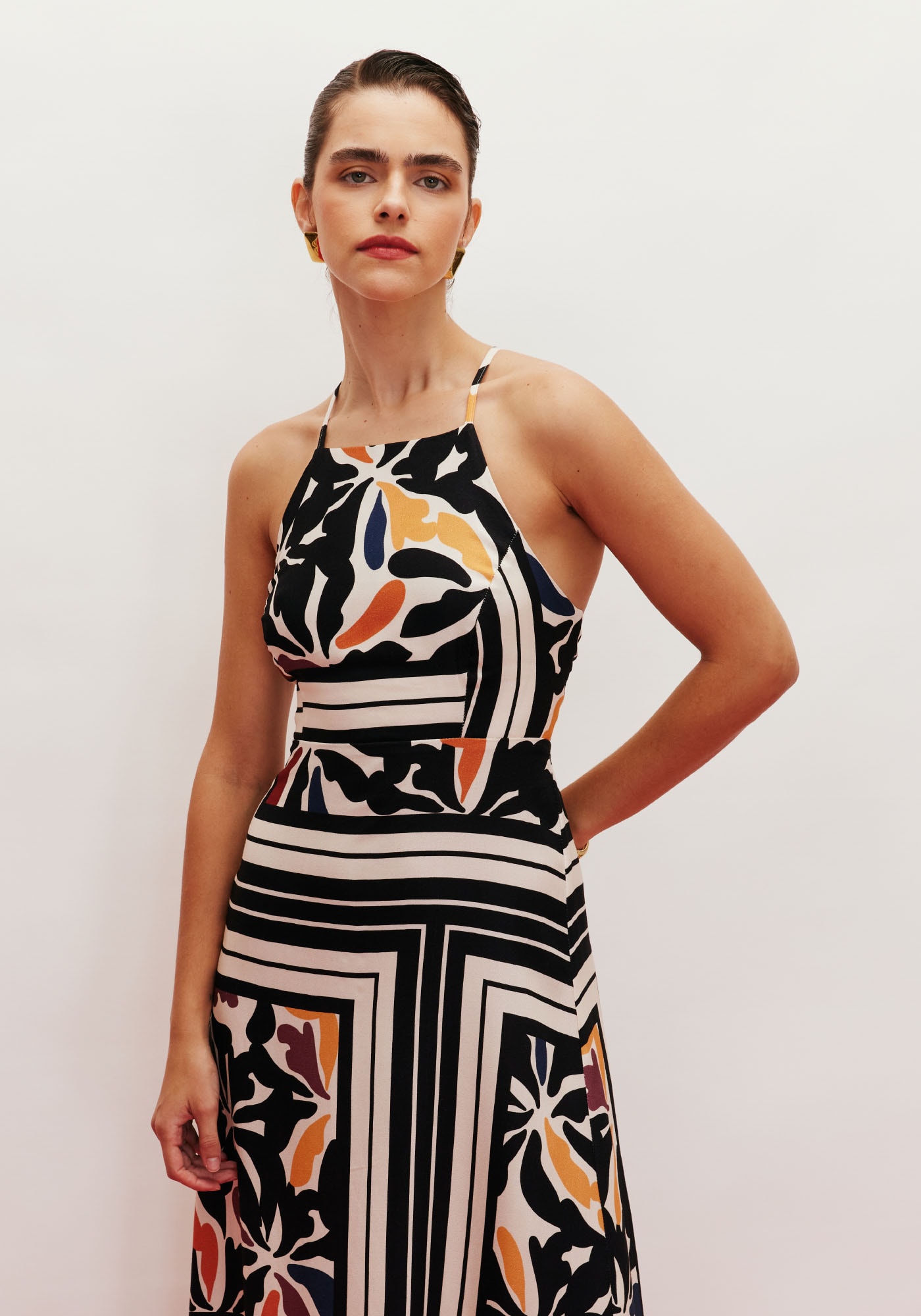Confeccionado em tecido 100% viscose com decote alto e modelagem longa, ovestido de alcinhas possui detalhe cruzado nas costas, o que adiciona umapitada de sensualidade ao modelo.A estampa Mambo é moderna e misturaelementos florais com linhas verticais e horizontais em P&B.