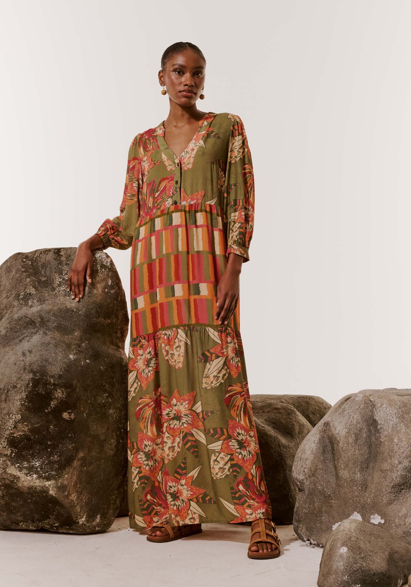 Encantador e sofisticado, estevestido longo é confeccionado com tecido 100% viscose, possui uma estampadiversificada e conta uma gola V que finaliza com três bolsos frontais. Asmangas longas com o detalhe de lastex no punho proporcionam maior conforto eliberdade de movimento. As duas marias no comprimento dão um toque especial deelegância à peça.