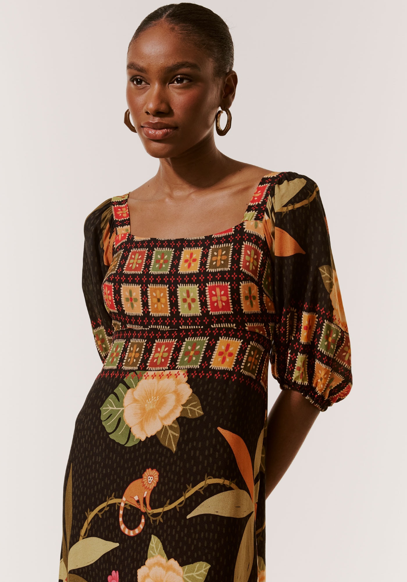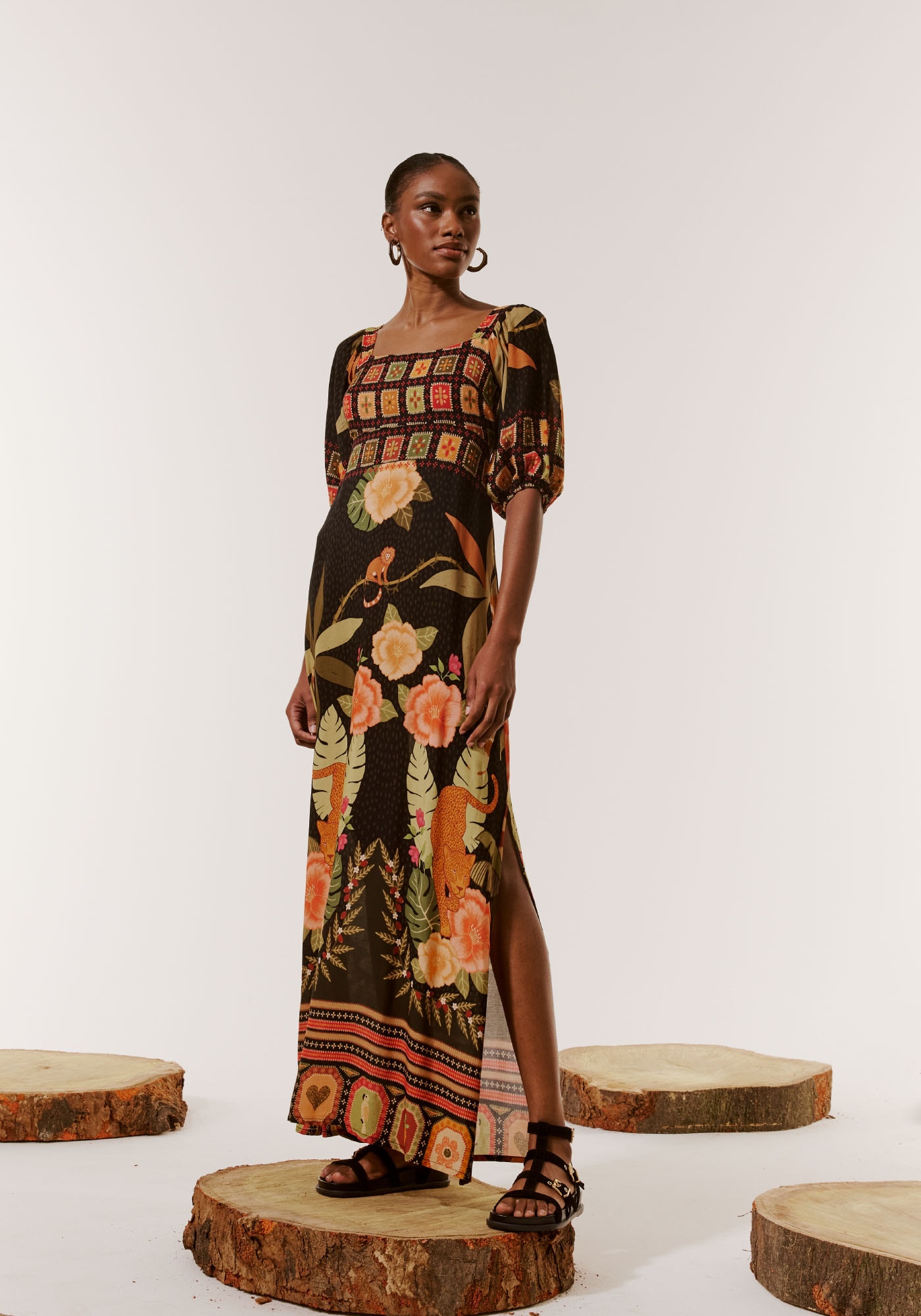 O vestido longo da Estampa Pequi é feito em tecido 100%viscose. Sua modelagem apresenta um decote quadrado, busto ajustado ao corpodevido ao lastex nas costas que confere conforto e melhor vestibilidade. Suasmangas possuem um leve franzido e a parte inferior do modelo é ampla com fendaslaterais, dessa maneira permite o movimento e caimento perfeitos. Feminino eleve este vestido é o look perfeito para diversas ocasiões.