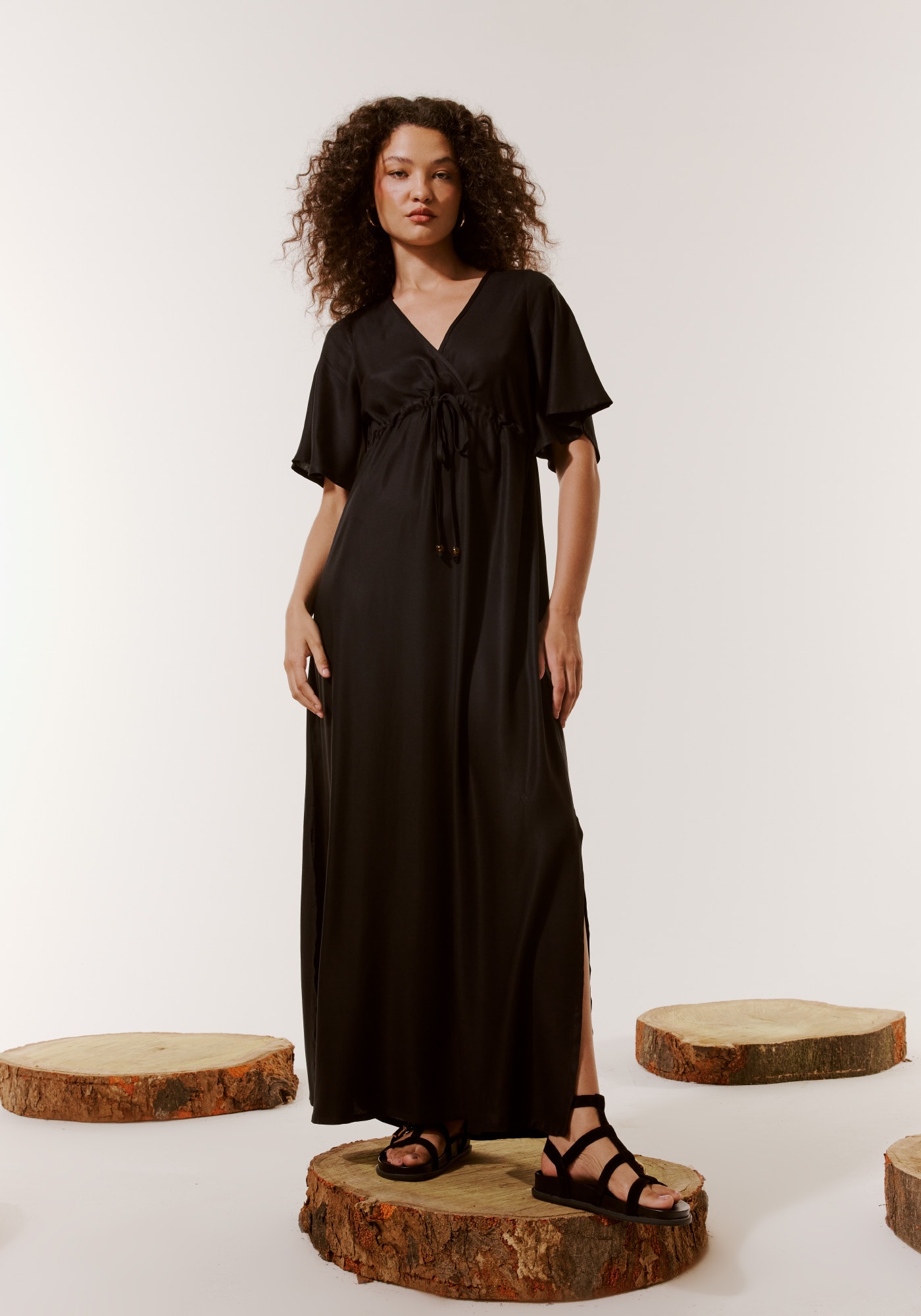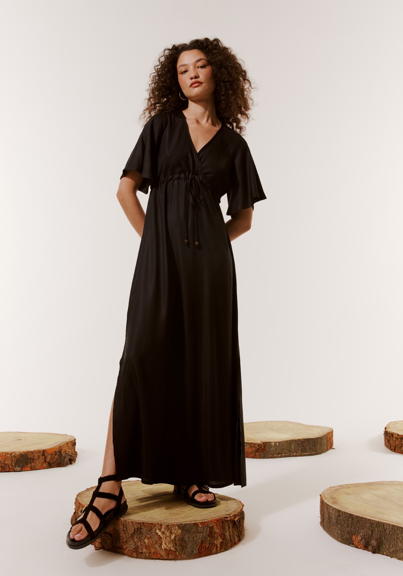 Lindo e democrático estevestido longo é confeccionado em tecido sarjado 100% viscose. Seu decote em Vlevemente transpassado valoriza o colo e é acompanhado por um túnel ajustávelabaixo do busto. Além disso, conta mangas amplas e shape solto finalizado comfendas laterais. Uma peça atemporal que veste bem com conforto e estilo.