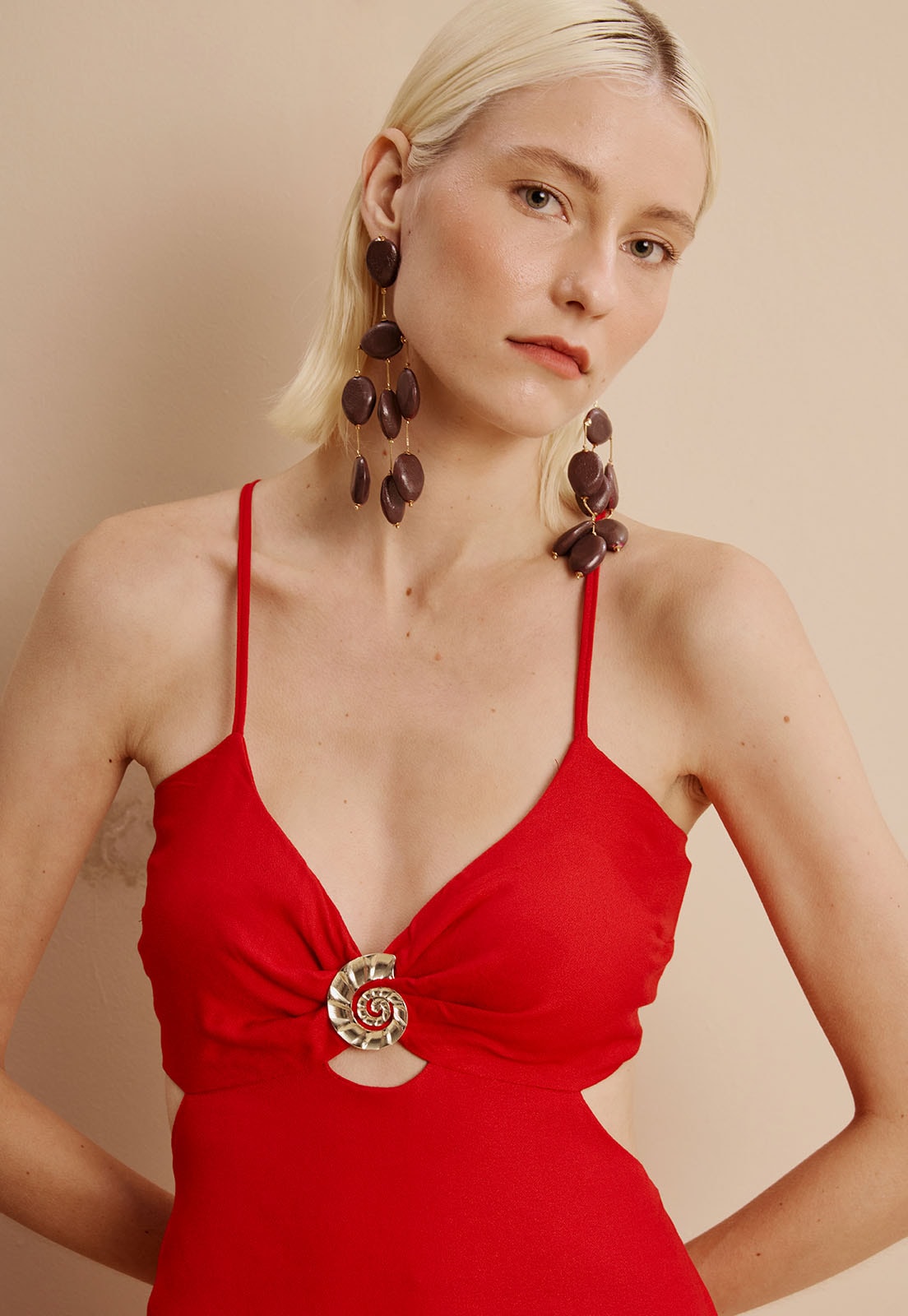 O Vestido Longo Concha Aspiral da CaCay é uma peça que traduz leveza e sofisticação em cada detalhe. Confeccionado em 100% viscose, seu caimento é fluido e confortável, ideal para quem busca elegância sem abrir mão do bem-estar. O design se destaca pelo decote em V profundo e pelas alças finas que se cruzam nas costas, revelando um delicado detalhe aberto. No centro do busto, a aplicação em espiral inspirada em conchas adiciona um toque artístico e atemporal, enquanto a saia longa com leve franzido na altura dos quadris garante movimento e charme a cada passo.