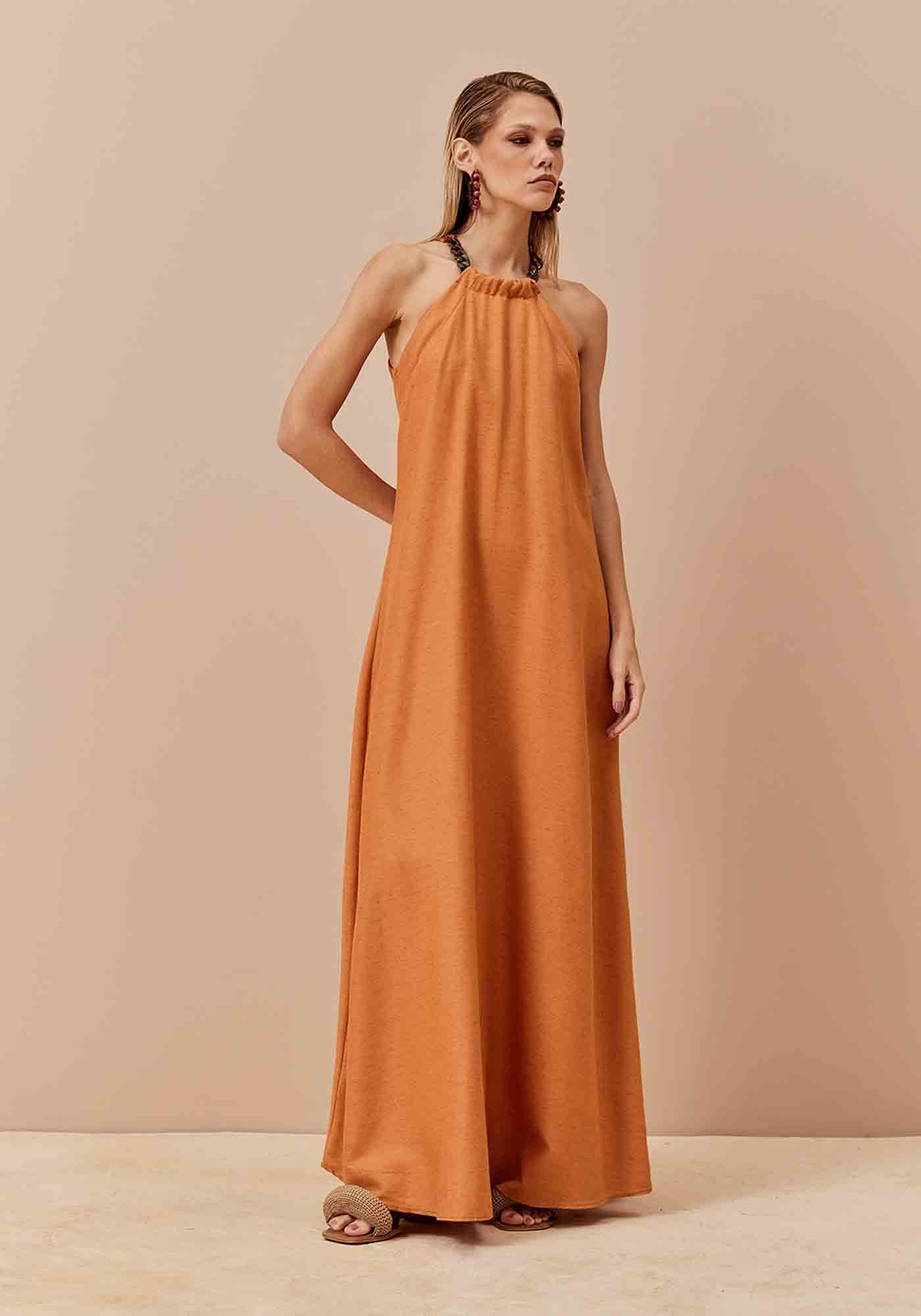 Esse Vestido Longo é a escolha perfeita paraquem adora um look impactante e elegante. O tecido 50% Algodão, 29% Viscose,15% Modal e 6% Linho, proporciona um caimento sofisticado. A corrente nopescoço, que possui amarração na parte das costas, traz um toque de modernidadeao visual enquanto a saia ampla oferece liberdade e movimento.