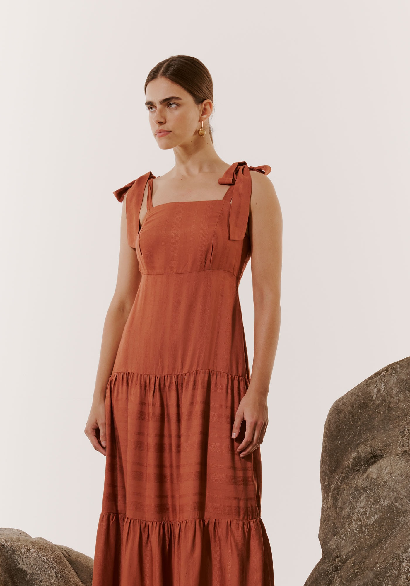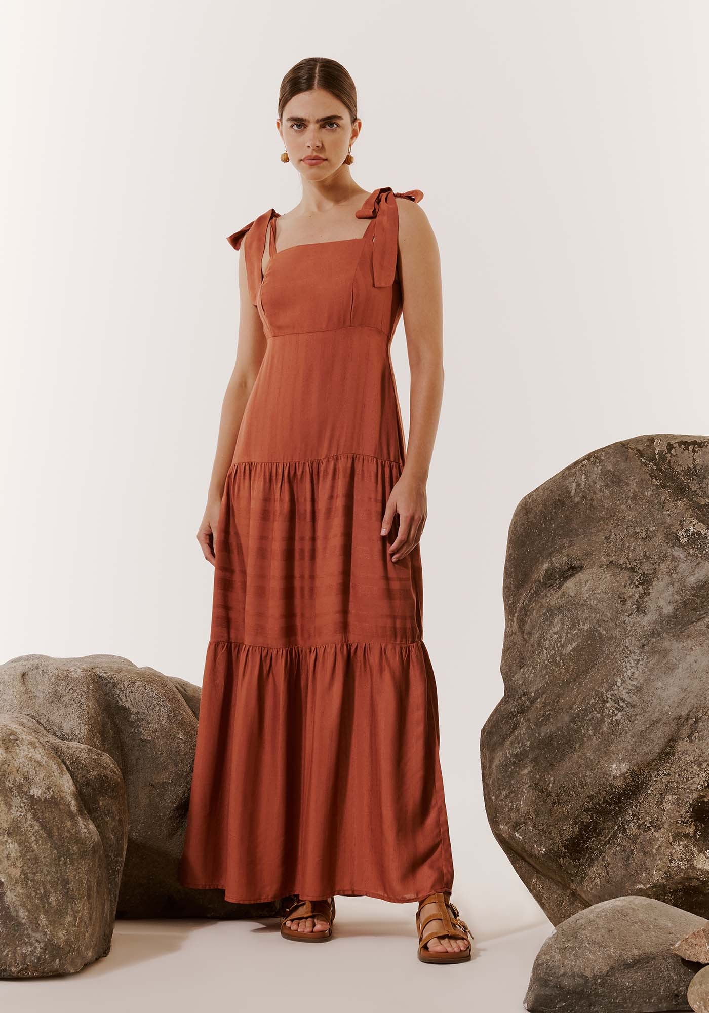 Confeccionado em 97% viscose e3% linho, o vestido longo liso é uma peça chave no guarda-roupa e combina comdiferentes ocasiões. O modelo é democrático e possui amarração nos ombros, alémdo lastex nas costas, detalhes que facilitam a vestibilidade. As marias aolongo do comprimento dão movimento e volume para o modelo.