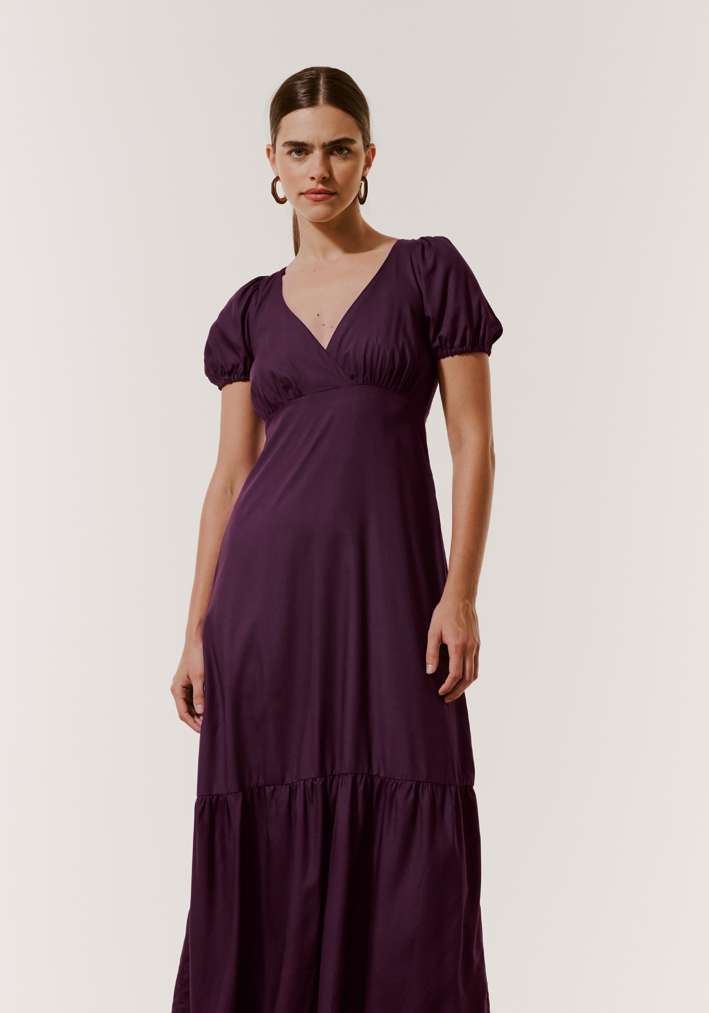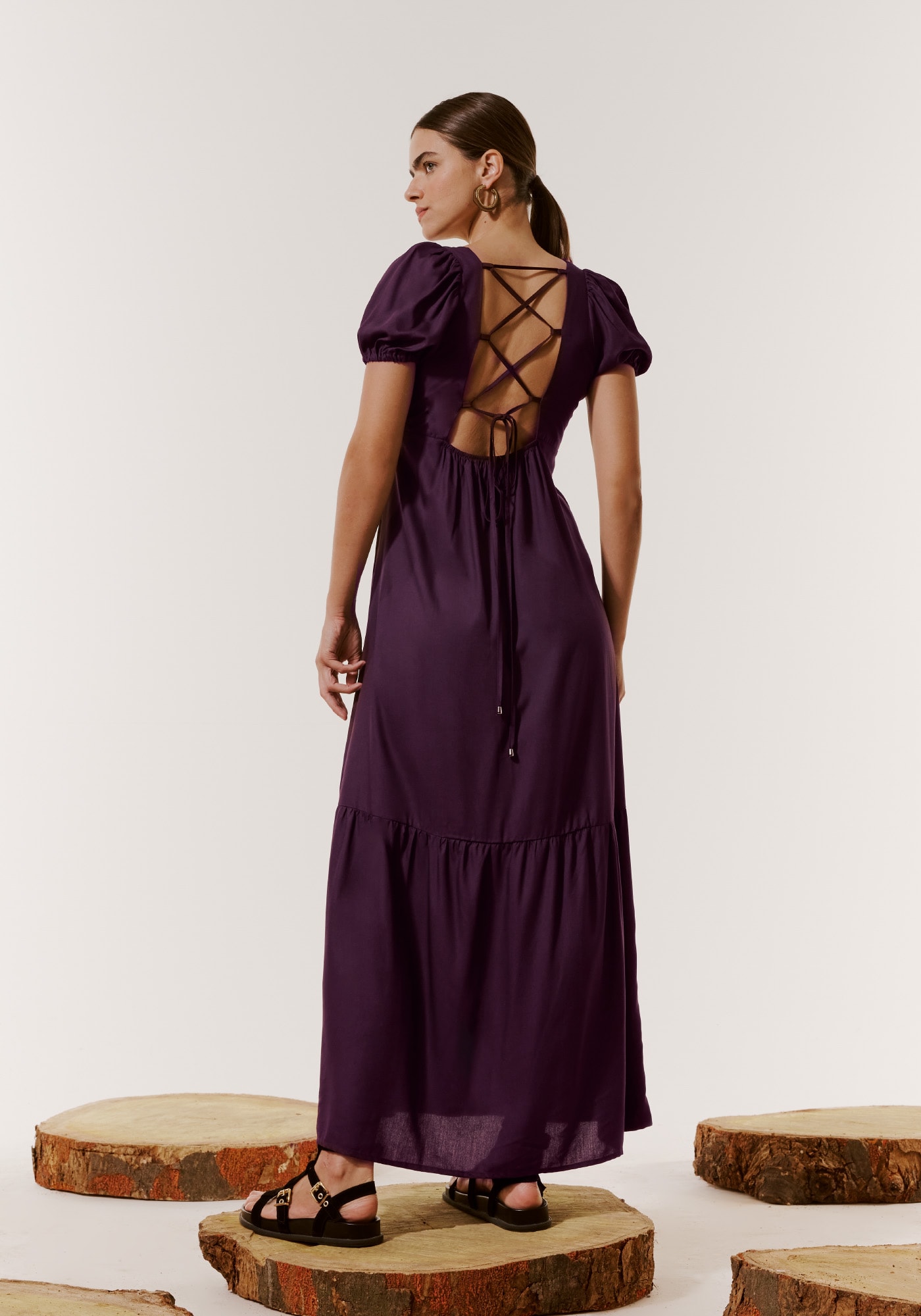Esse modelo é encantador. Com decote profundo em V emanguinha curta bufante, possui modelagemmais ampla e maria, que dão movimento e volume ao vestido. O toque final fica porconta da amarração cruzada nas costas finalizada com ponteiras.