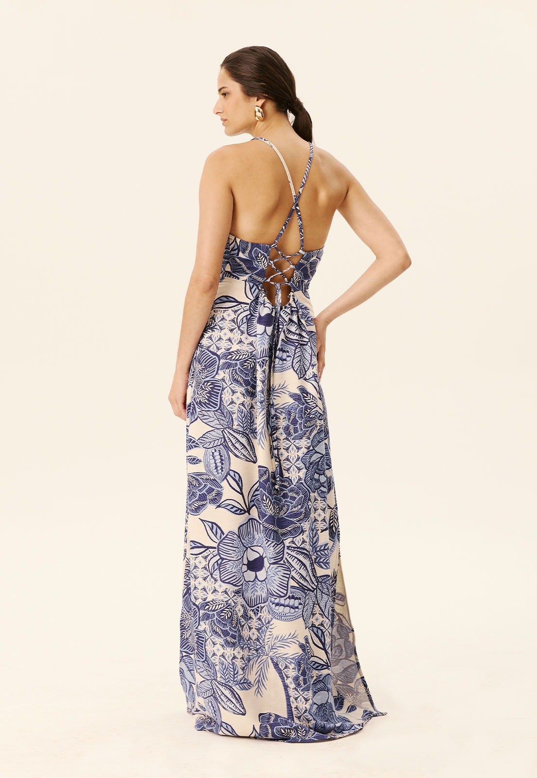 O Vestido Longo Decote Alto Aselha Estampado Melodia da CaCay é a expressão do equilíbrio entre sofisticação e leveza. Com alças finas cruzadas nas costas e um decote alto que valoriza o colo com elegância, seu design destaca a silhueta com uma modelagem ajustada na parte superior e uma saia fluida que desce até o chão. A estampa melódica em floral detalhado, distribuída por todo o tecido, confere um toque artístico e atemporal à peça, ideal para quem busca estilo com personalidade. A abertura lateral sutil na saia adiciona movimento e charme ao caminhar, tornando-o perfeito para ocasiões especiais, jantares ao ar livre ou eventos diurnos.