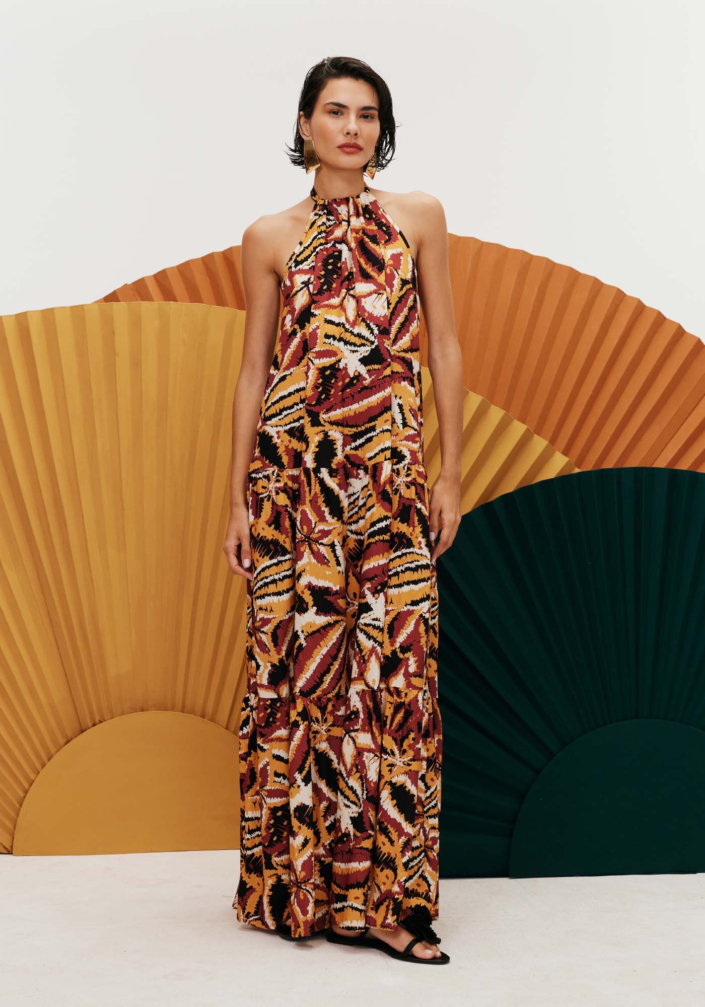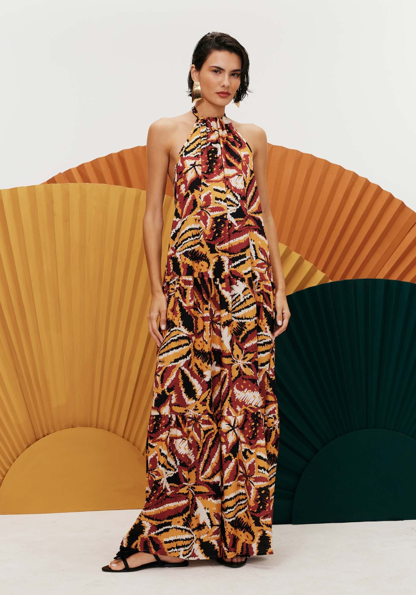 Confeccionado em tecido100% viscose, o vestido é belo e exuberante. Modelo longo, a peça possui decotealto com amarração em túnel na parte de trás e um decote nas costas. As mariasno comprimento adicionam o movimento ideal para a peça.