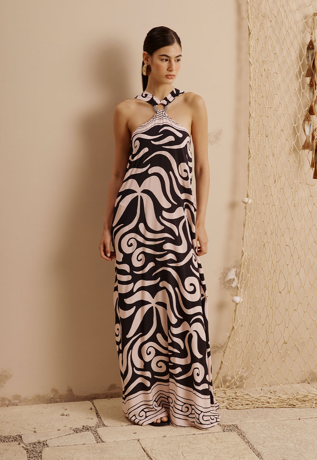 O Vestido Longo Decote Argola Corda Liso Estampado Pororoca da CaCay é a expressão perfeita de leveza e sofisticação atemporal. Com design fluido e caimento solto, ele valoriza a silhueta sem marcar, oferecendo conforto absoluto graças à composição 100% viscose. O decote com argola e corda cria um visual moderno e delicado, enquanto a estampa com ondas abstratas adiciona movimento e personalidade à peça. O detalhe de amarração nas costas com efeito franzido complementa o charme do vestido, tornando-o ideal para eventos ao ar livre, jantares à beira-mar ou passeios em dias ensolarados.