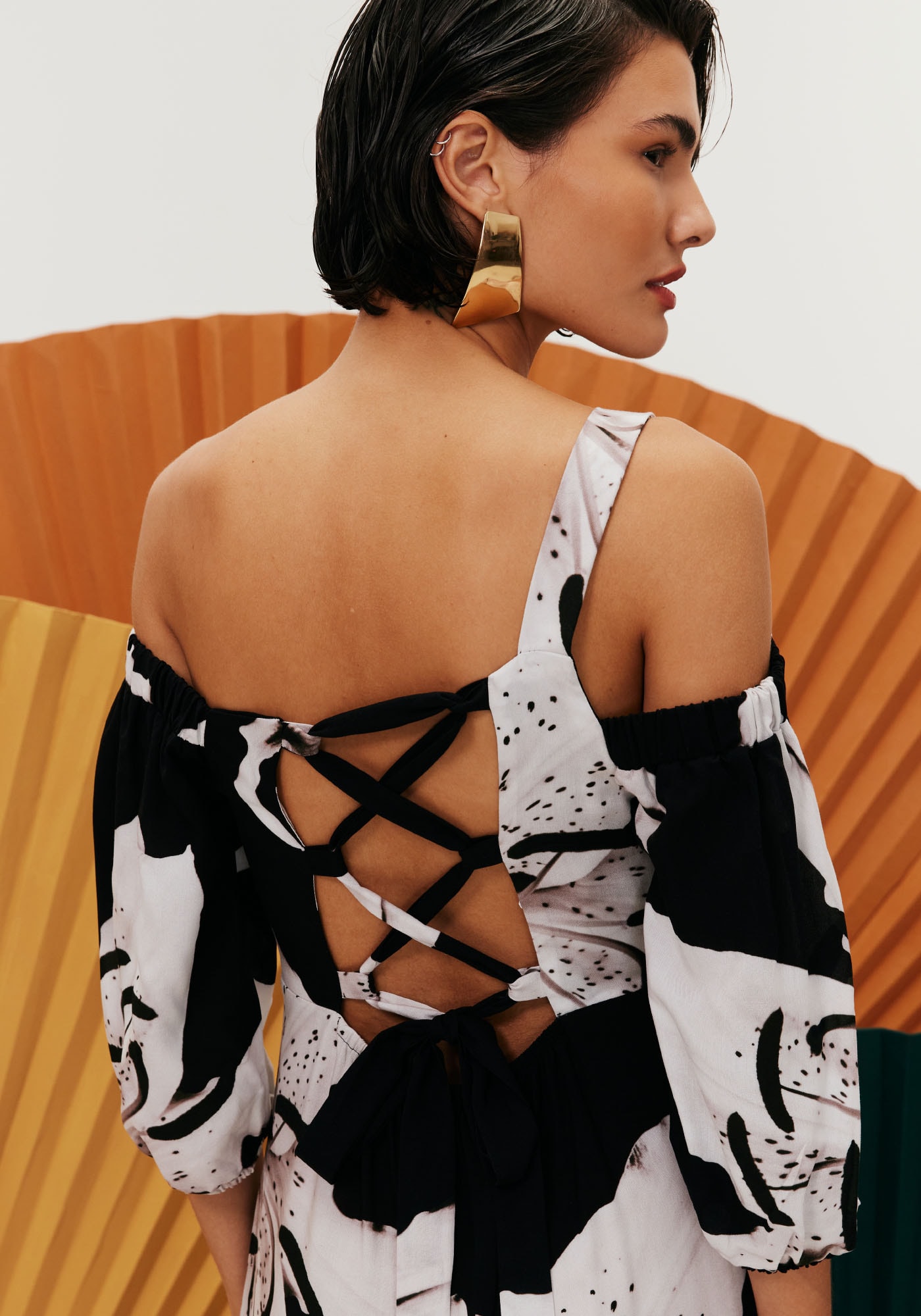 O vestido estampado Tangoé um modelo maravilhoso. O modelo de um ombro só possui decote assimétrico e asalças caídas com lastex, que dão um charme a mais para peça. As costas comdecote cruzado são o toque de sensualidade. A estampa Tango em P&B não temerro, é sofisticada e clássica.