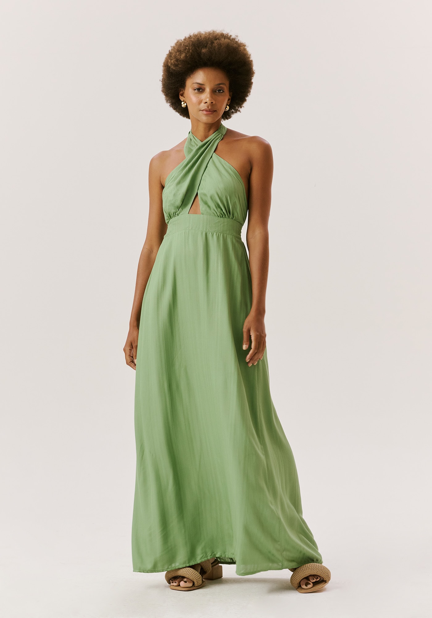 O vestido longo liso é um modelo elegantee sofisticado. Confeccionado em tecido 100% viscose, a peça possui um decotecruzado frente única super chique e pala abaixo do busto. A parte das costaspossui elástico, facilitando a vestibilidade. O modelo possui o shape decaimento fluído e leve.
