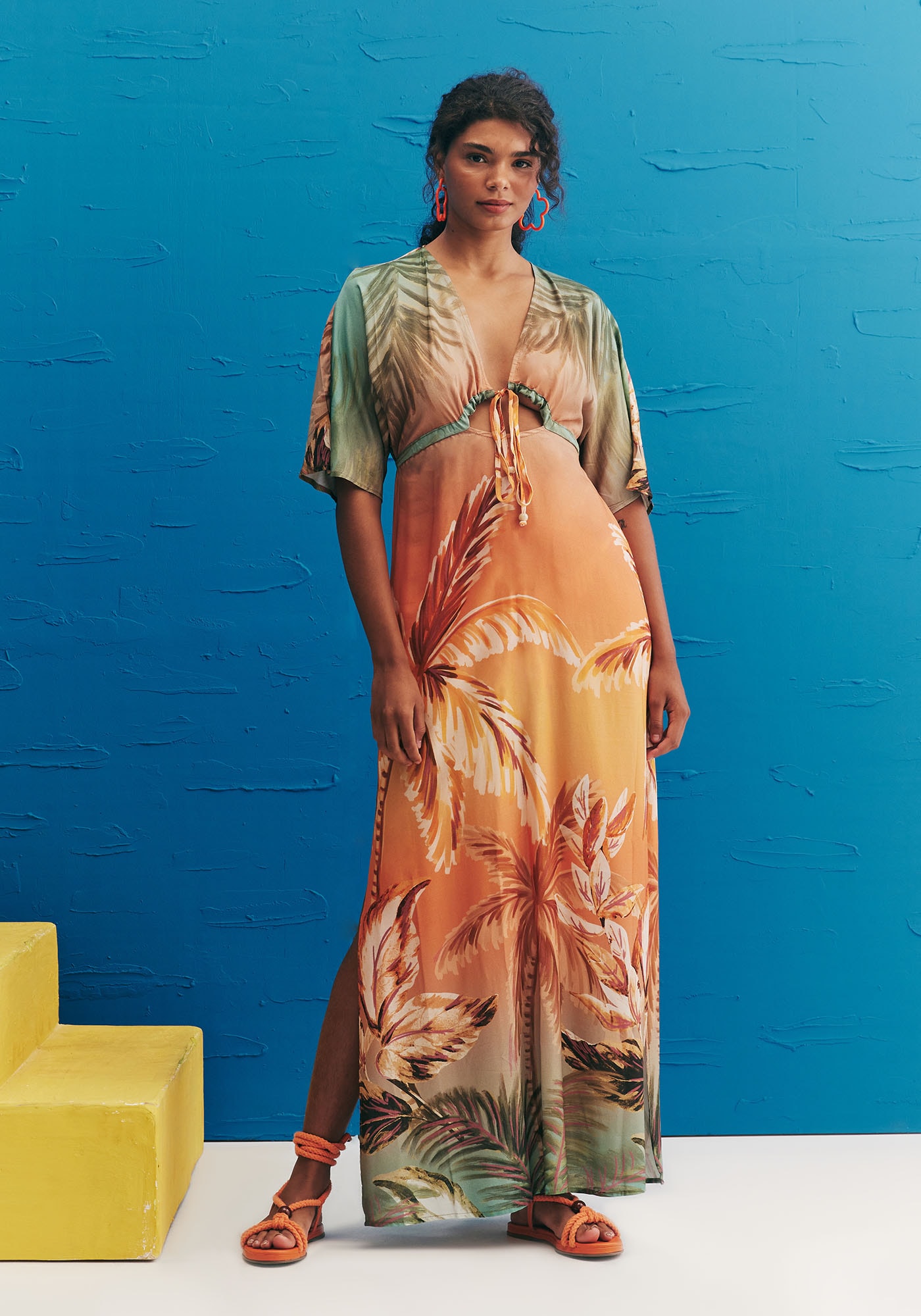 O belíssimo Vestido Longo Decote C/ Túnel EstampadoTrancoso é um modelo único, despojado e que transmite estilo. Com um decotefrontal em V, ele destaca o busto de forma elegante, enquanto o com amarraçãoabaixo do busto que proporciona um ajuste perfeito ao corpo realçando a suasilhueta. As mangas amplas conferem um toque sofisticado e feminino, além dissoo modelo apresenta recorte na parte frontal abaixo do busto que acrescenta umtoque ousado e diferenciado. Sua saia evasêtransmite fluidez e leveza e possui fendas laterais que trazem liberdade de movimento.Seu tecido é de composição 100% viscose.