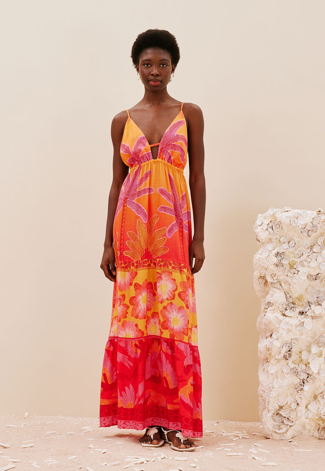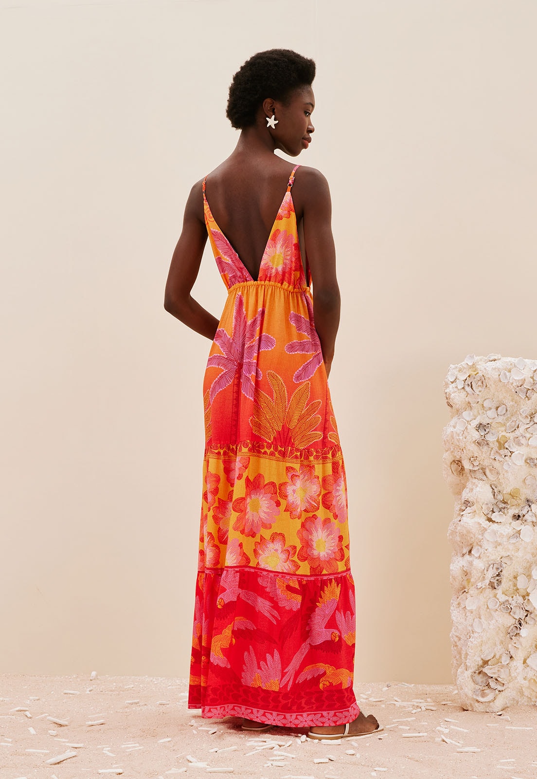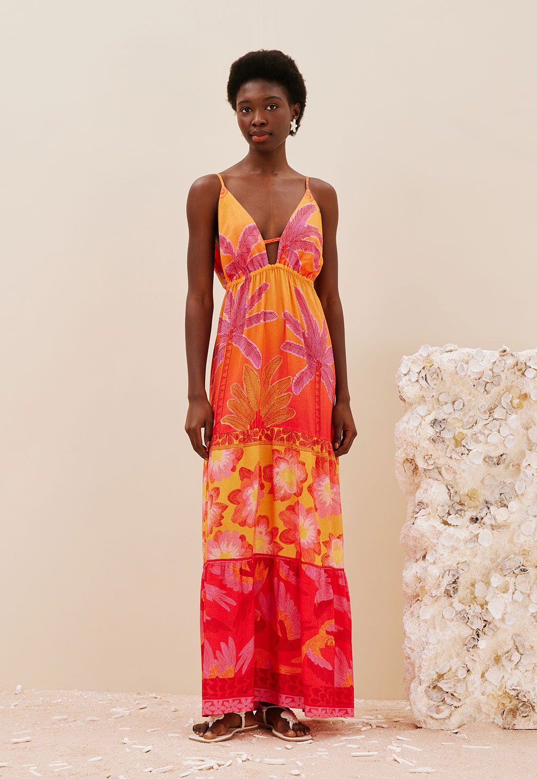 O vestido longo estampado Praia das Bordadeiras é confeccionado em tecido 100% viscosee possui decote profundo com elástico no busto. A modelagem possui marias ao longo do comprimento, que dão volume e movimento ao vestido.