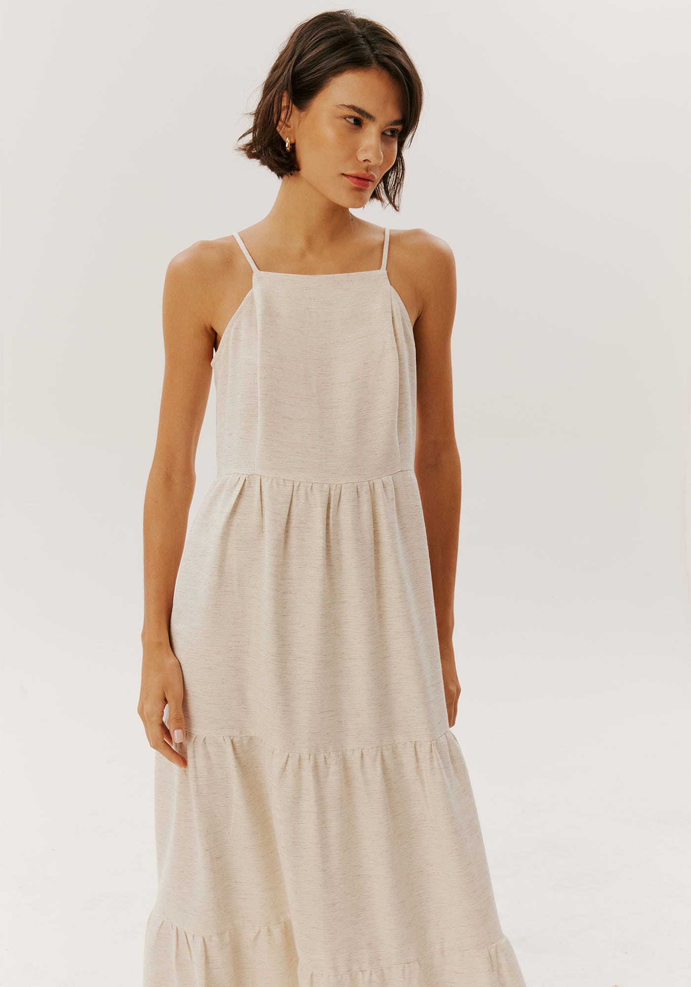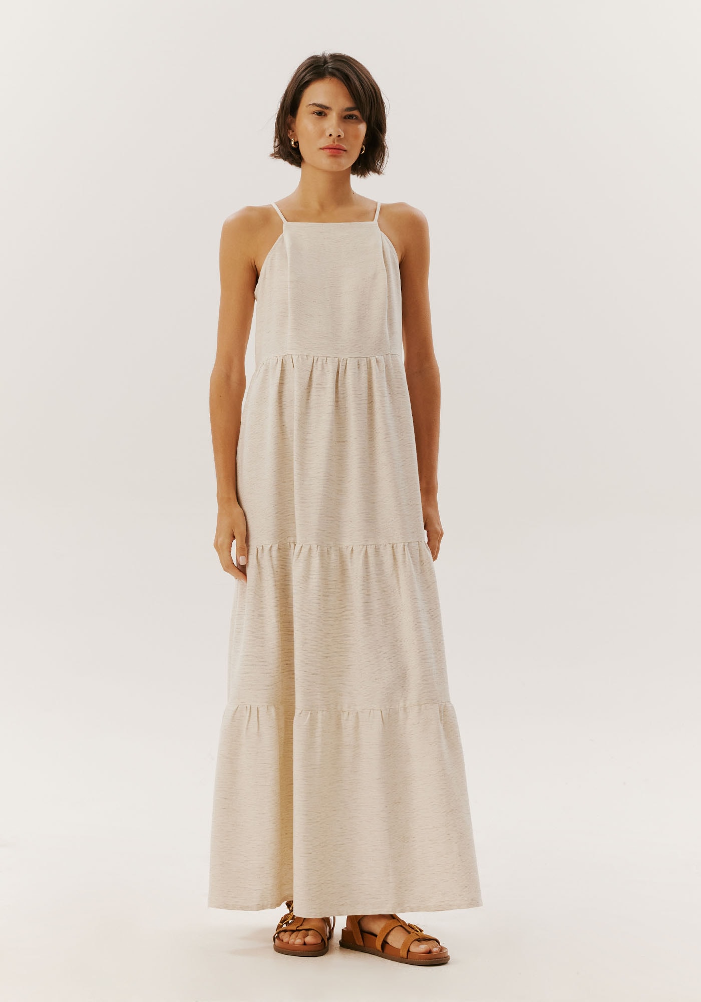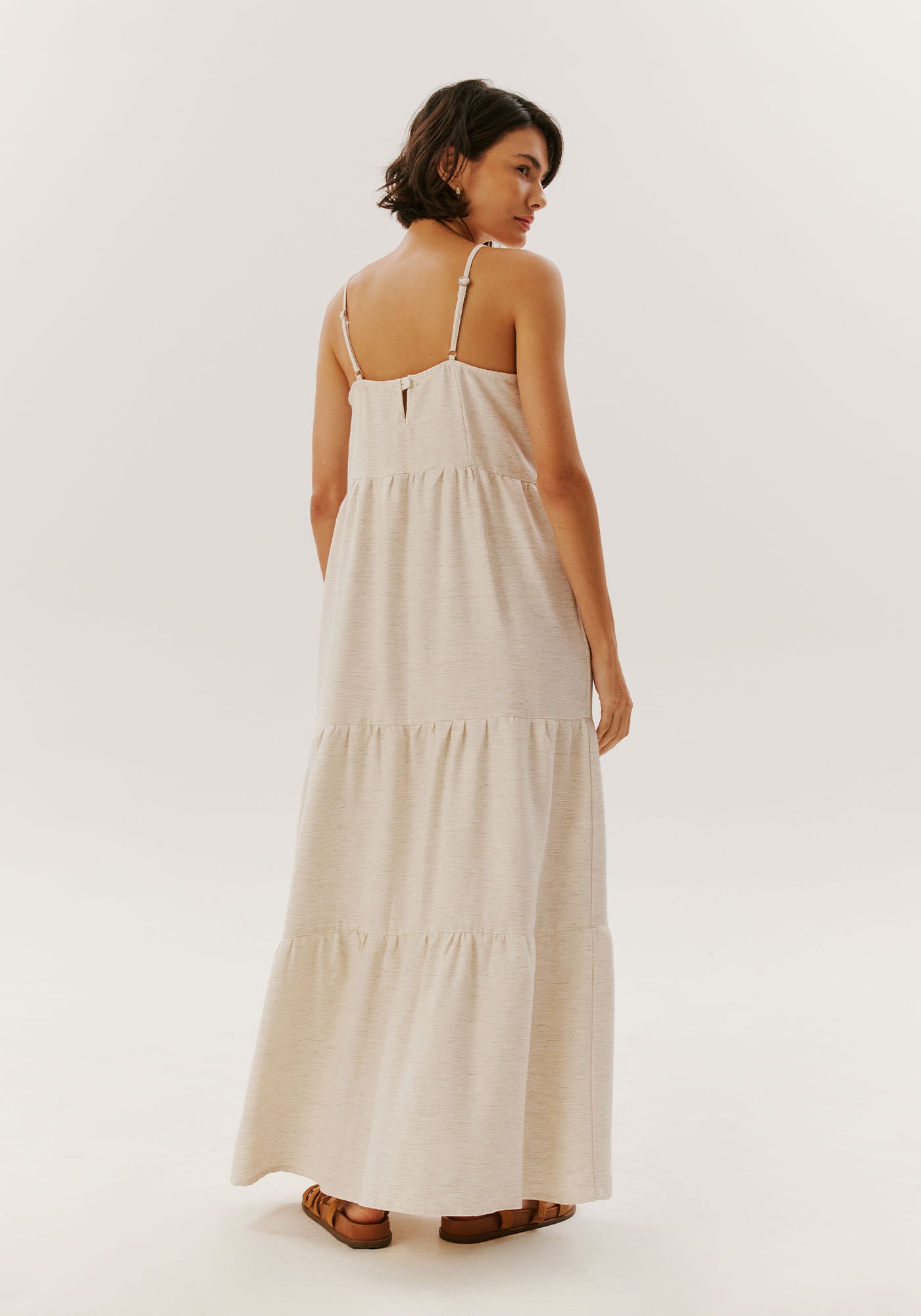 Elegante e fresco, o vestido longo de viscolinho destaca-sepelo busto ajustado e comprimento amplo. O decote reto confere um toqueclássico, enquanto as alças finas com reguladores oferecem um ajustepersonalizado. O fechamento na parte posterior com detalhe de botão adicionacharme extra. Com marias no comprimento, esta peça é uma escolha sofisticadapara diversas ocasiões, combinando estilo e conforto de maneira única.