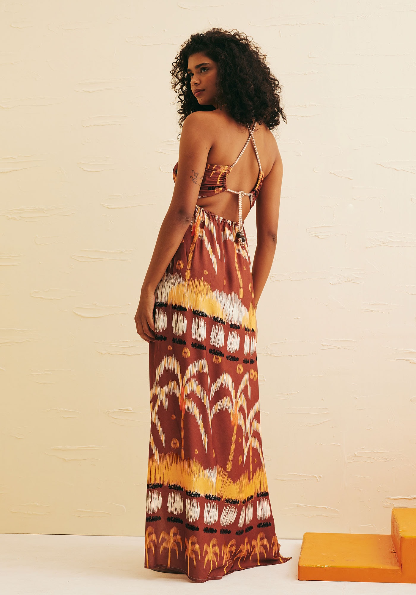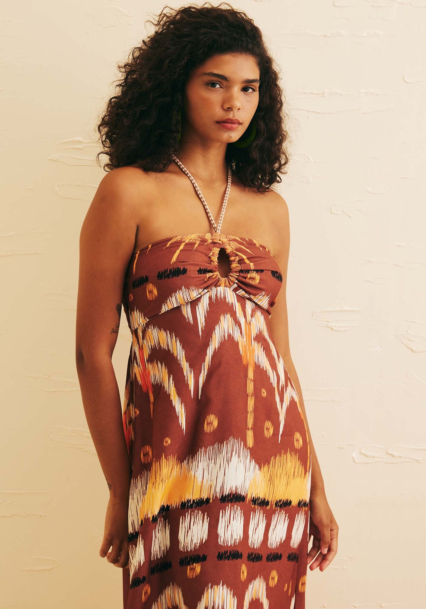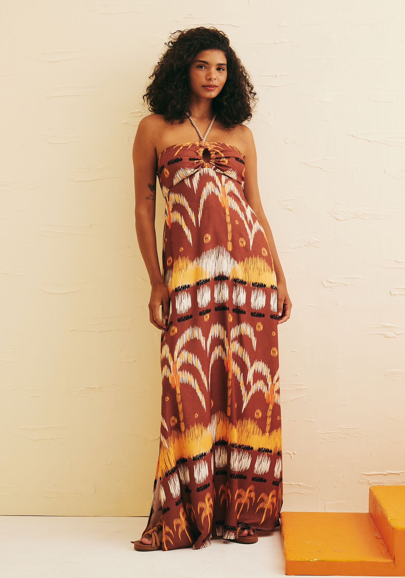 Confeccionado em tecido 100%viscose, o vestido longo estampado é a cara do verão. O modelo possui decote emtúnel franzido com amarração em corda no pescoço. A modelagem confortávelvaloriza a silhueta.