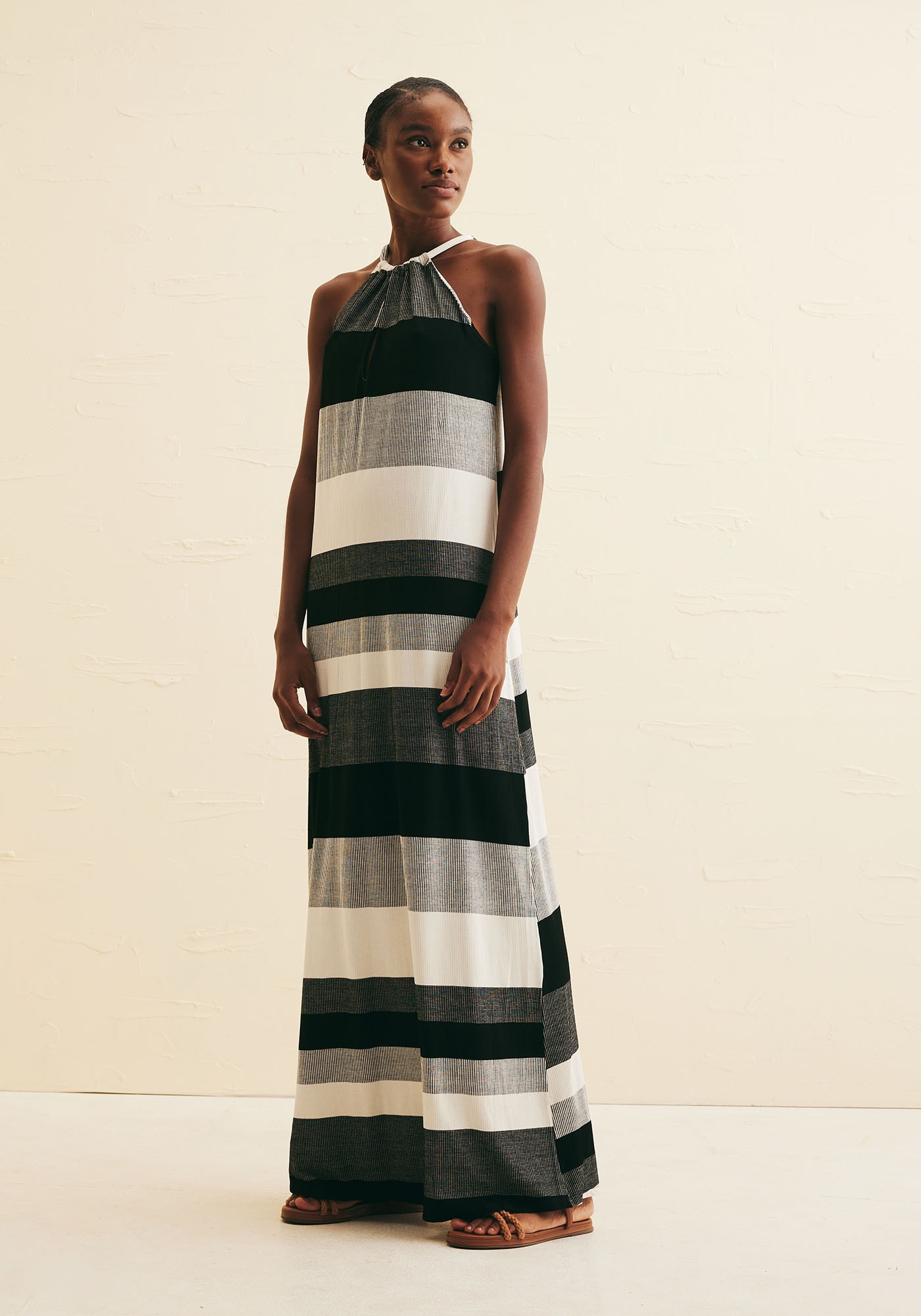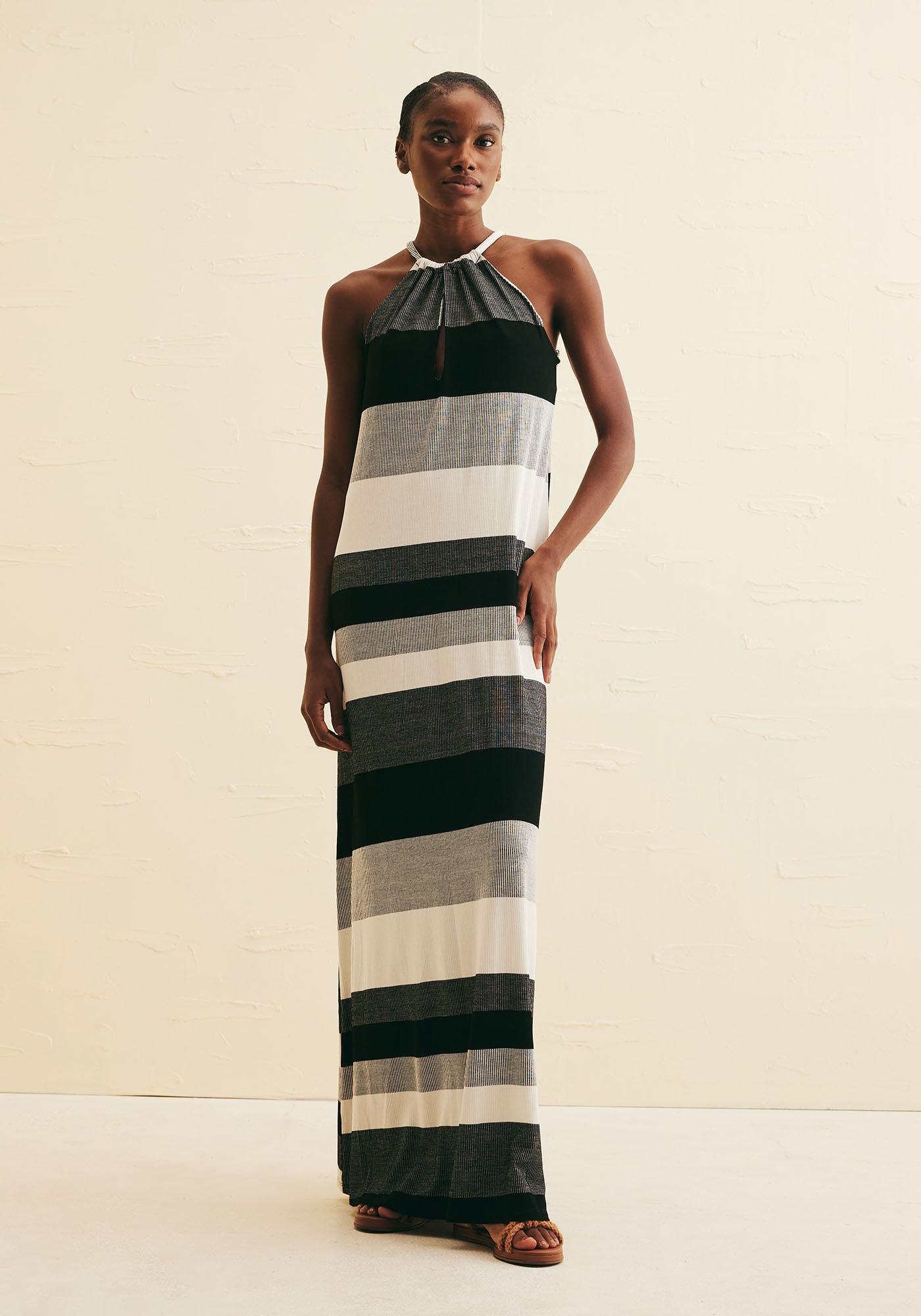 Se você busca umapeça que proporcione modernidade e sofisticação, este vestido longo de listrasem malha é indispensável em seu guarda-roupas. Possui decote alto de amarraçãoem túnel e modelagem mais solta, e sua composição em 95% viscose e 5% elastanoproporcionam um caimento ideal e muito conforto.