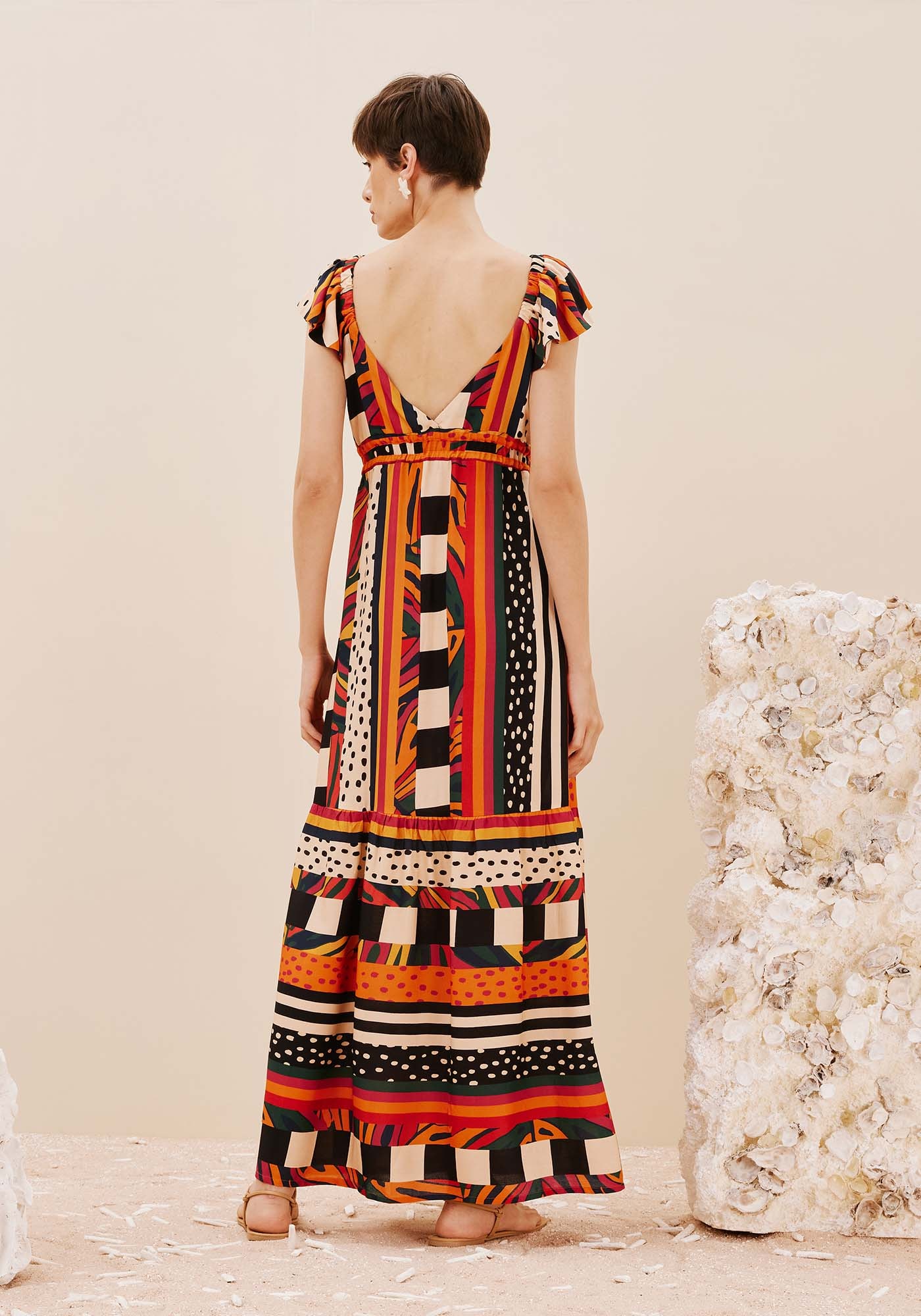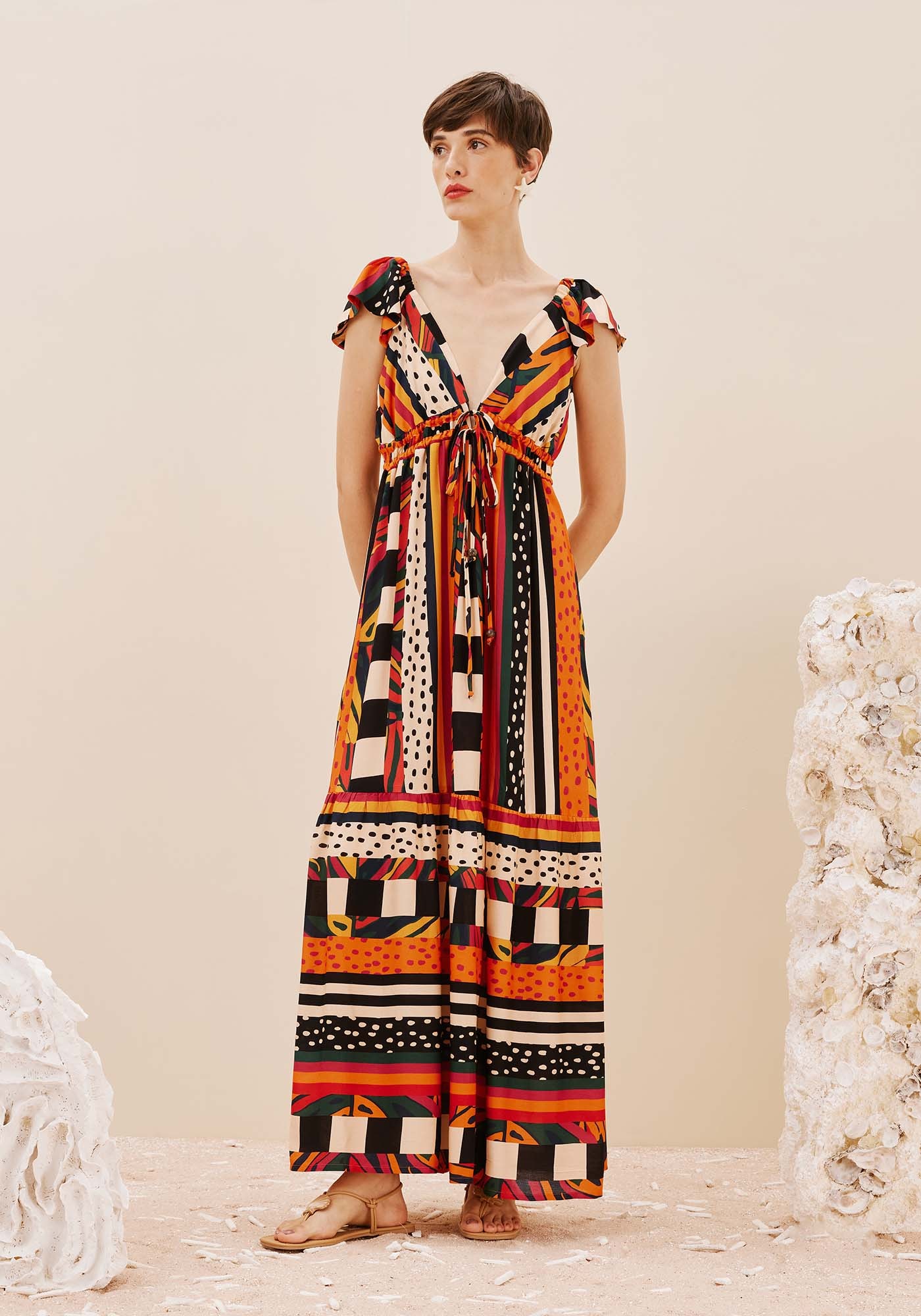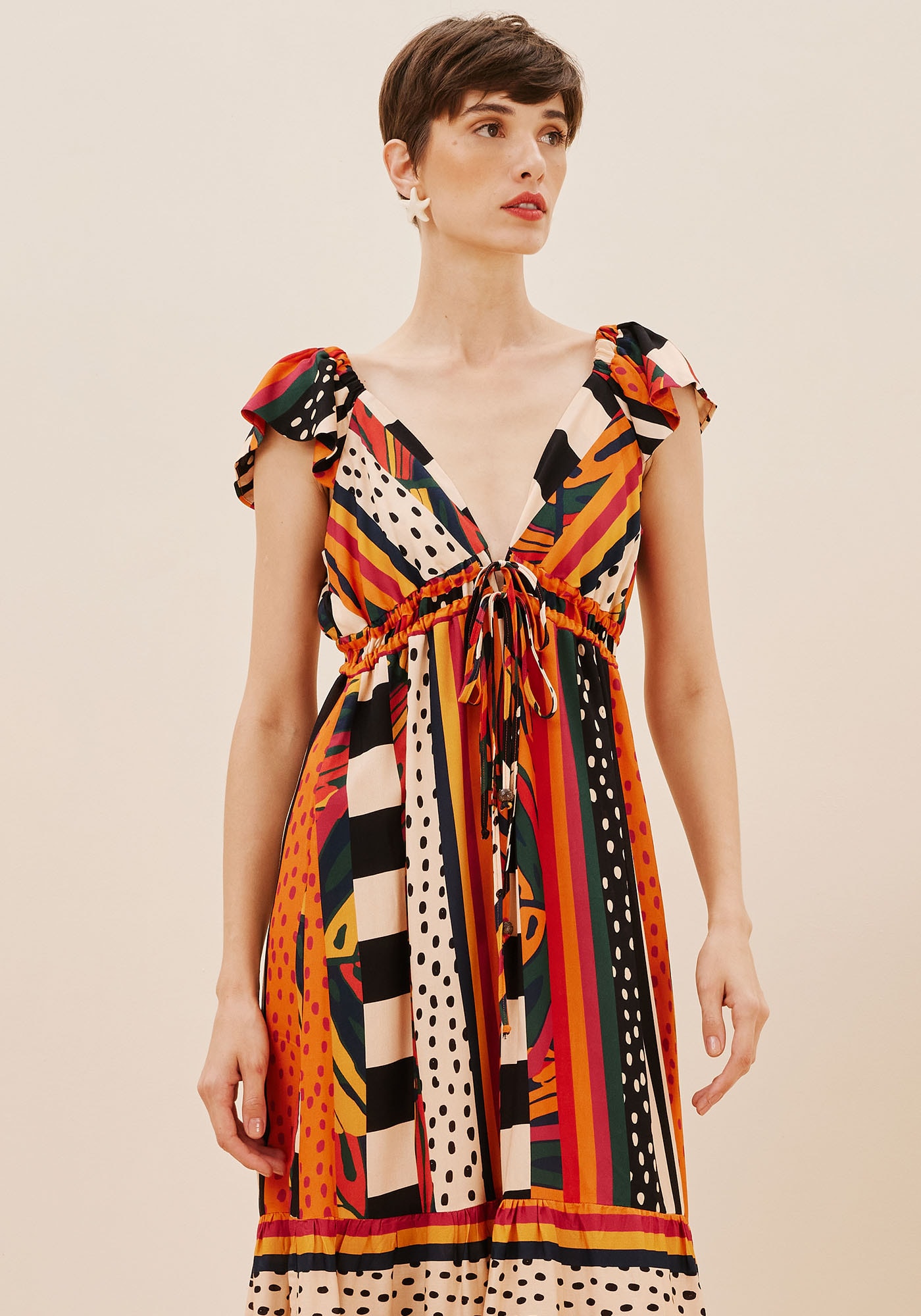 Com decote charmoso de ajuste emtúnel de amarração abaixo do busto, este vestido combina elegância,feminilidade e conforto. A saia evasê com uma maria proporciona leveza efluidez, enquanto o decote em V nas costas adiciona um toque de sensualidade.As mangas curtas trazem mais romantismo para a peça. Confeccionado em 100%viscose, ele se destaca pela estampa Terra que complementa o visual de formaúnica.
