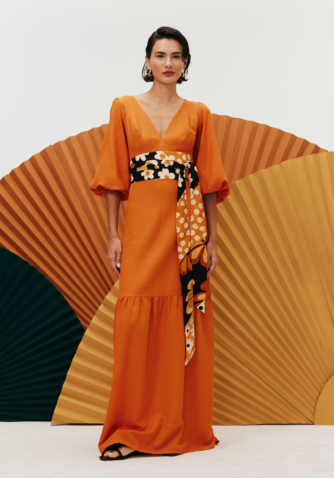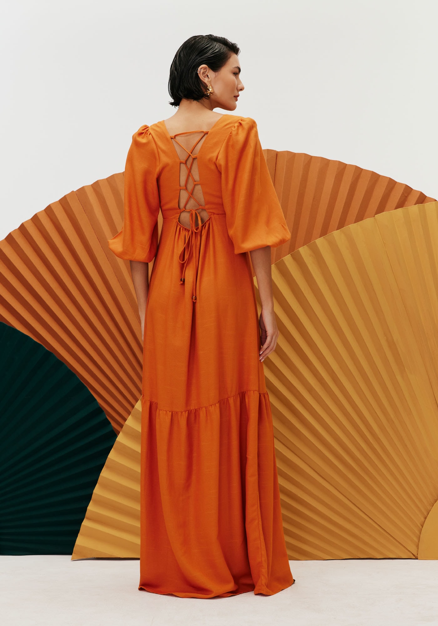 O vestido longo é uma peça chique esofisticada. Confeccionado em tecido 61% viscose e 39% algodão, possui decoteem V com manga ¾. As costas possuem decote cruzado finalizado com ponteiras.