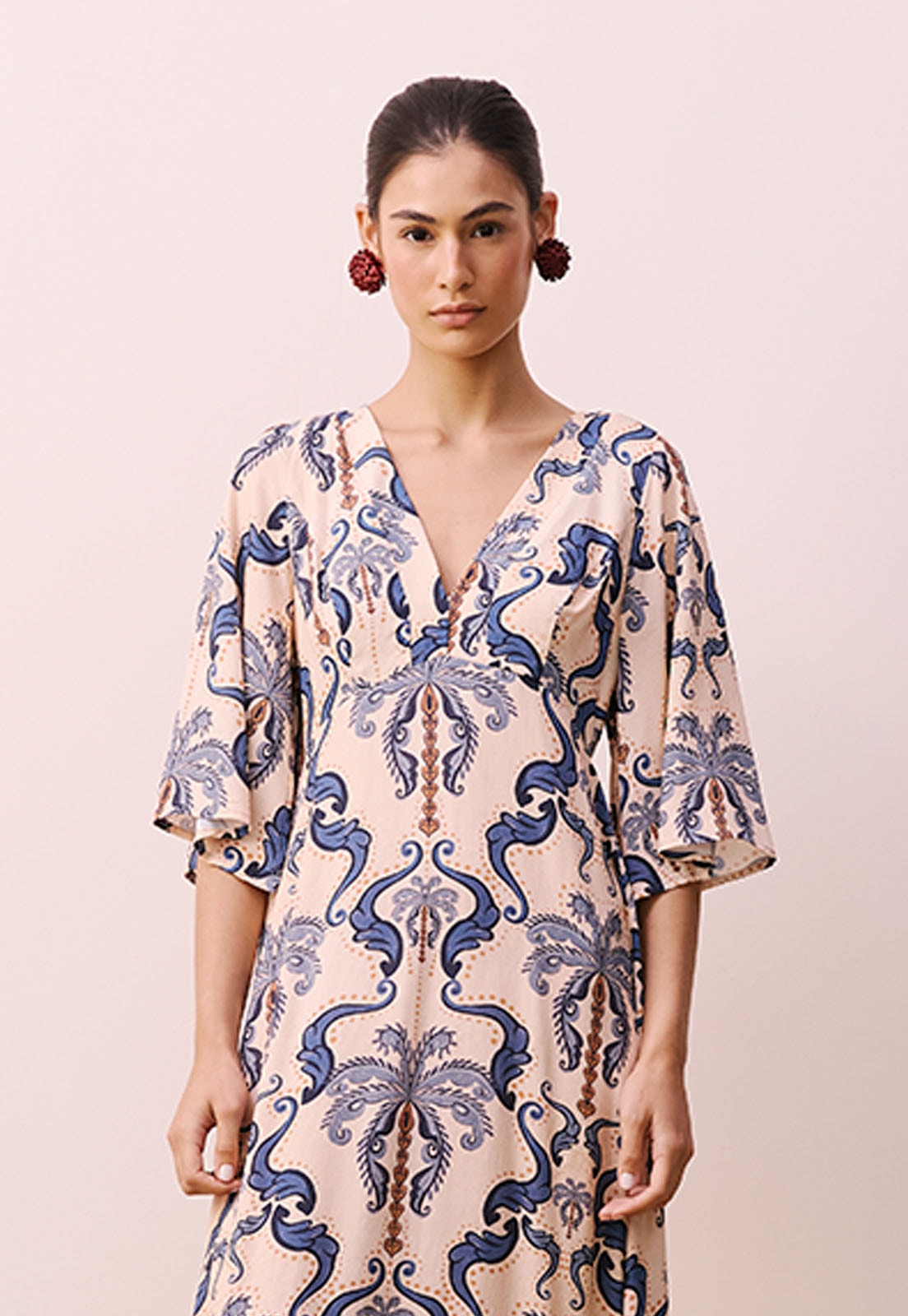 O Vestido Longo Decote V Estampado Baldosas da CaCay é a escolha perfeita para quem busca sofisticação com leveza. Confeccionado em 100% viscose, seu caimento fluido valoriza os movimentos com naturalidade, enquanto o decote em V e as mangas amplas até os cotovelos trazem equilíbrio entre elegância e conforto. A estampa em padrão Baldosas, com desenhos simétricos e intrincados, adiciona um toque artístico e atemporal à peça, ideal para ocasiões que pedem estilo sem esforço de eventos diurnos a jantares especiais.