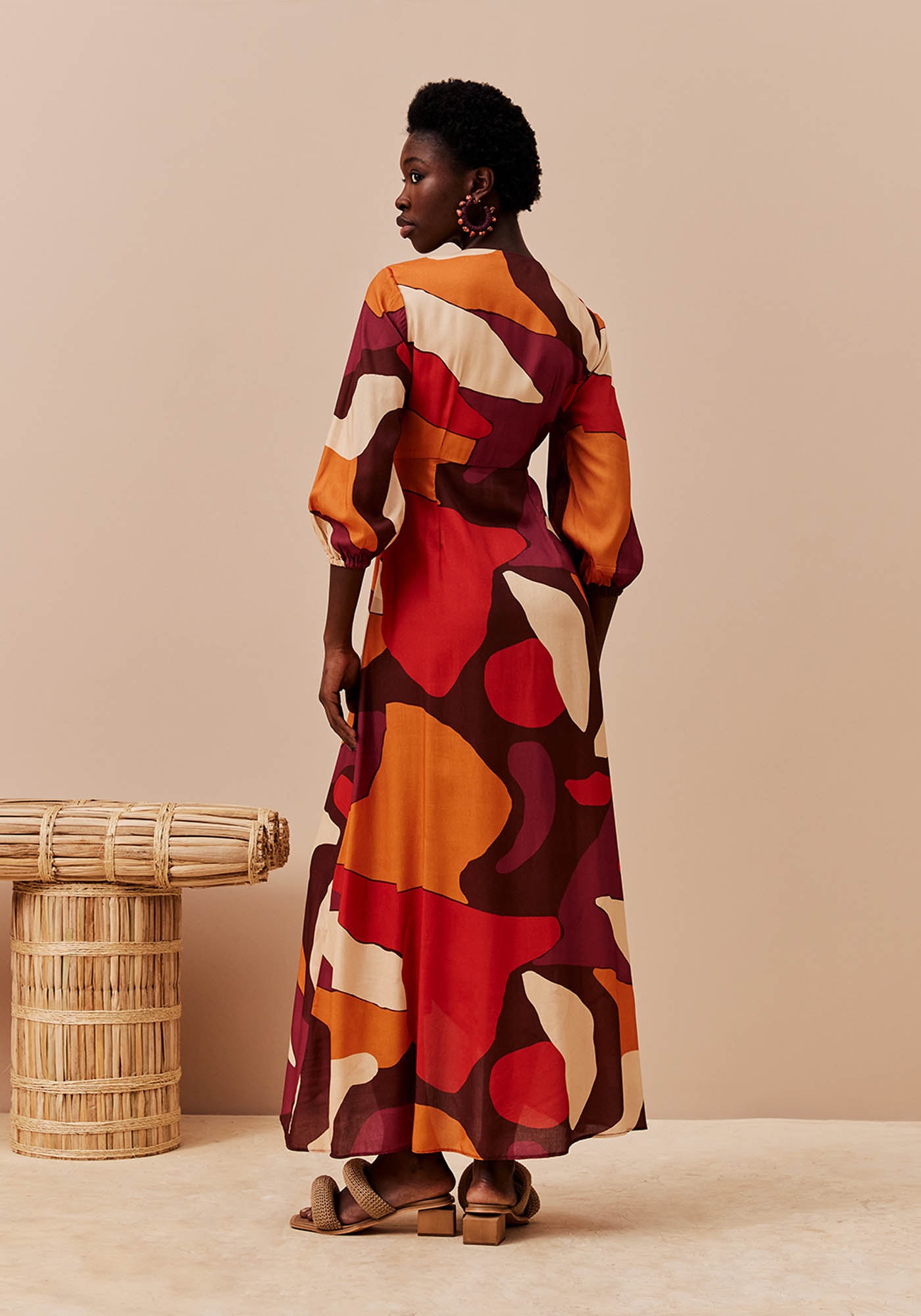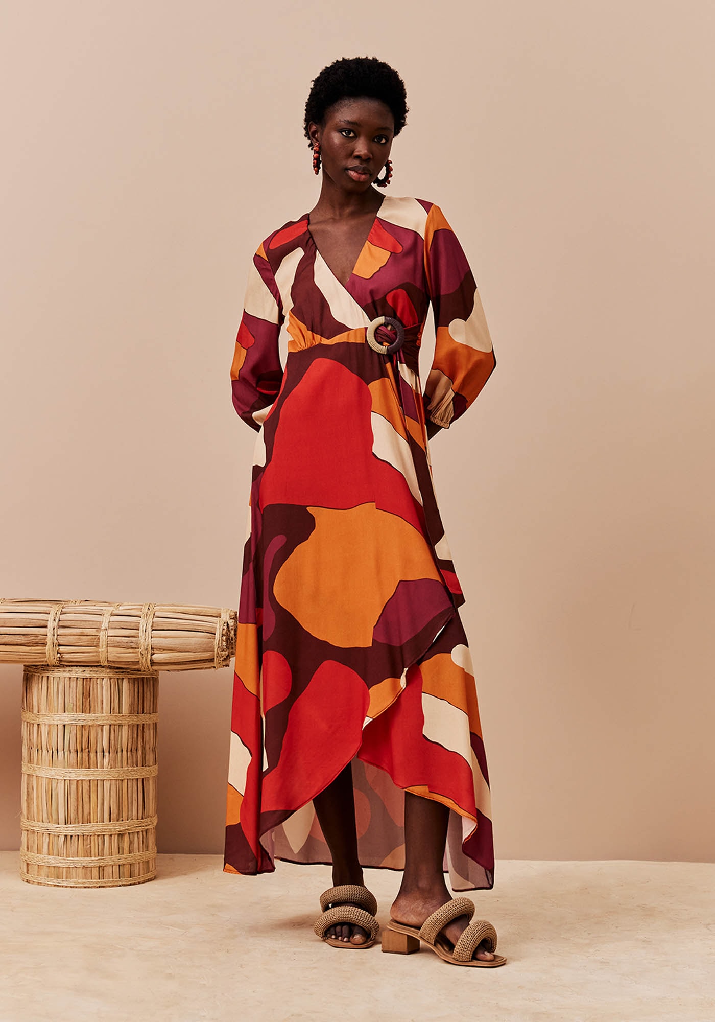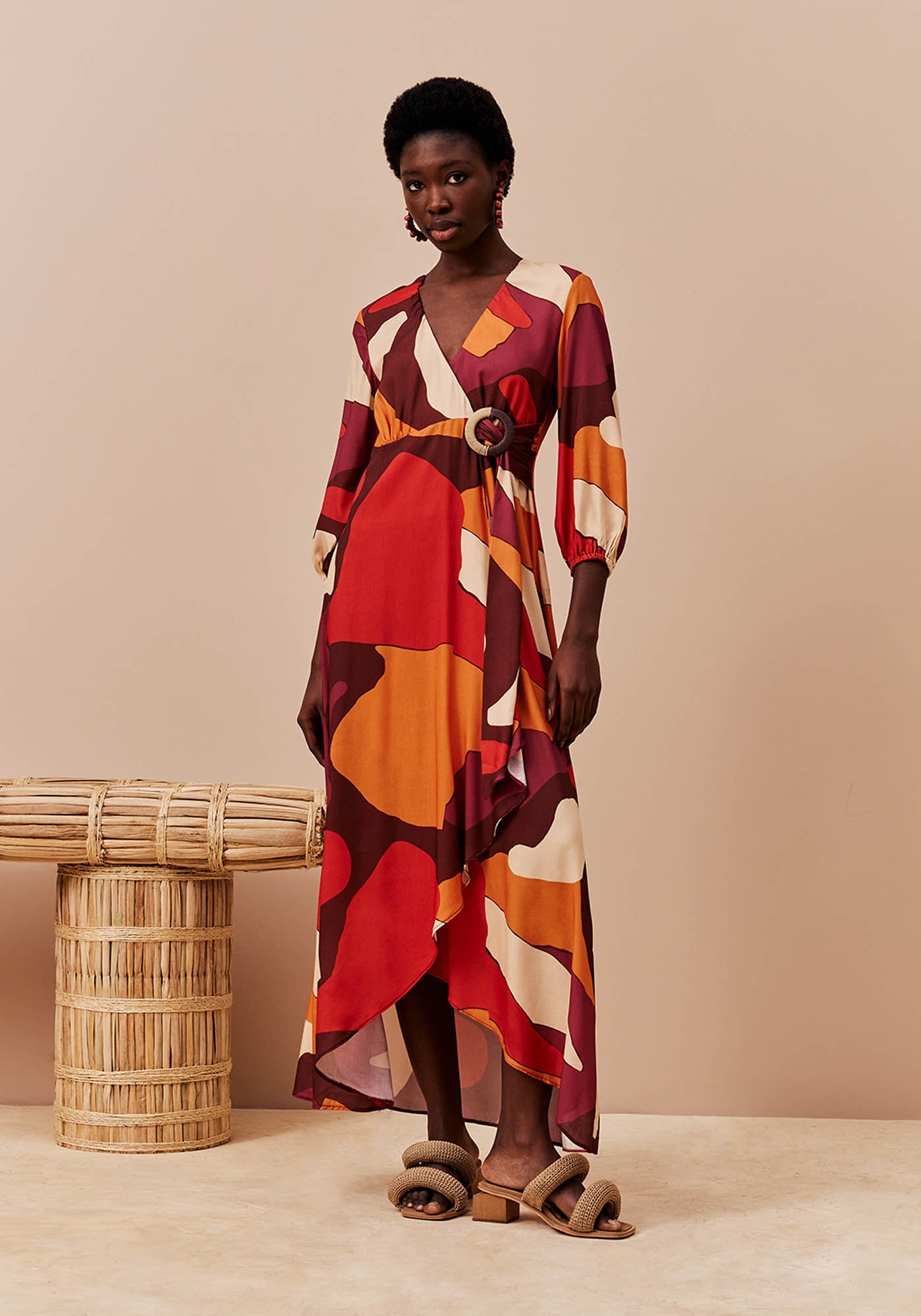 O vestido estampado Ushuaia é confeccionado em tecido 100% viscosee possui modelagem transpassada estilo cachecouer, com a parte da frente mais curta que a de trás. A faixa possui o detalhe da argola, dando todo o charme para a peça. A manga bufante comprida contém elástico e pode ser ajustada facilmente. É um modelo bonito e elegante.