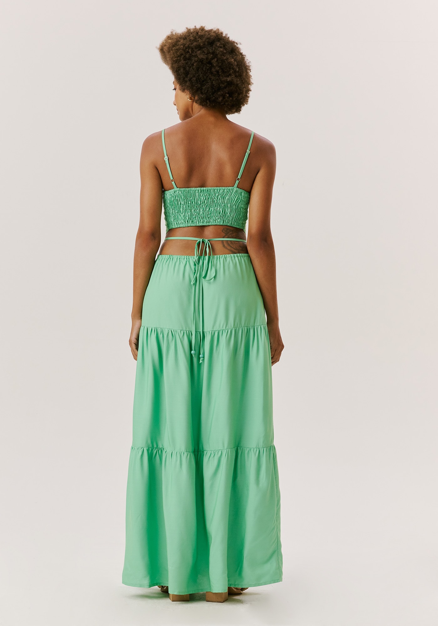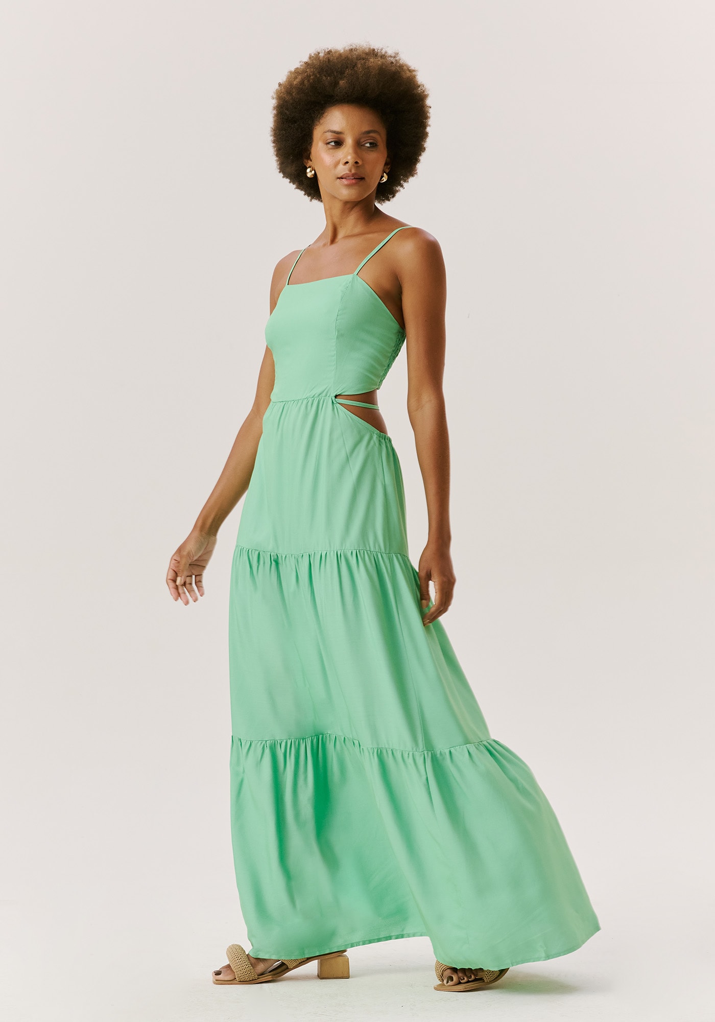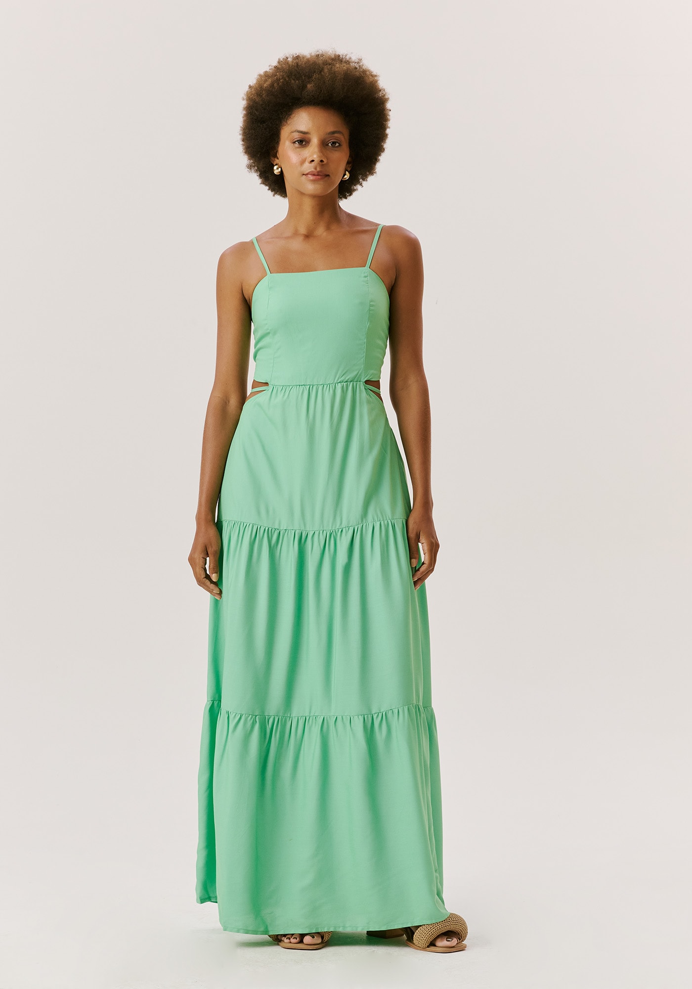 Confeccionado em tecido 100% viscose,o vestido longo liso é belo e versátil. Com alça fina e decote quadrado, omodelo possui recortes laterais que são realçados pela tira fina que amarra nascostas. Além disso, a peça possui lastex nas costas e babados ao longo do comprimentoque dão volume e movimento ao vestido.
