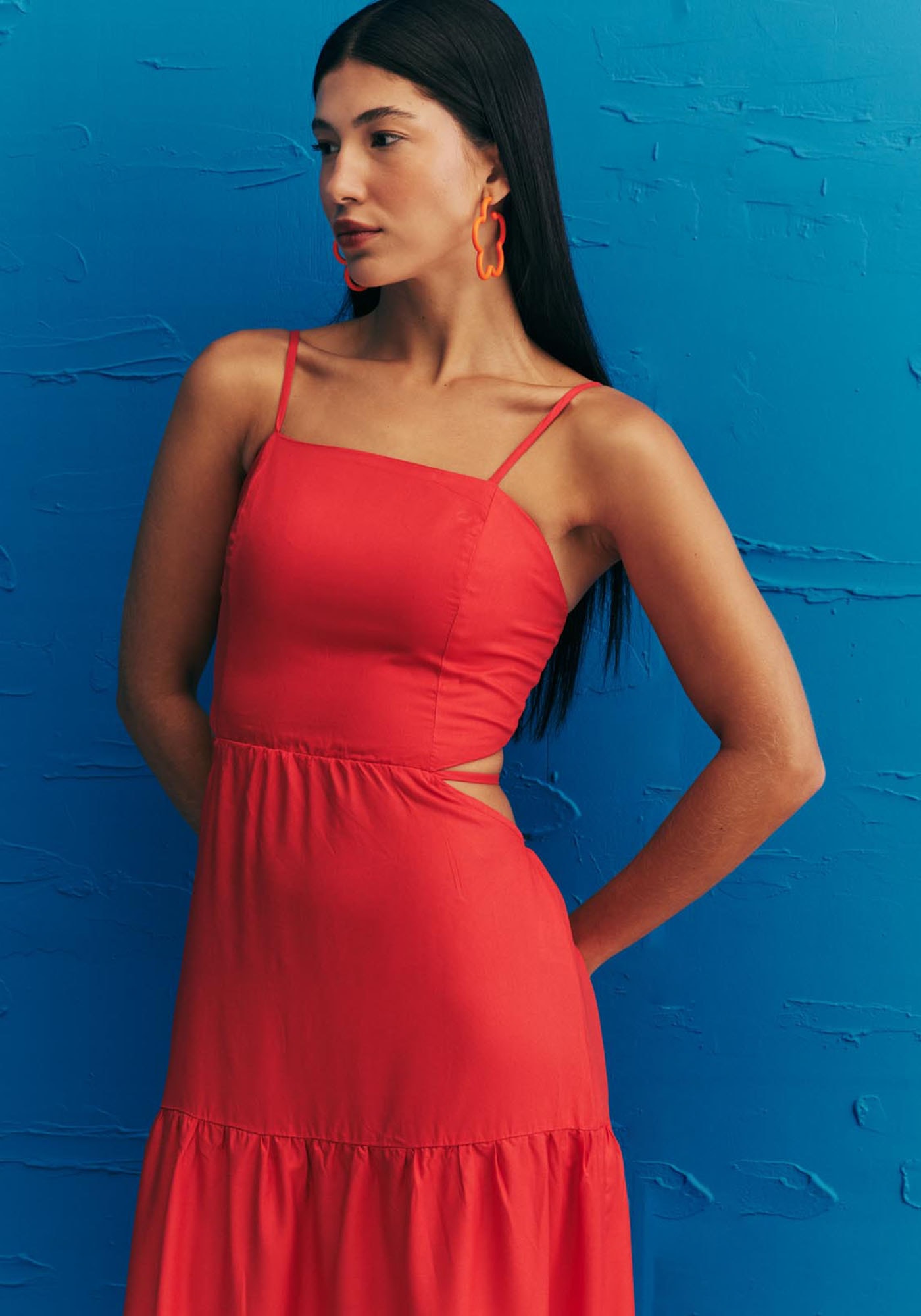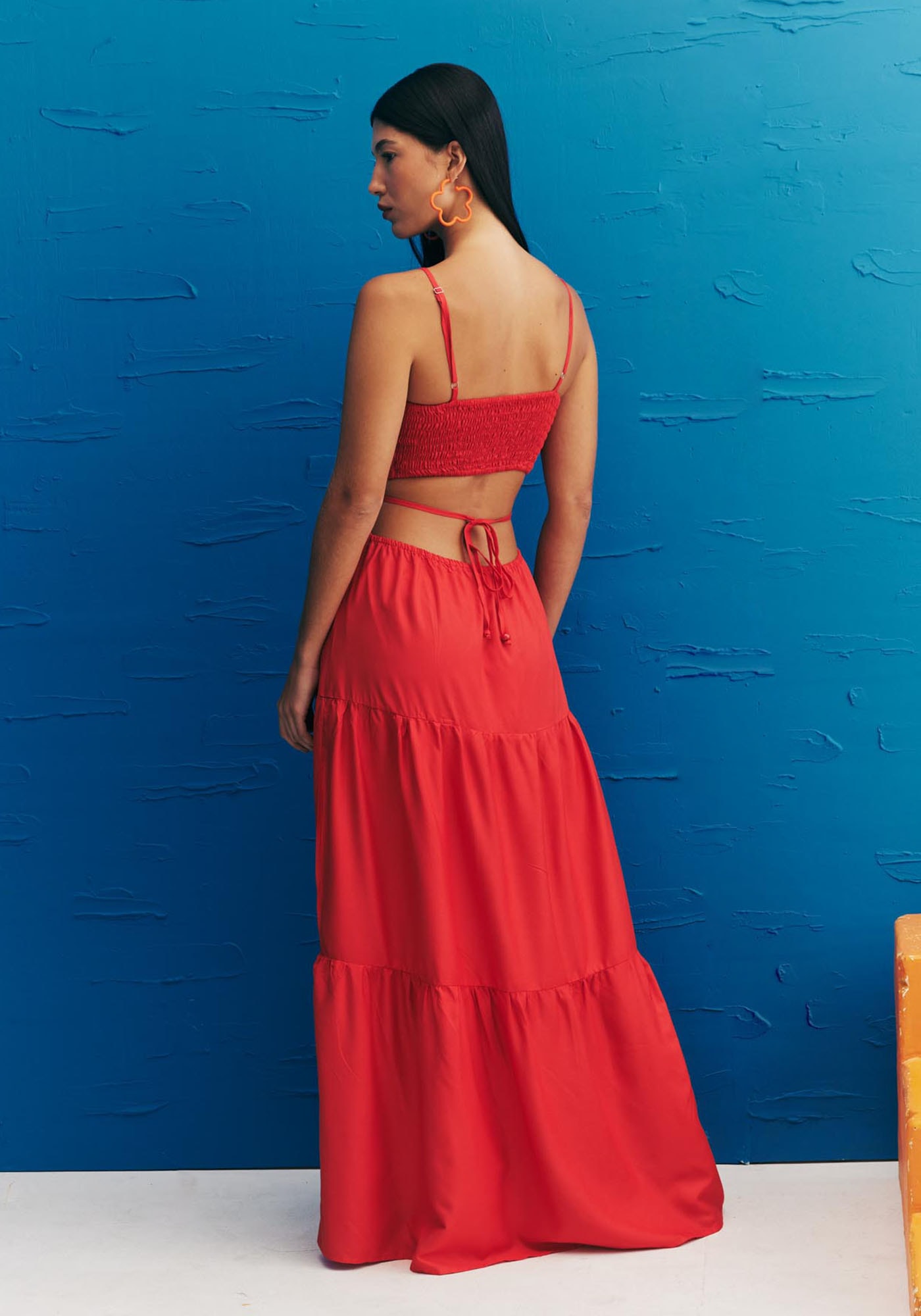 Confeccionado em tecido 100% viscose,o vestido longo liso é belo e versátil. Com alça fina e decote quadrado, omodelo possui recortes laterais que são realçados pela tira fina que amarra nascostas. Além disso, a peça possui lastex nas costas e babados ao longo do comprimentoque dão volume e movimento ao vestido.