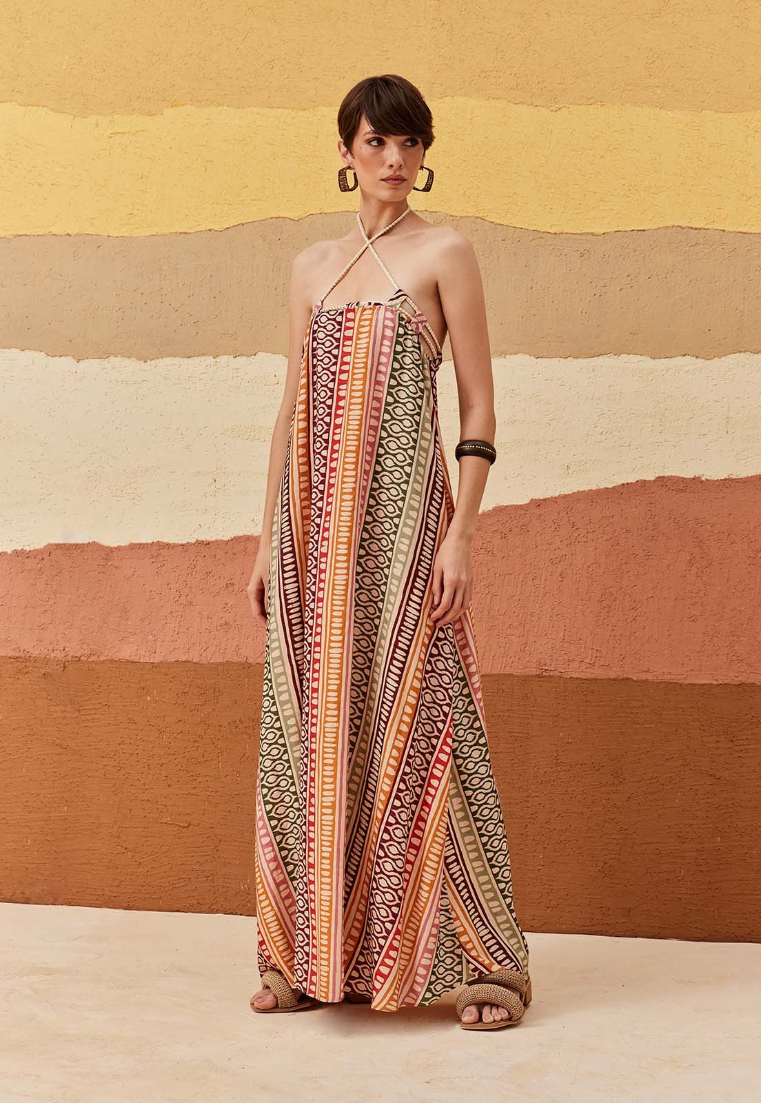 O vestido longo estampado Huaso é confeccionado em tecido 99% viscose 1% poliéster.É um modelomoderno e estiloso com um shape amplo e fluído e detalhe da amarração cruzada em corda na parte da frente.