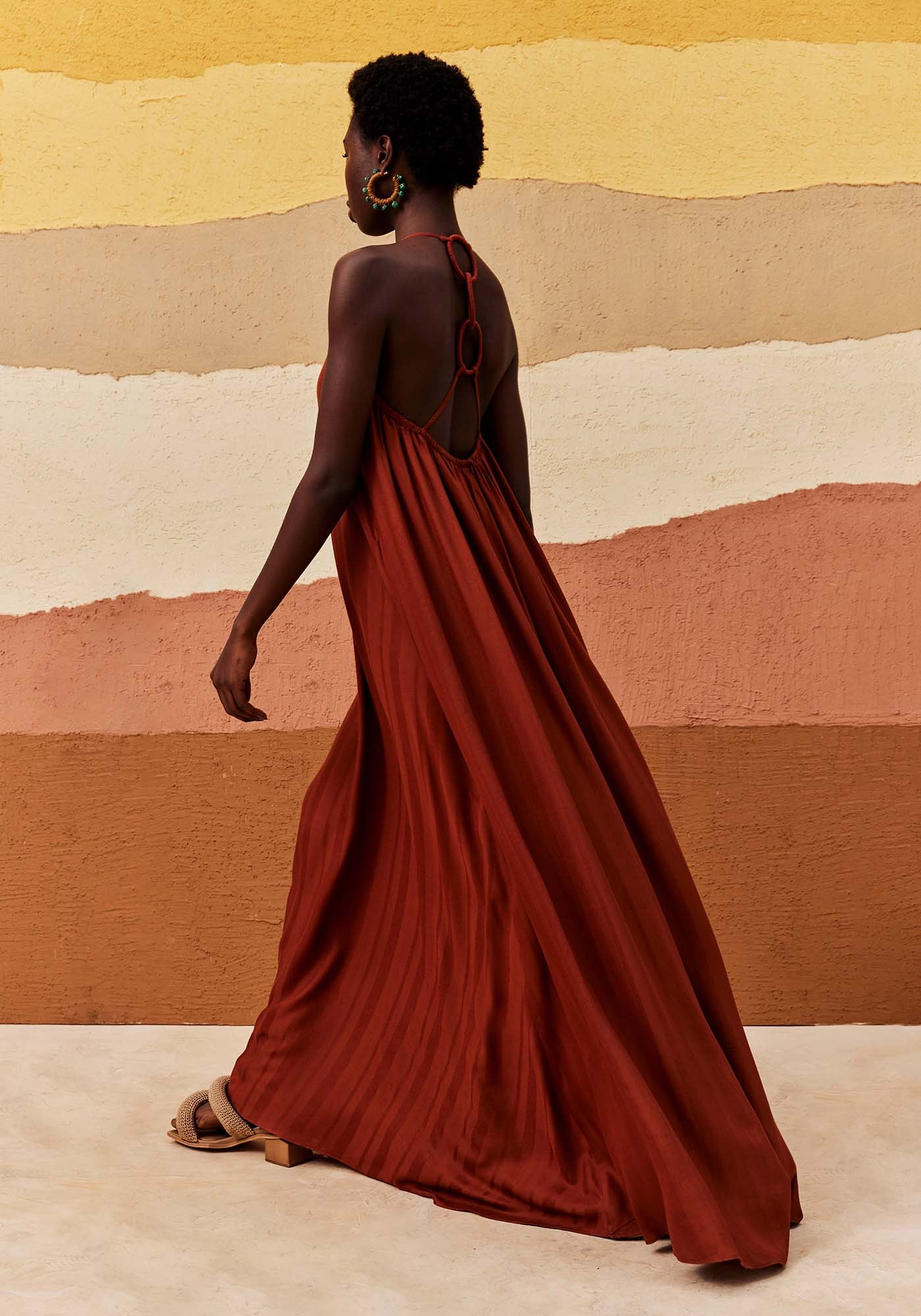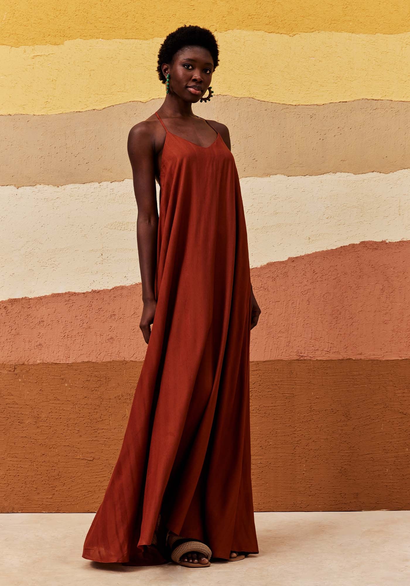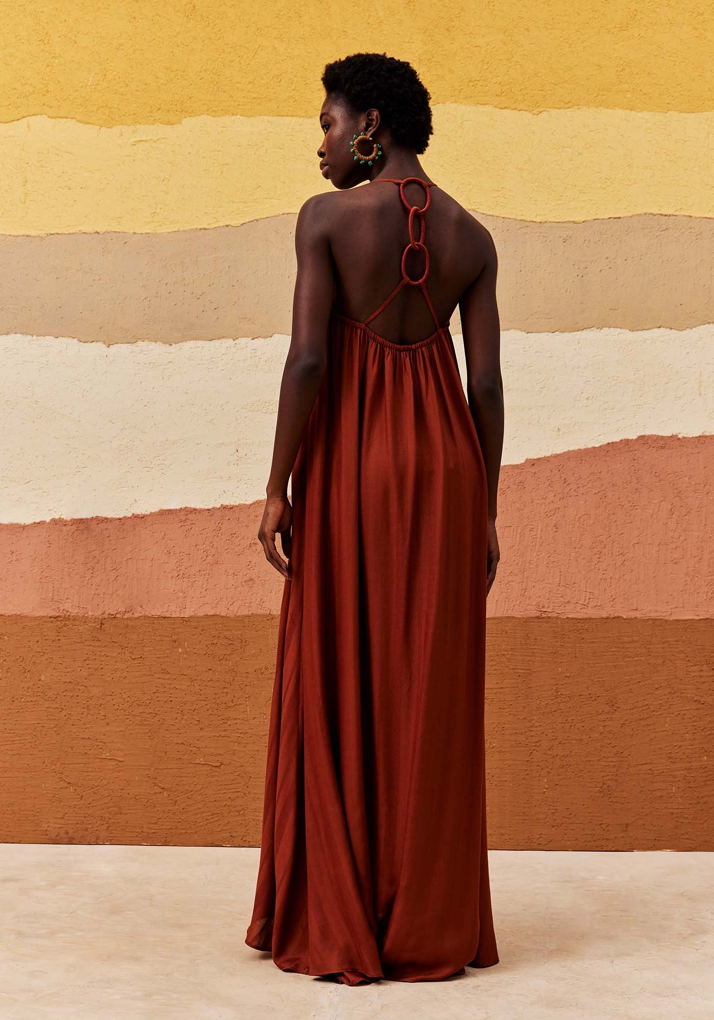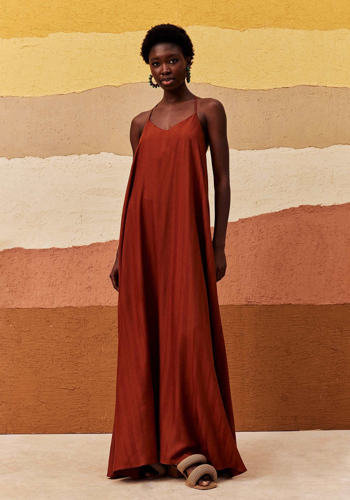 Este Vestido Longo apresenta modelagem ampla e fluida, sendo a escolha ideal para quem busca um visual prático mas também cheio de estilo. Com alças finas e decote sofisticado, ele apresenta detalhe em argolas na parte das costas que adiciona um charme único ao design. Possui lastex na parte das costas que garante um ajuste confortável. Elegante e único, ele é confeccionado em 97% Viscose e 3% Linho.