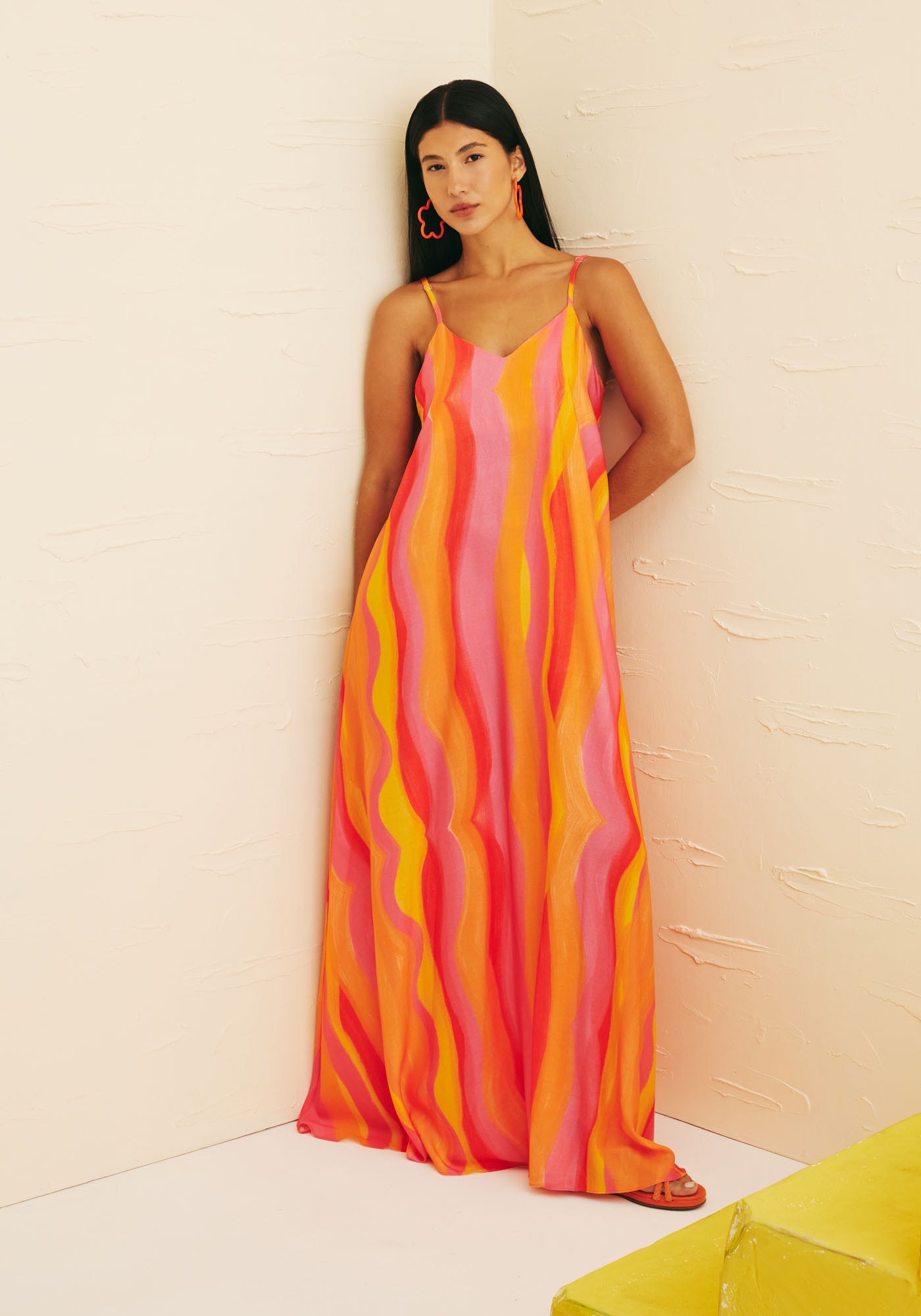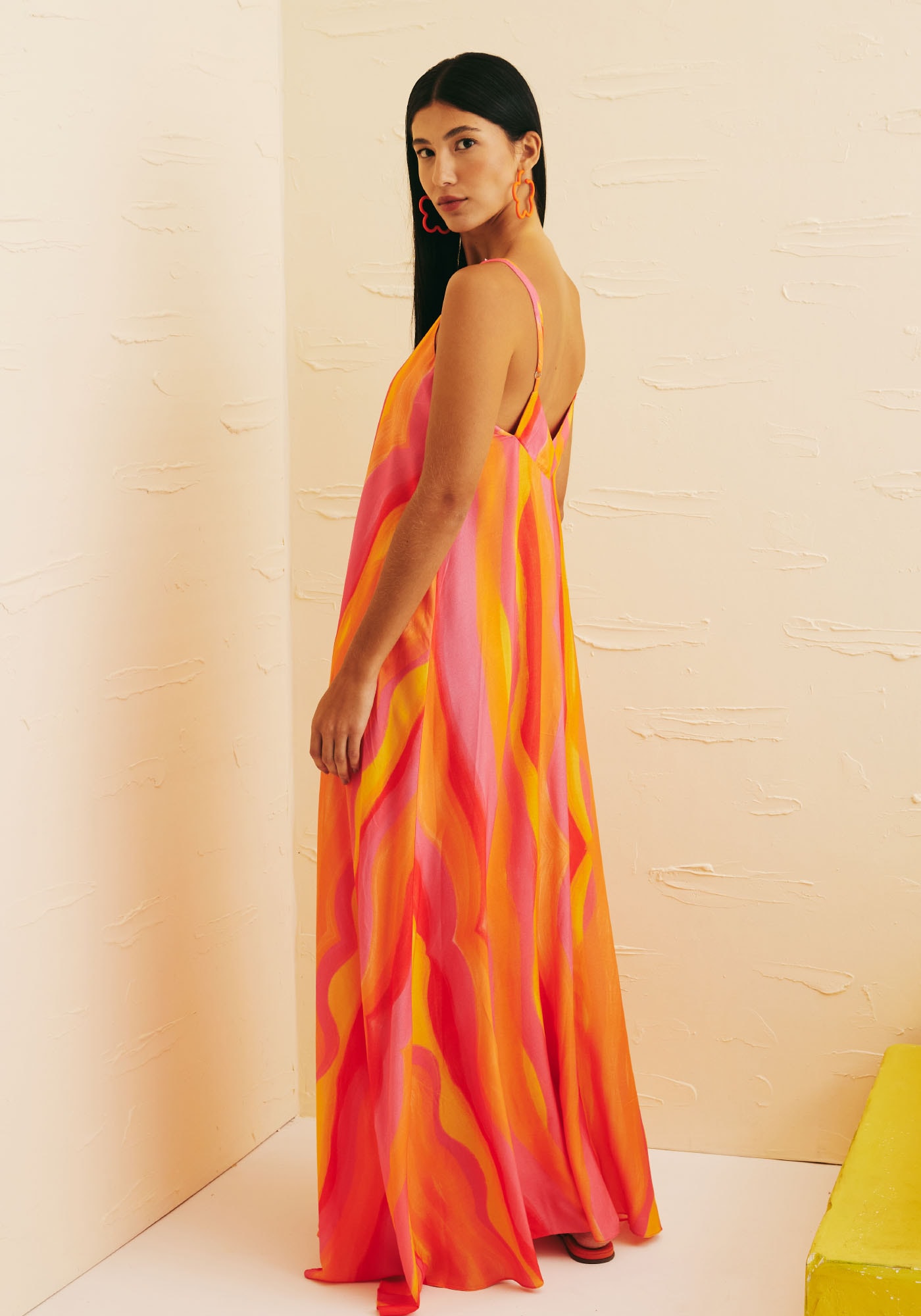 Este vestido tem o comprimentolongo e modelagem ampla e fluida, e é confeccionado em tecido de composição100% viscose. Possui decote em V na parte frontal que valoriza o colo e suasalças são finas e ajustáveis. Nas costas, também possui decote em V com odetalhe do transpasse. Essa peça se destaca por sua modernidade e praticidade,e a sua estampa Jujuy em tons vibrantes de laranja e rosa que são a cara doverão o tornam ainda mais único.