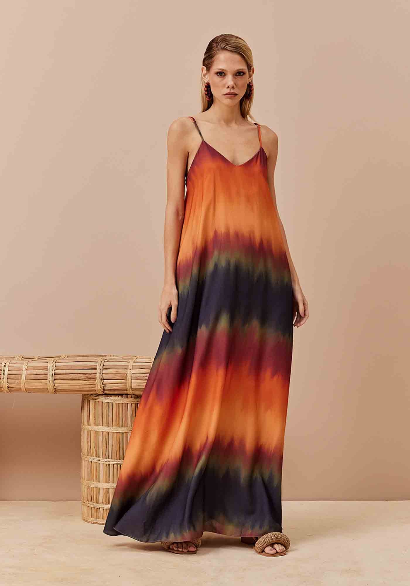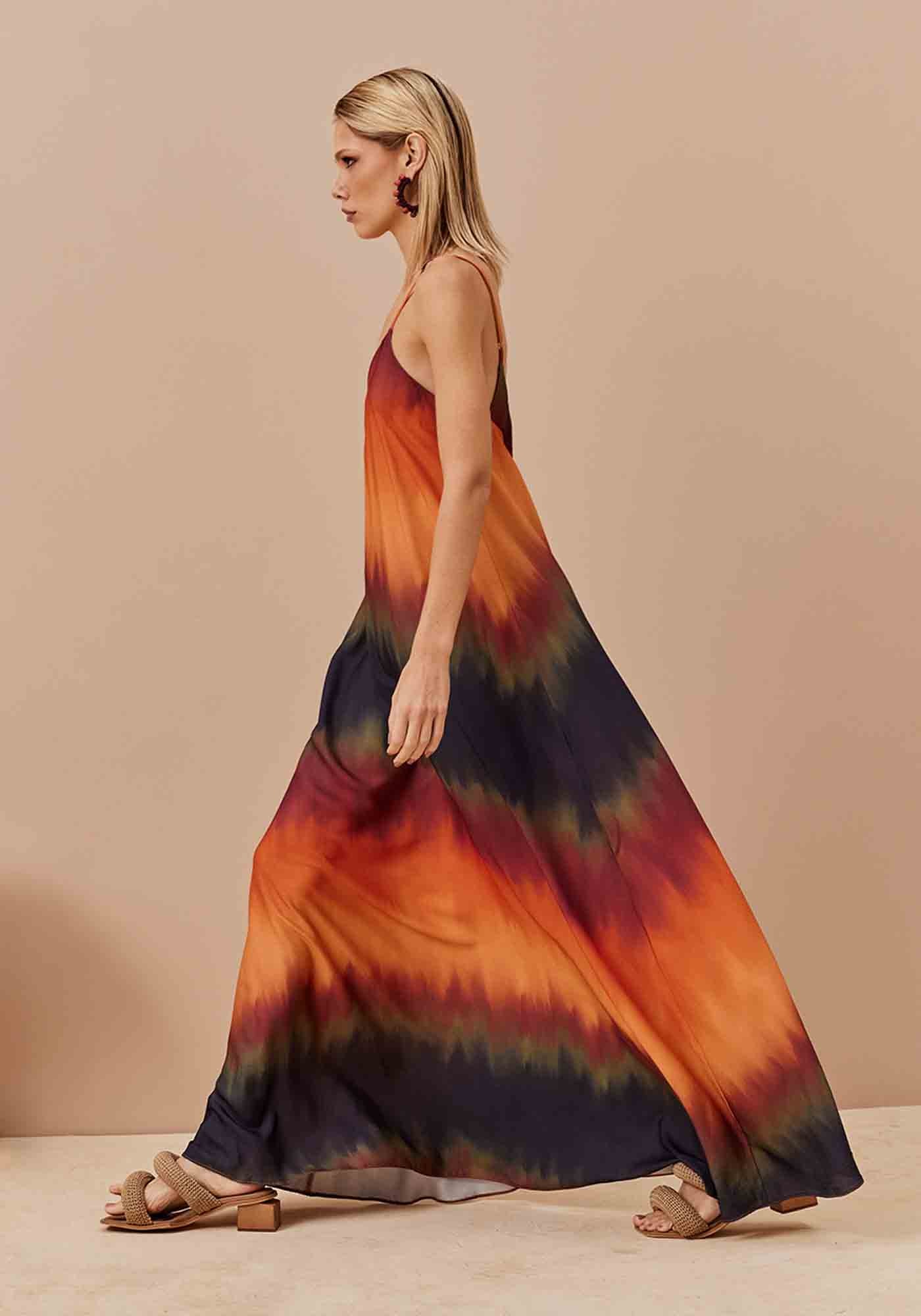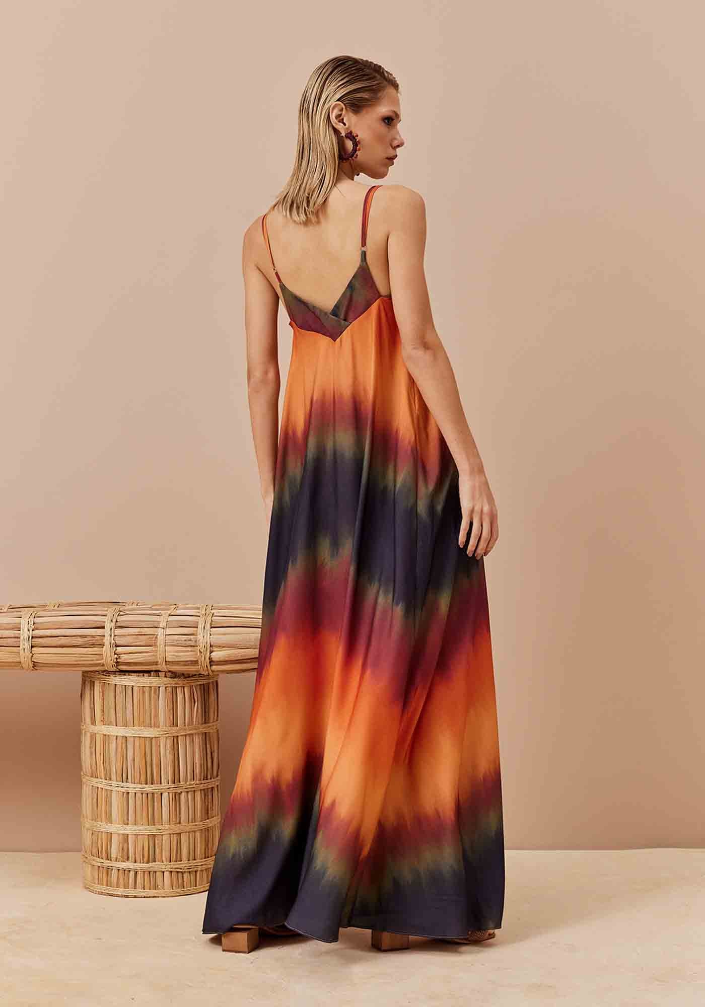 Confeccionado em tecido 100% viscose, o vestido estampado Purmamarca é simplesmente maravilhoso. A estampa com degradê em cores é inspirada nas montanhas da cidade argetina. O modelo possui alça fina e uma modelagem ampla e confortável, com bastante movimento. Além disso, possui um detalhe nas costas que deixa o modelo ainda mais charmoso.