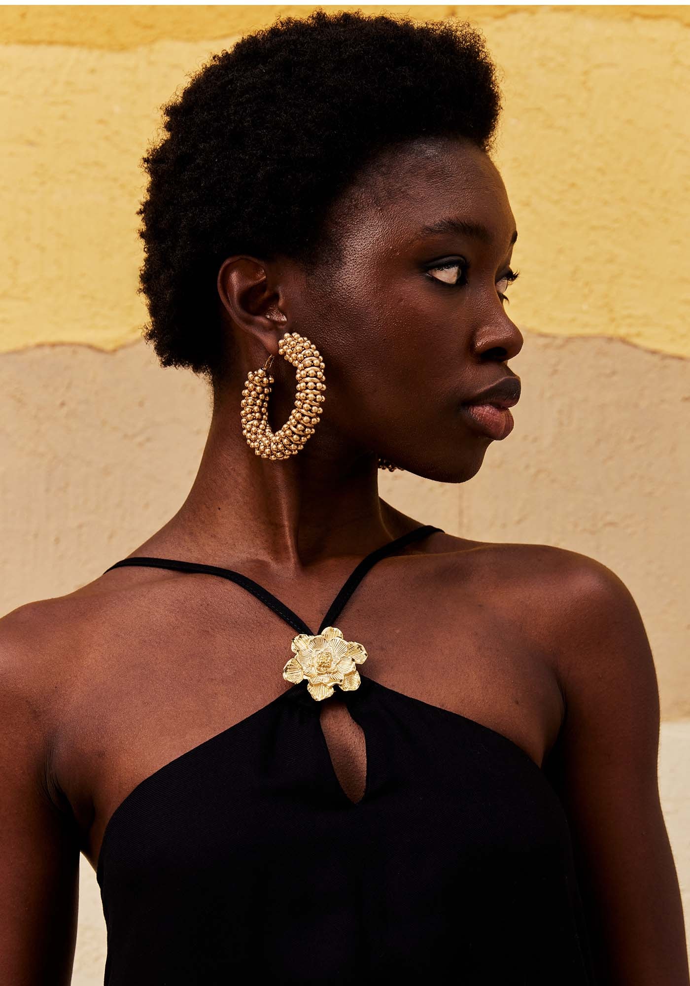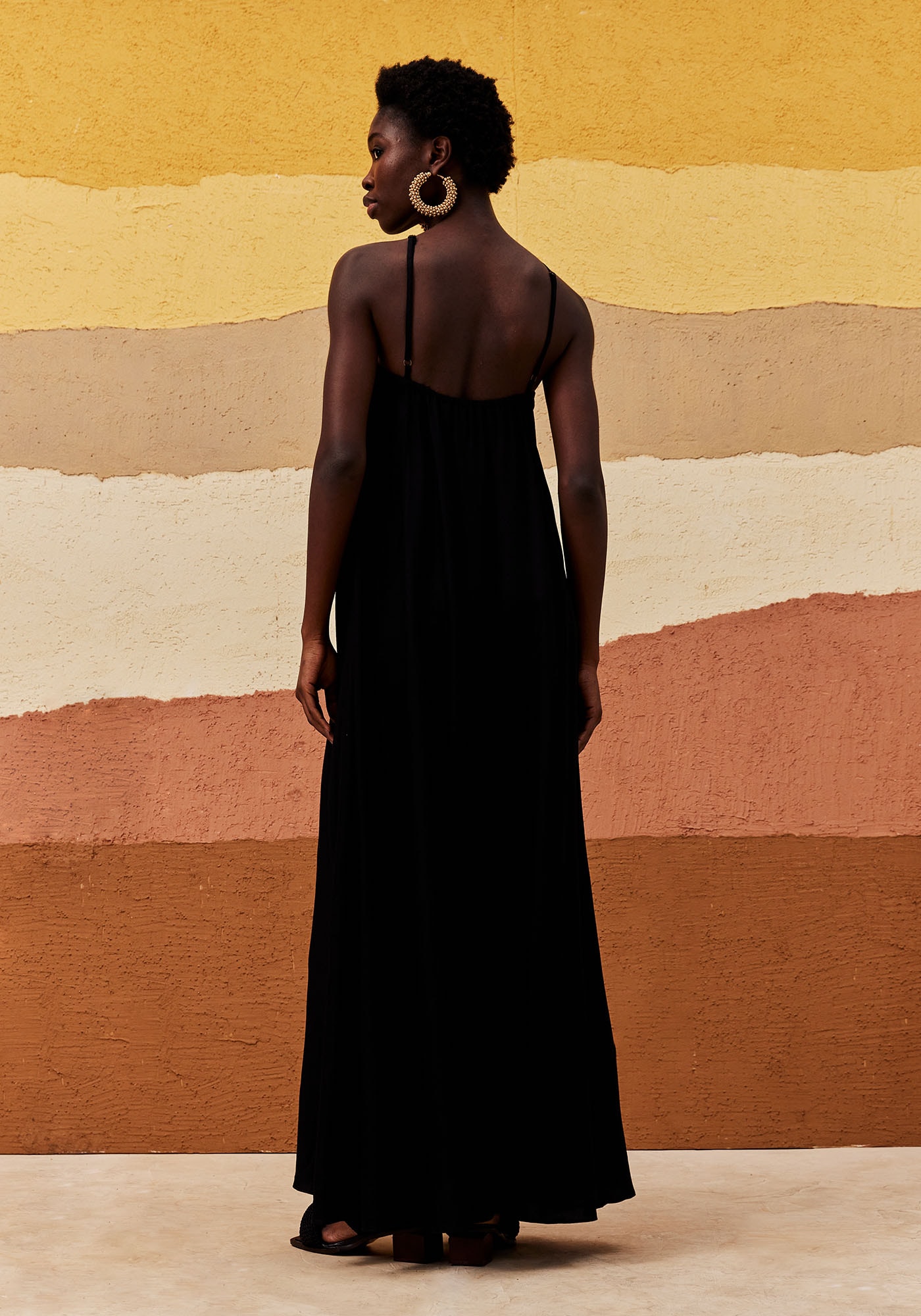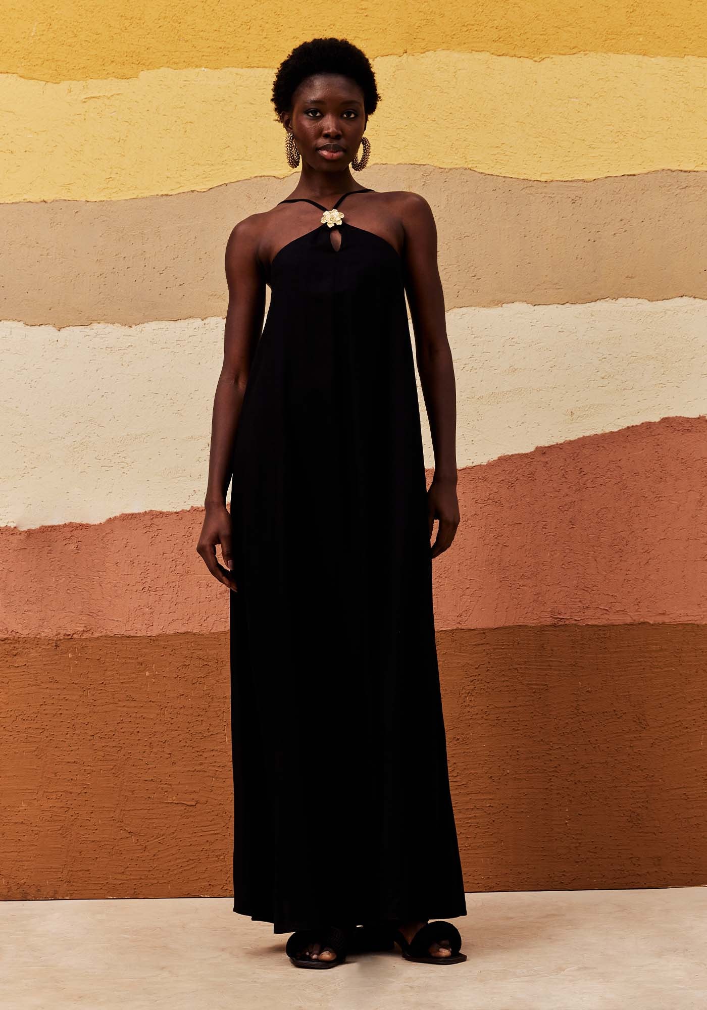 Este Vestido Longo é a escolha perfeita para ocasiões especiais. Com modelo frente única e alças finas ajustáveis, ele valoriza a silhueta com elegância. O decote nas costas e a abertura em gota na frente trazem um ar de sensualidade de forma sofisticada, enquanto o detalhe em flor dourada no decote frontal acrescenta um toque único e estiloso. Feito em 100% Viscose, oferece caimento fluido e conforto.