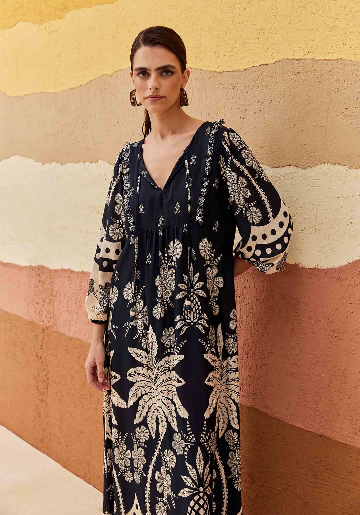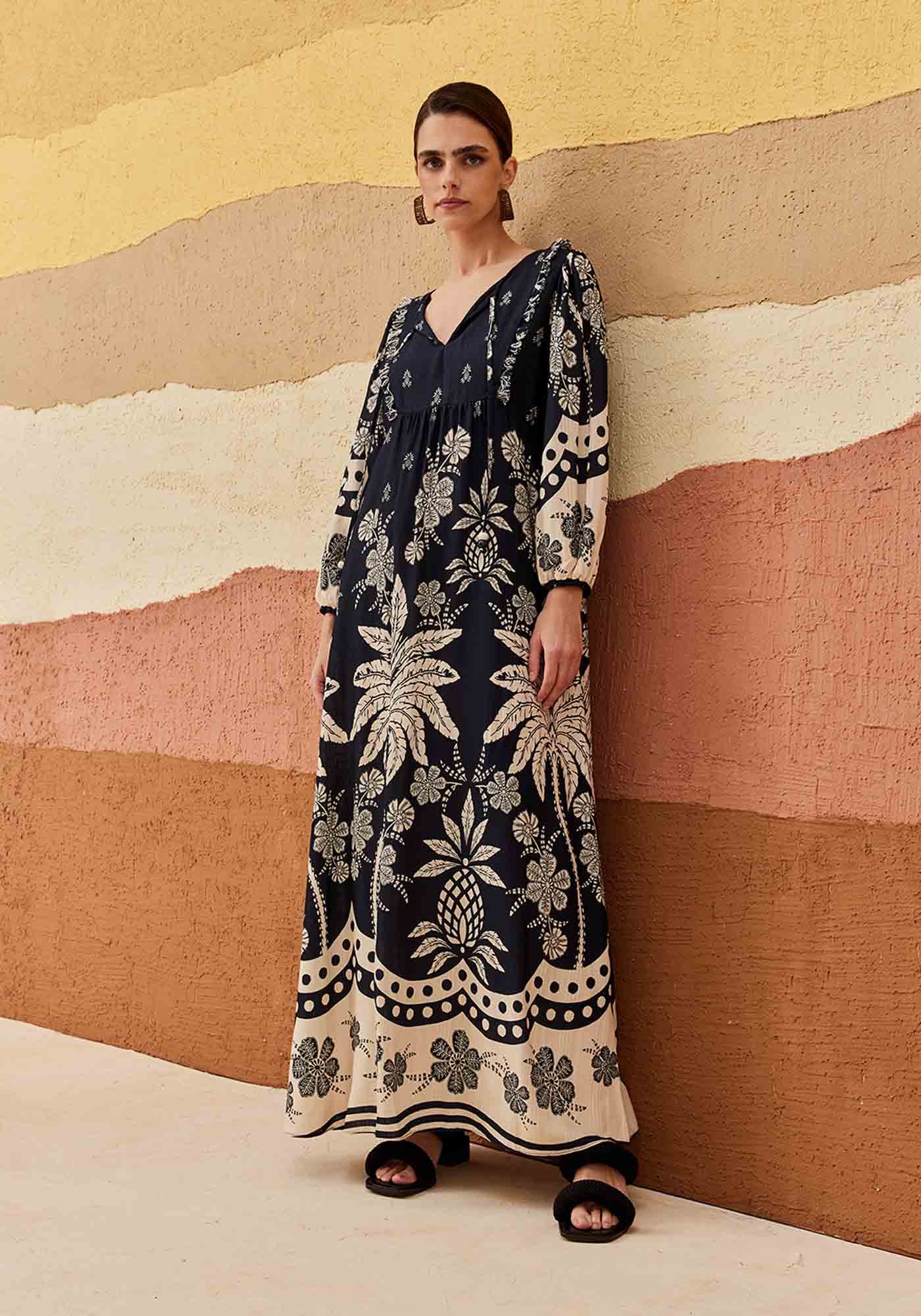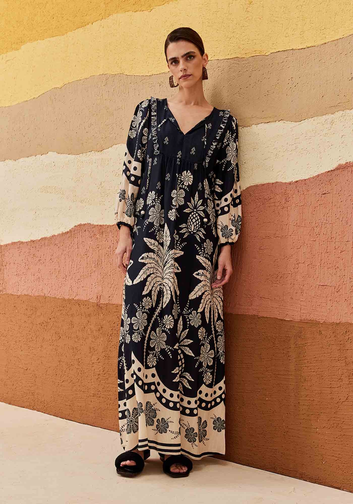 Este vestido longo com modelagem solta é a definição de estilo, sofisticação e conforto. Com mangas longas e elástico nos punhos, ele oferece um ajuste confortável, enquanto a saia ampla e fluída proporciona movimento e leveza. O decote frontal, com detalhe em amarração, adiciona um toque de sensualidade discreta, enquanto as franjas na parte da frente conferem um charme extra à peça. Feito em 100% Viscose, esse vestido é perfeito para quem deseja arrasar em eventos casuais e sofisticados ao mesmo tempo.