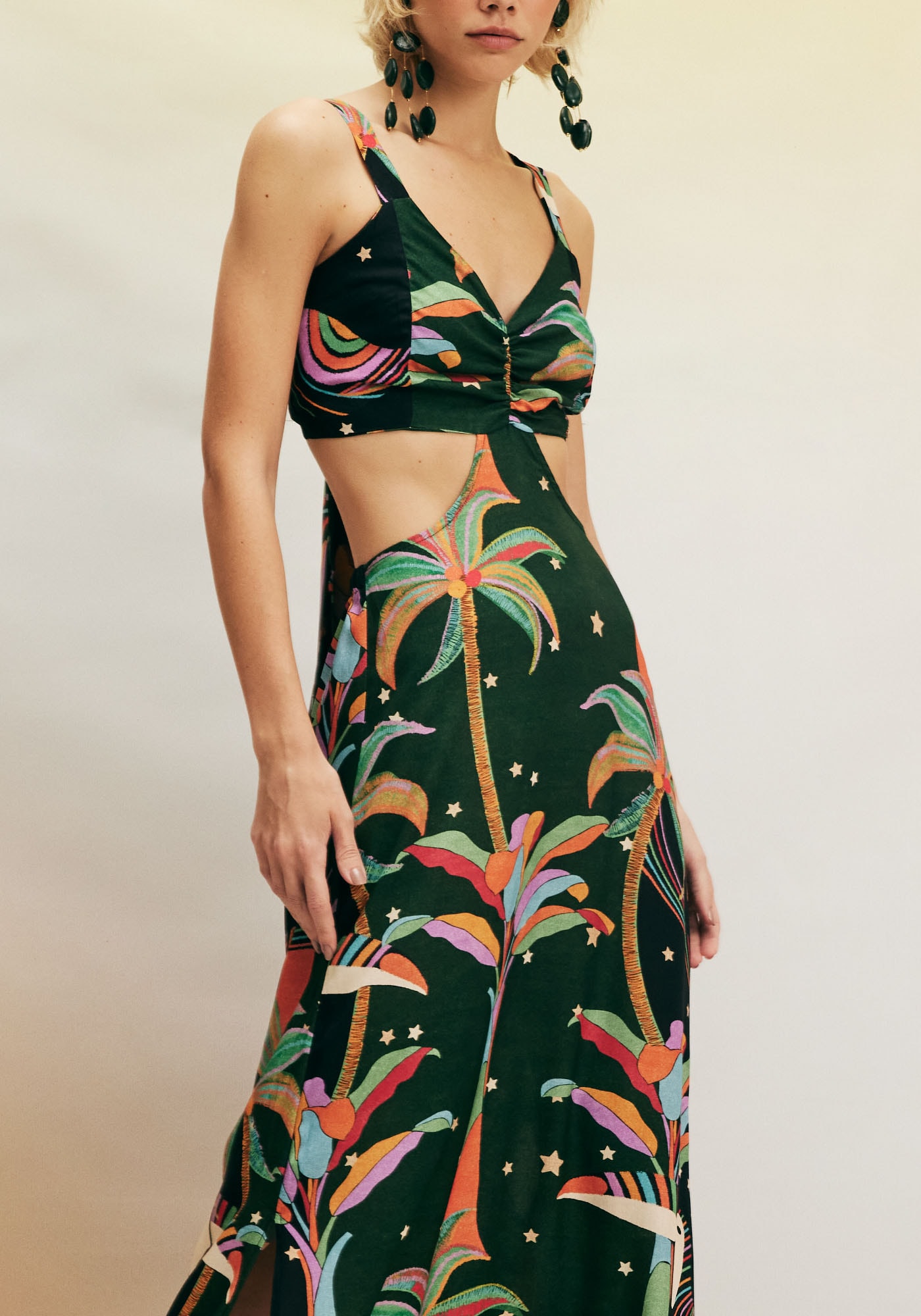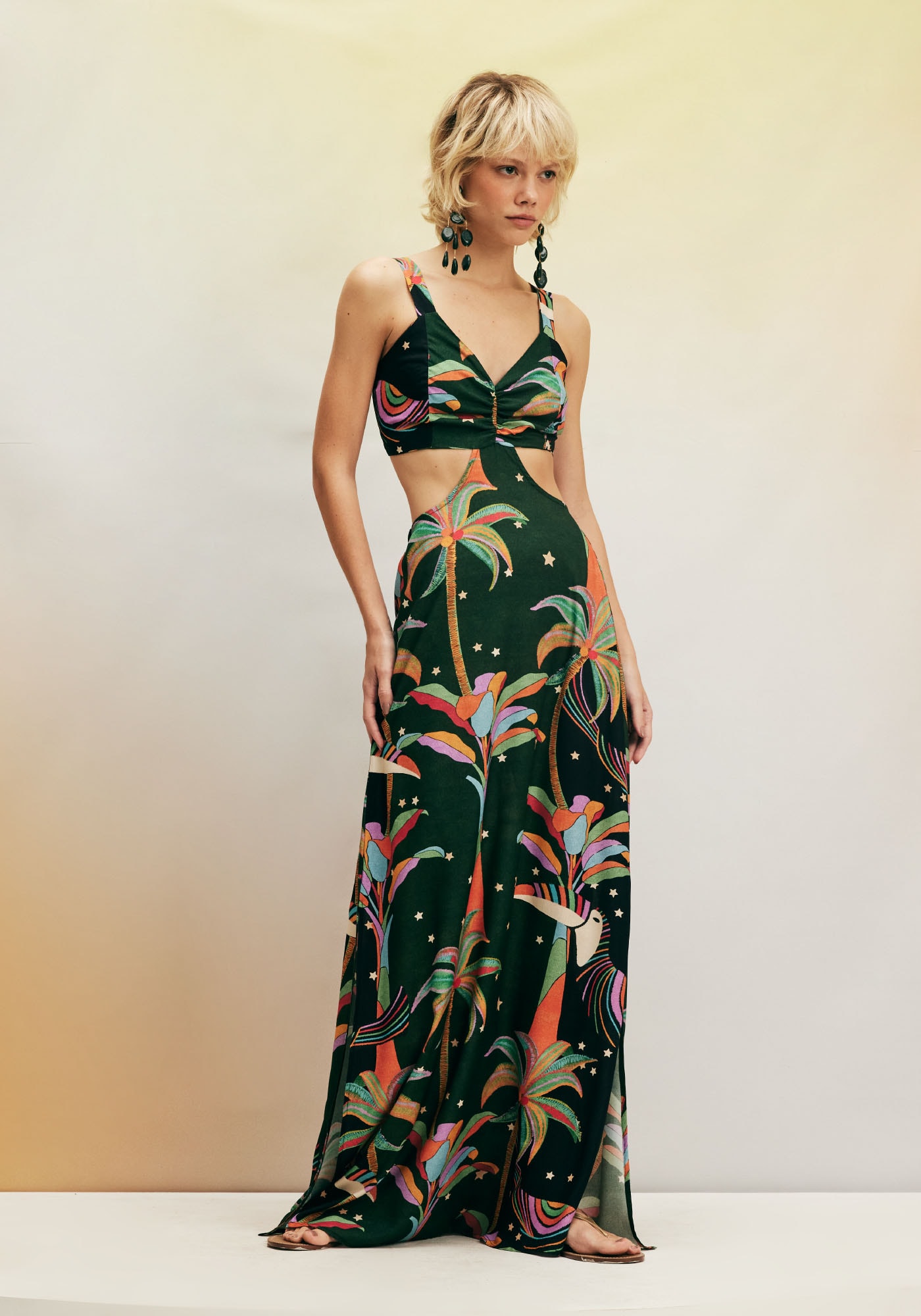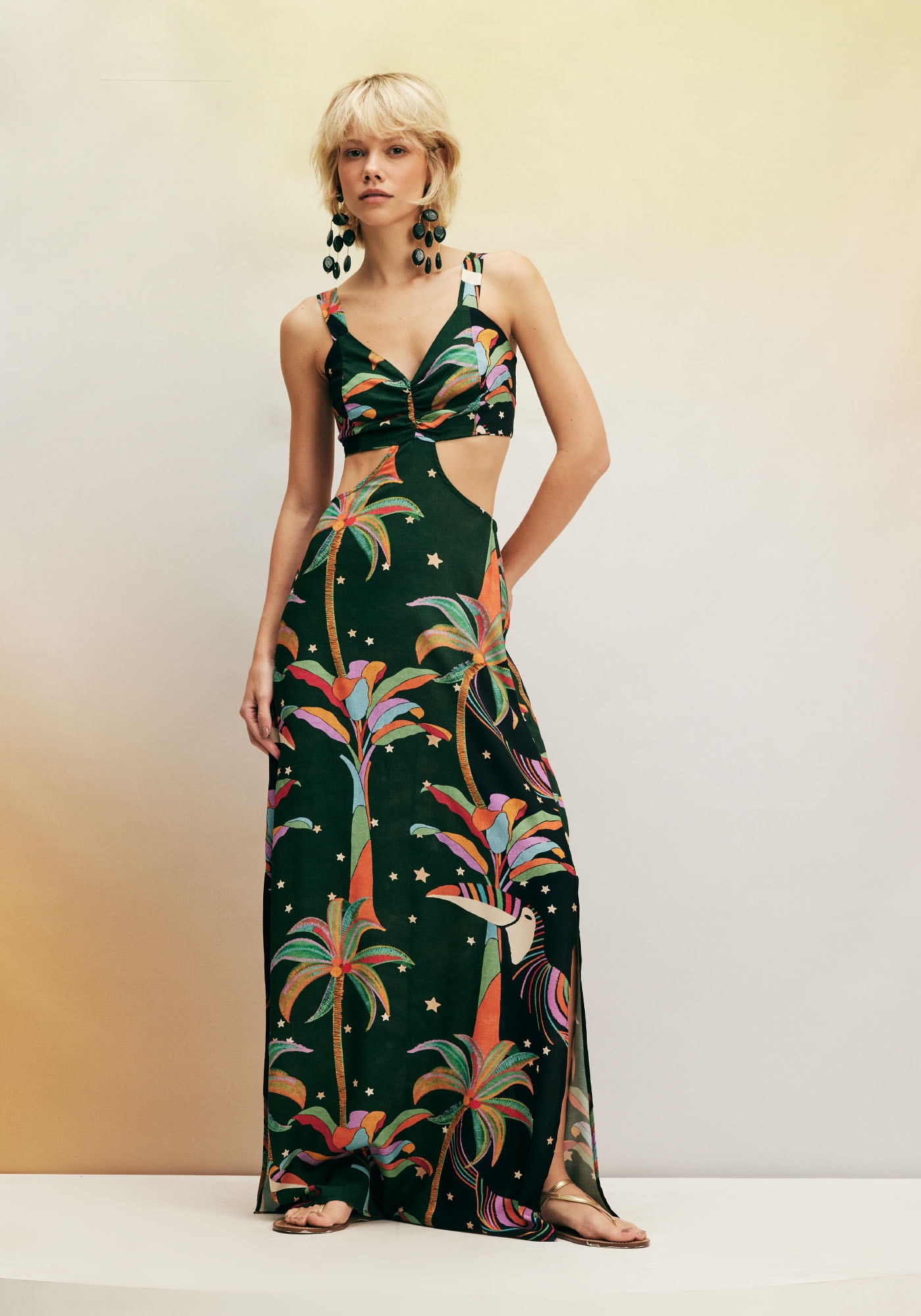 O Vestido Longo com Detalhe Lateral é arrojado e estiloso e omodelo combina com os dias quentes. A estampa Mauwê Tupi remete à ricanatureza do nosso país