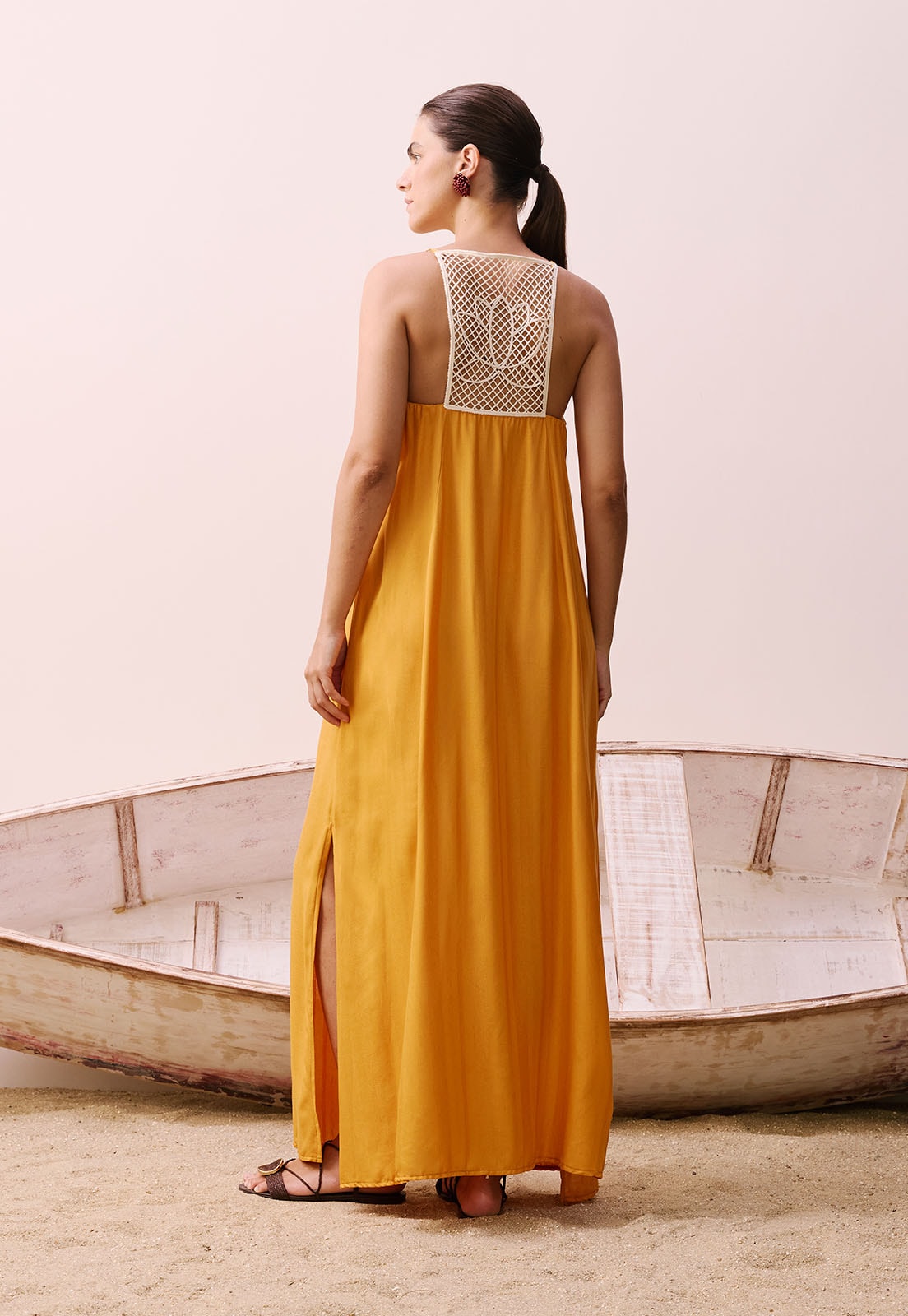 O Vestido Longo Detalhe Vitória-Régia da CaCay é a expressão da elegância natural. Com alças finas, fenda lateral e aplicação de renda delicada nas costas, ele valoriza a silhueta com leveza e sofisticação. Feito em tecido de toque suave e caimento fluido (97% viscose e 3% linho), é ideal para quem busca conforto sem abrir mão do estilo. A modelo tem 1,77m e veste tamanho P, evidenciando o ajuste perfeito da peça.