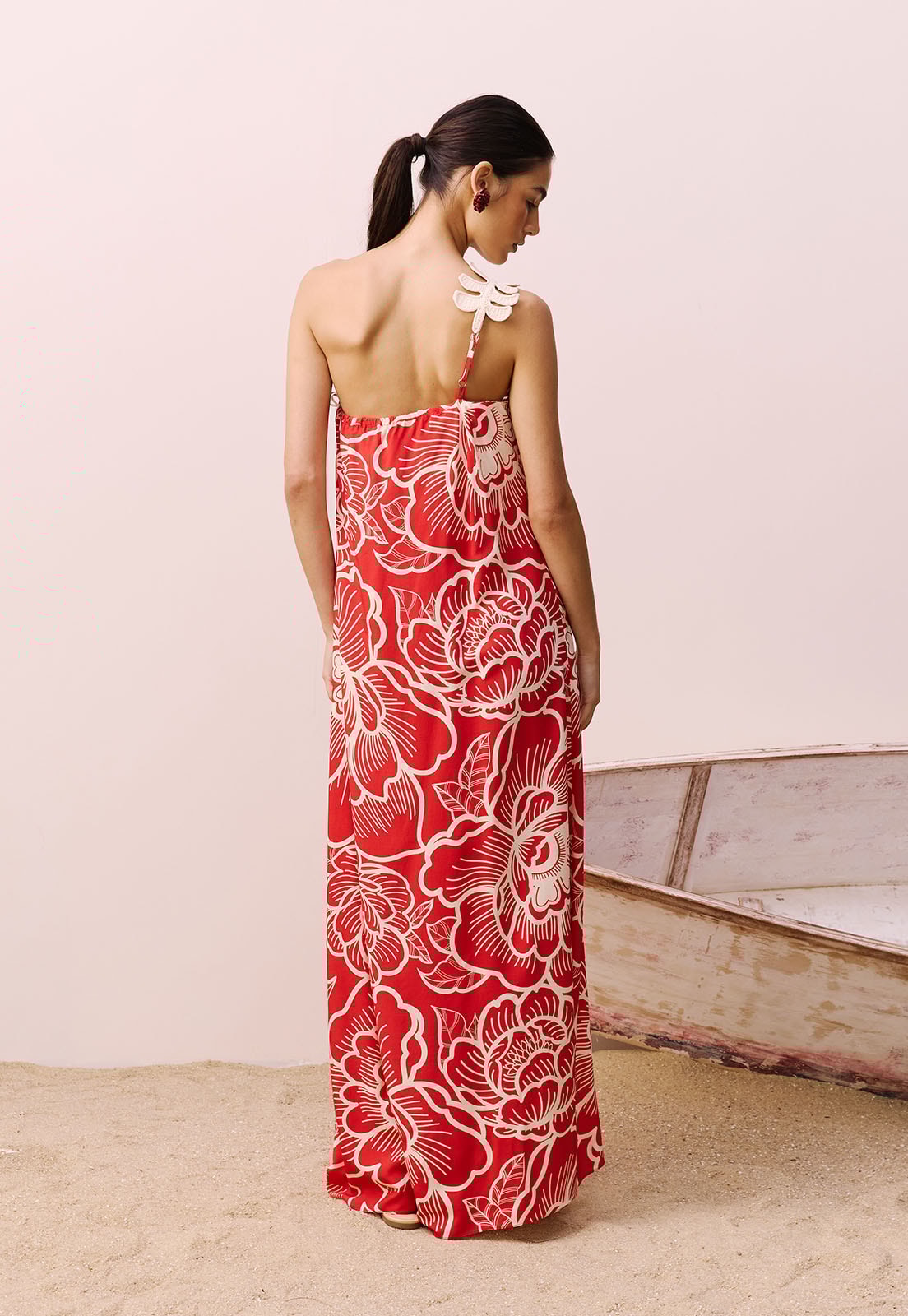 O Vestido Longo Estampado Cambará é a união perfeita entre elegância natural e conforto. Confeccionado em tecido Rayon com composição 100% viscose, ele possui caimento leve e toque suave, ideal para os dias mais quentes. Seu design de um ombro só com alça ajustável garante um visual moderno e feminino, enquanto a estampa floral em tons de vermelho e branco transmite frescor e autenticidade. O detalhe da flor aplicada na alça adiciona um charme artesanal à peça.