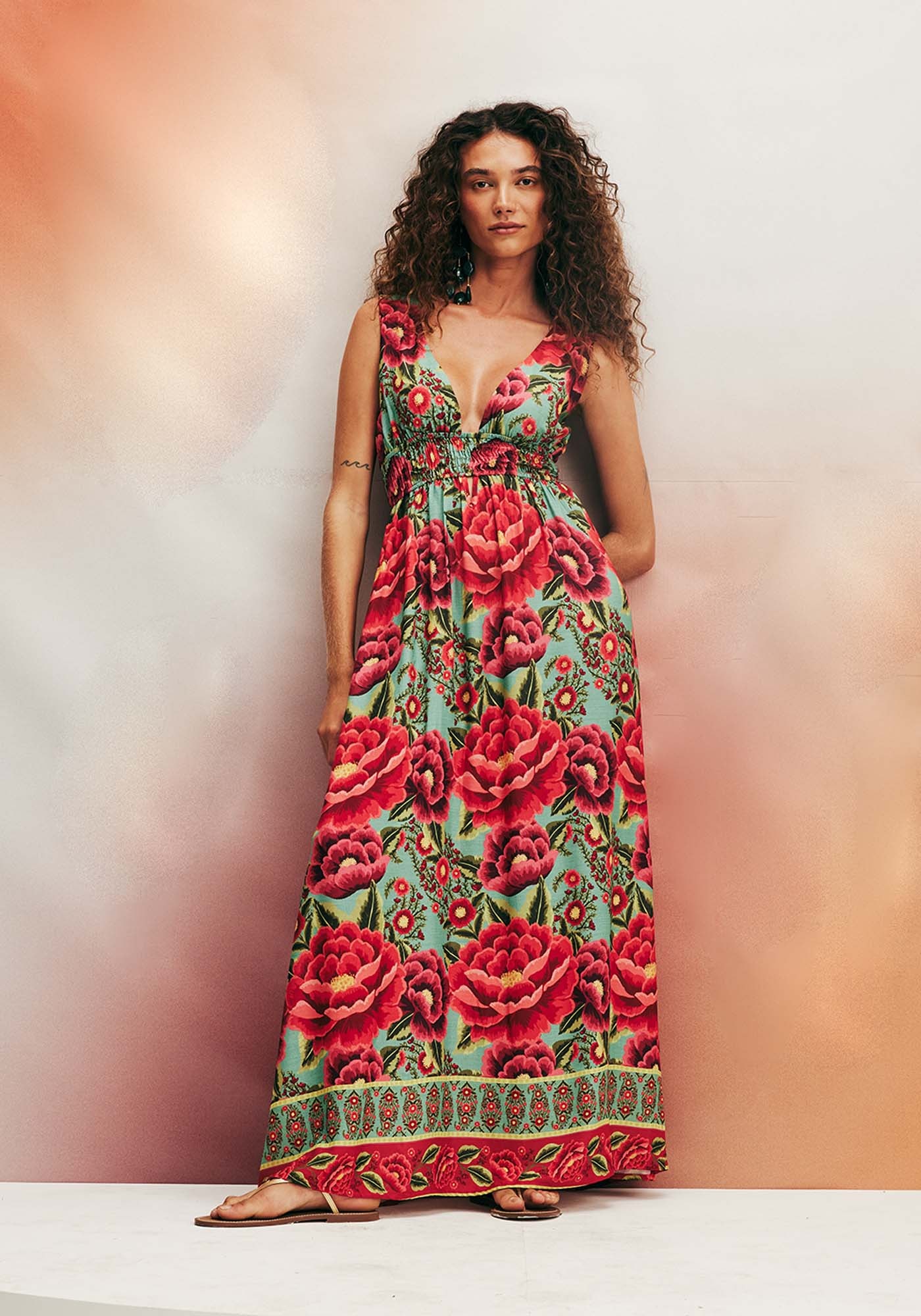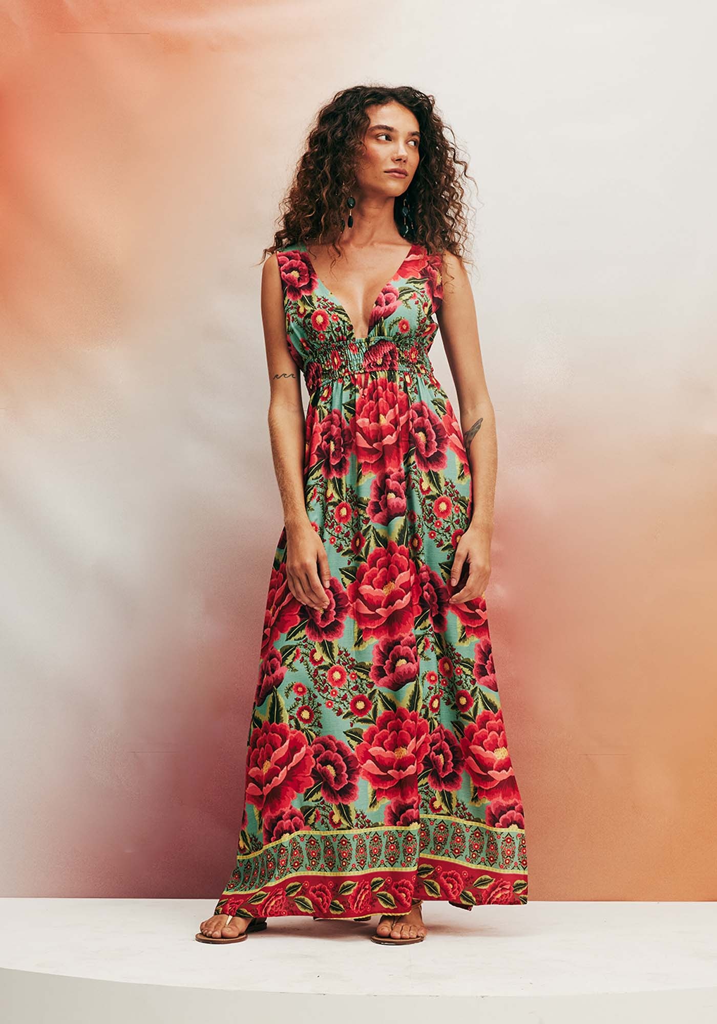 Elaborado com adistinção do tecido 100% viscose e adornado por uma encantadora estampa floral,este vestido longo personifica a harmoniosa fusão entre elegância eautenticidade, proporcionando simultaneamente conforto e qualidade excepcionais.