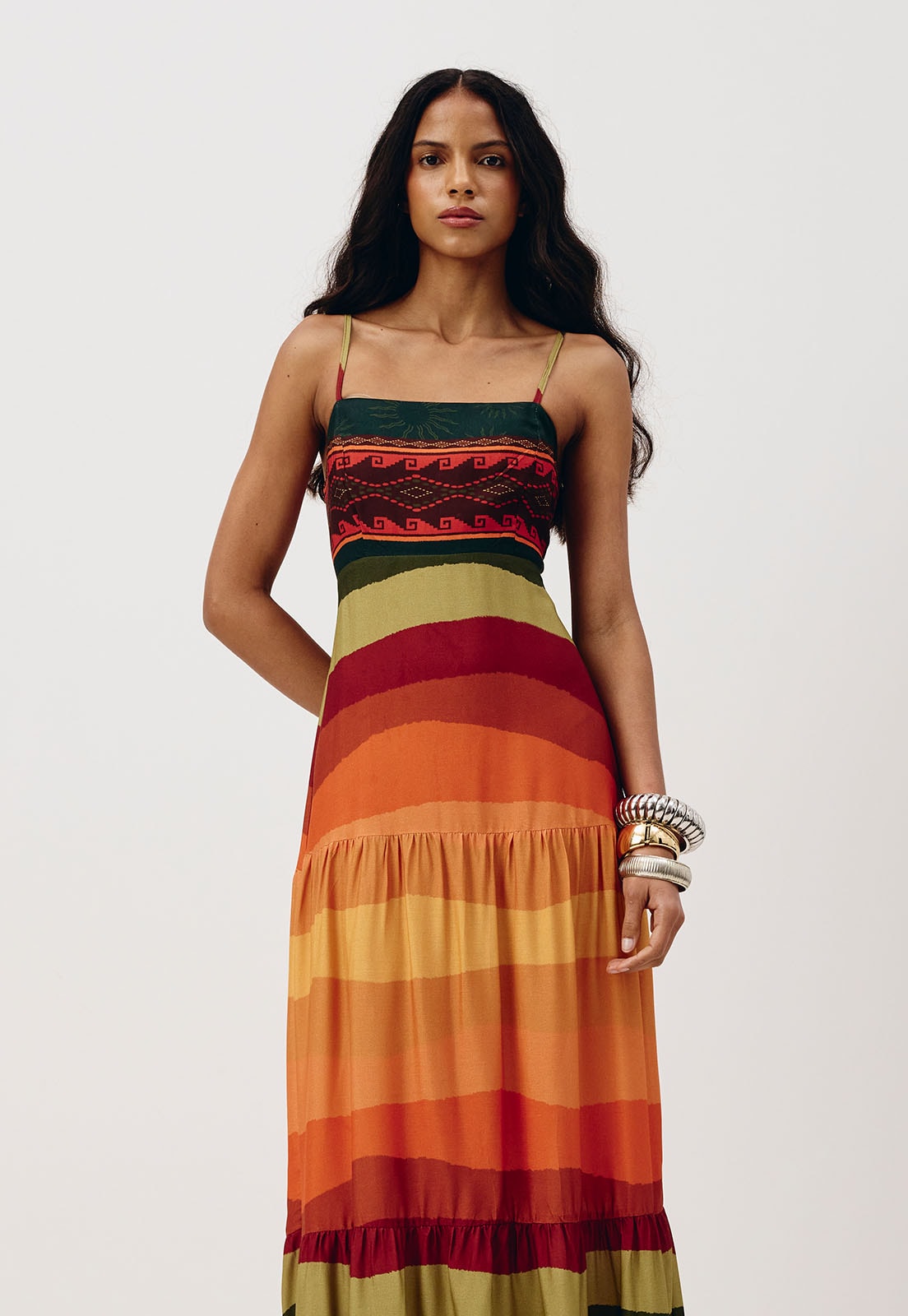 O Vestido Longo Estampado La Rioja da CaCay é a escolha perfeita para quem busca elegância com leveza. Confeccionado em 100% viscose, seu caimento fluido valoriza a silhueta com naturalidade, enquanto as alças finas ajustáveis e o decote reto com faixa decorativa garantem conforto e sofisticação. A cintura marcada alonga o corpo, e a saia esvoaçante em camadas horizontais traz movimento e um toque boêmio ao visual, ideal para eventos ao ar livre, jantares descontraídos ou passeios em dias quentes.