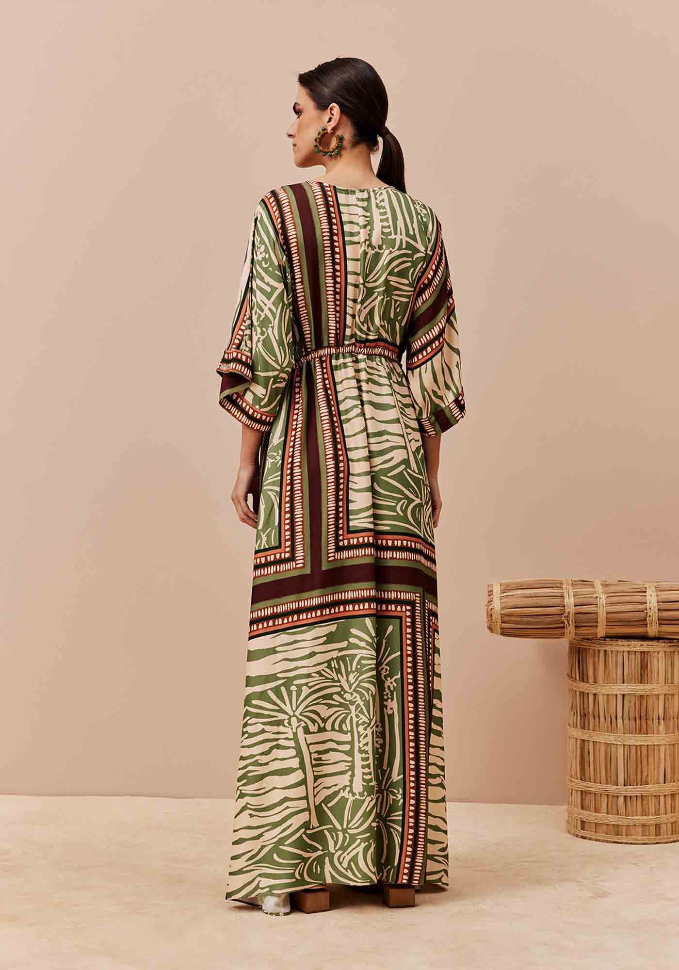 Encante-se com este Vestido Longo Estampado que é uma peça única e cheia de estilo e personalidade. Confeccionado na estampa exclusiva Laguna, ele possui composição de 100% Viscose oferecendo um caimento leve e que traz movimento. Combinando perfeitamente elegância e conforto, ele possui um decote frontal em V e mangas estilo kimono. A saia fluida e o túnel de ajuste com amarração abaixo do busco garantem um caimento impecável que valoriza a silhueta.