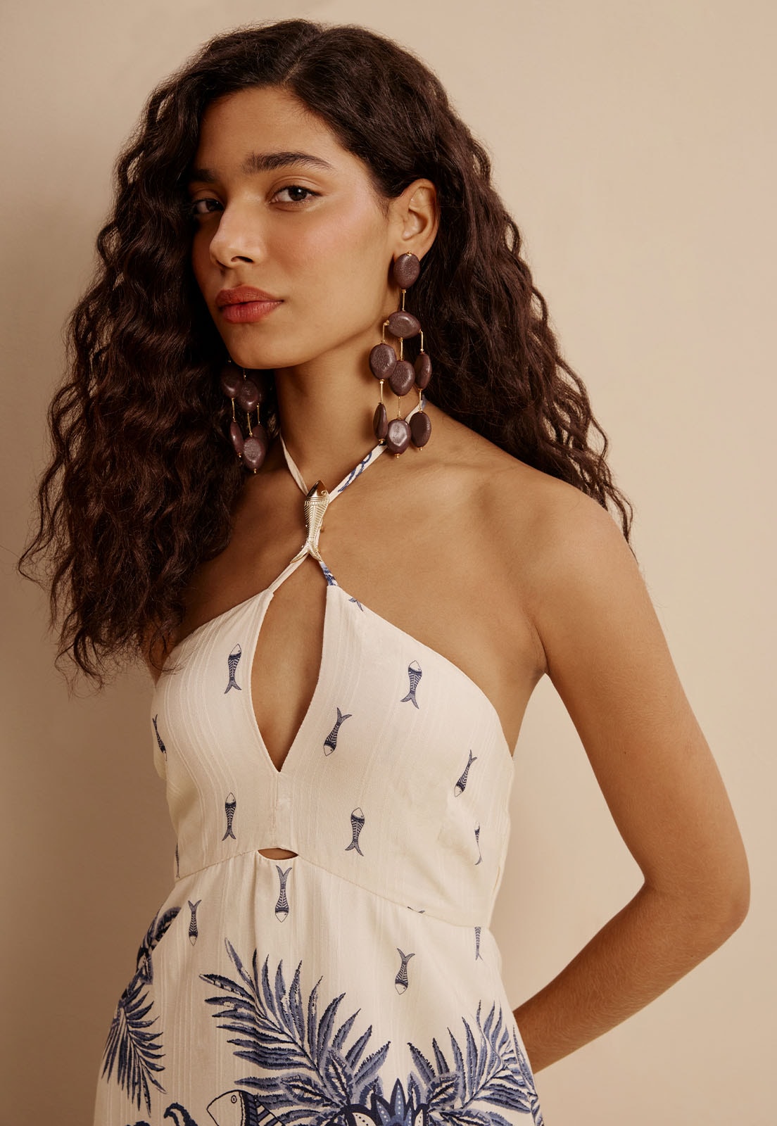O Vestido Longo Estampado Pedra dos Peixes da CaCay é uma peça que une sofisticação e leveza em um design fluido e marcante. Confeccionado em 100% viscose, oferece caimento suave e confortável, ideal para quem busca elegância sem abrir mão da liberdade de movimento. Seu decote em V profundo com amarração no pescoço valoriza o colo, enquanto as alças finas cruzadas nas costas revelam um toque de sensualidade sutil. A estampa exclusiva combina elementos marinhos e tropicais com padrões geométricos na barra, criando uma composição visual rica e atemporal.