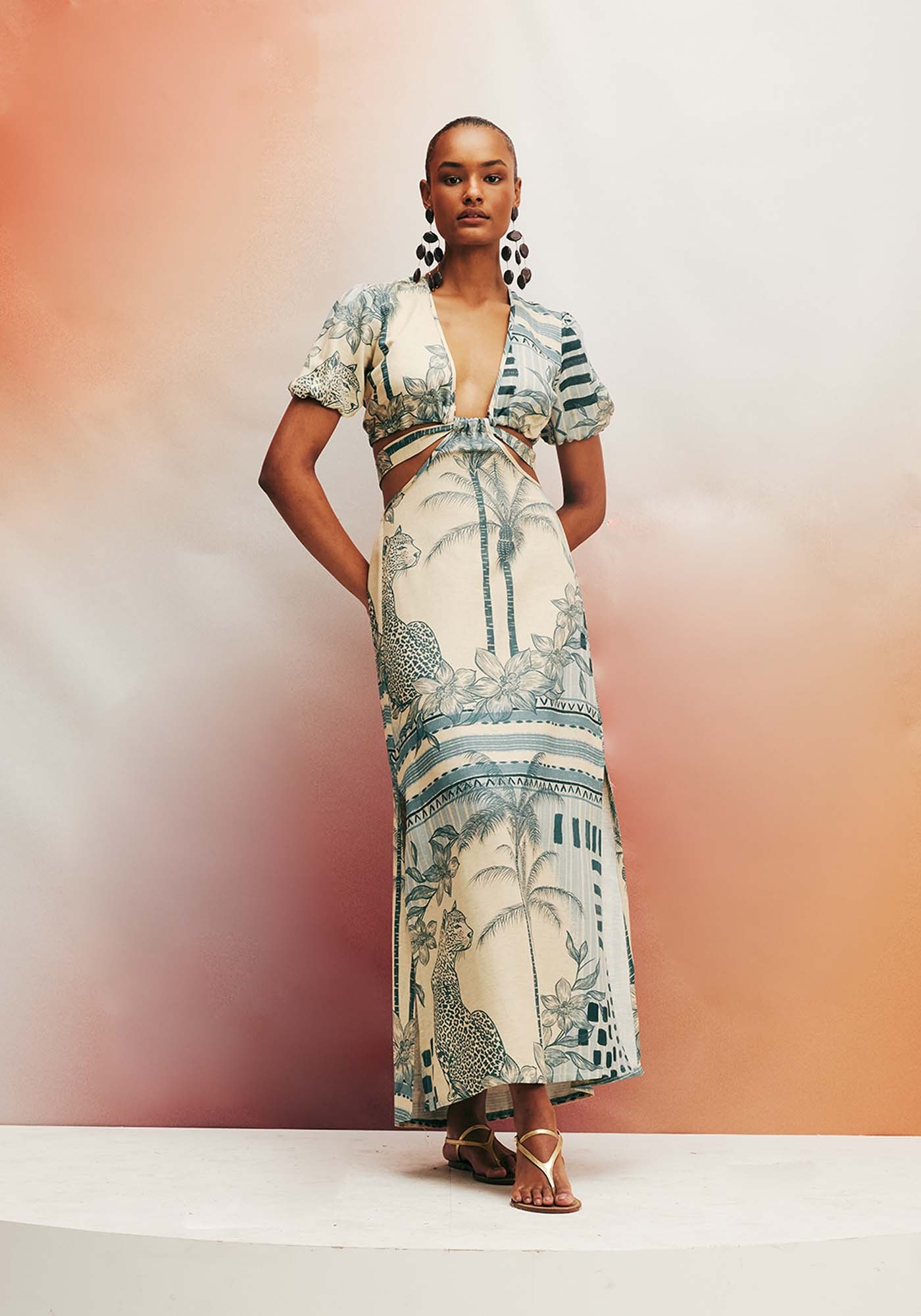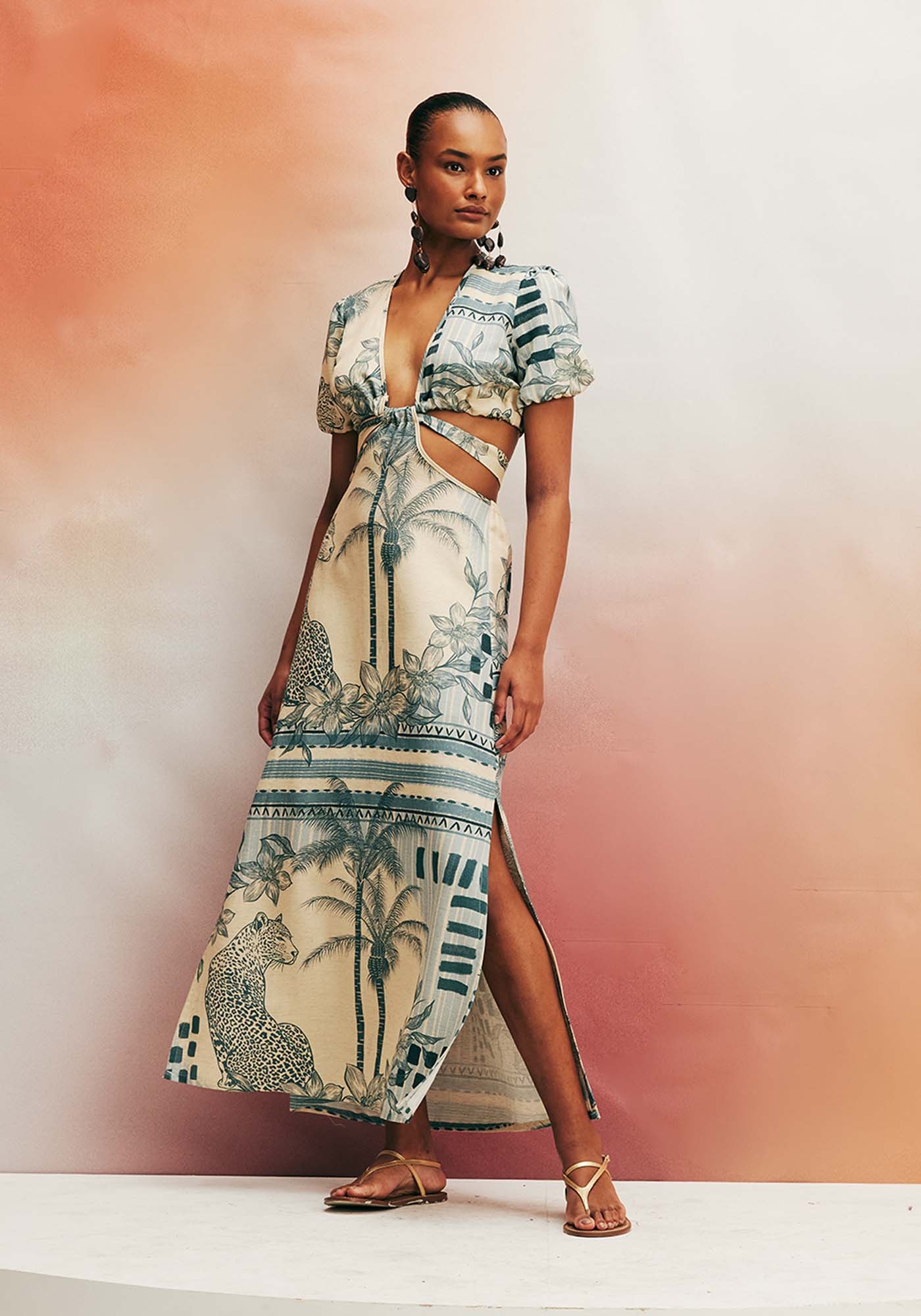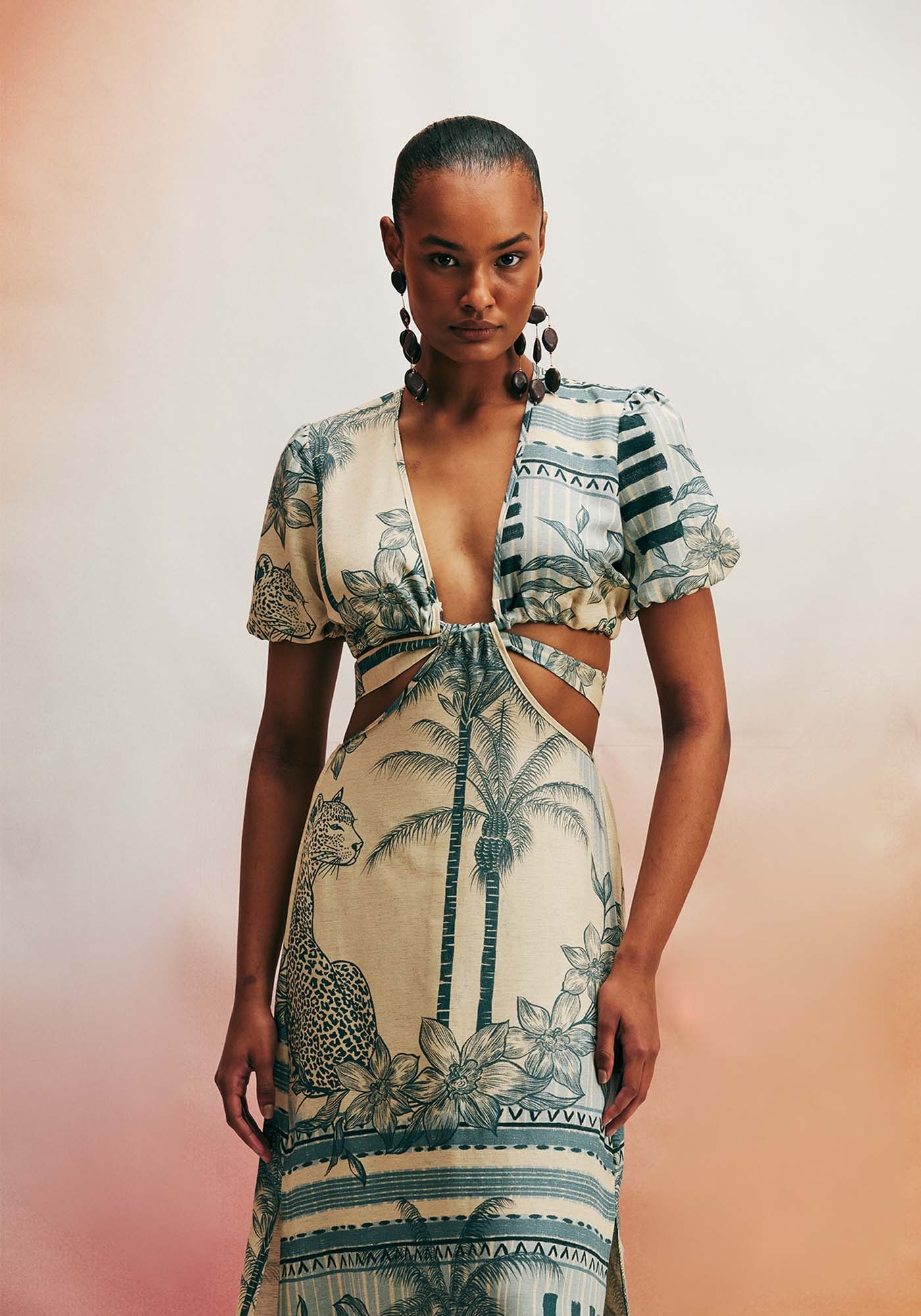 Deslumbrante eaudacioso, este vestido decotado destaca-se pelo belíssimo recorte na cintura,enquanto as duas fendas laterais proporcionam não apenas um visual arrojado,mas também conforto e mobilidade. Seu tecido de alta qualidade, composto poruma mistura cuidadosa de 50% algodão, 29% viscose, 15% modal e 6% linho, não sóconfere elegância, mas também assegura conforto incomparável em dias maisquentes.