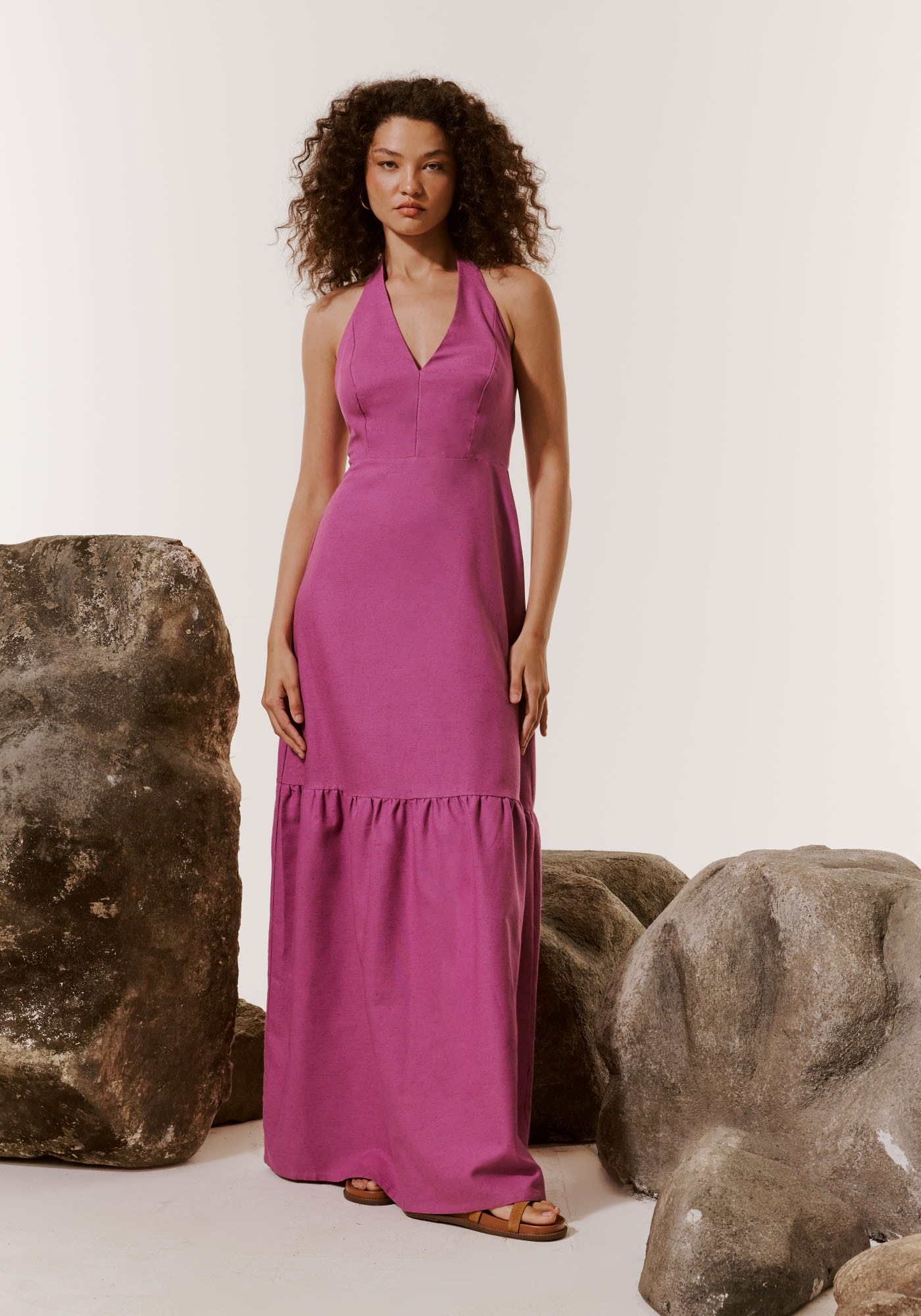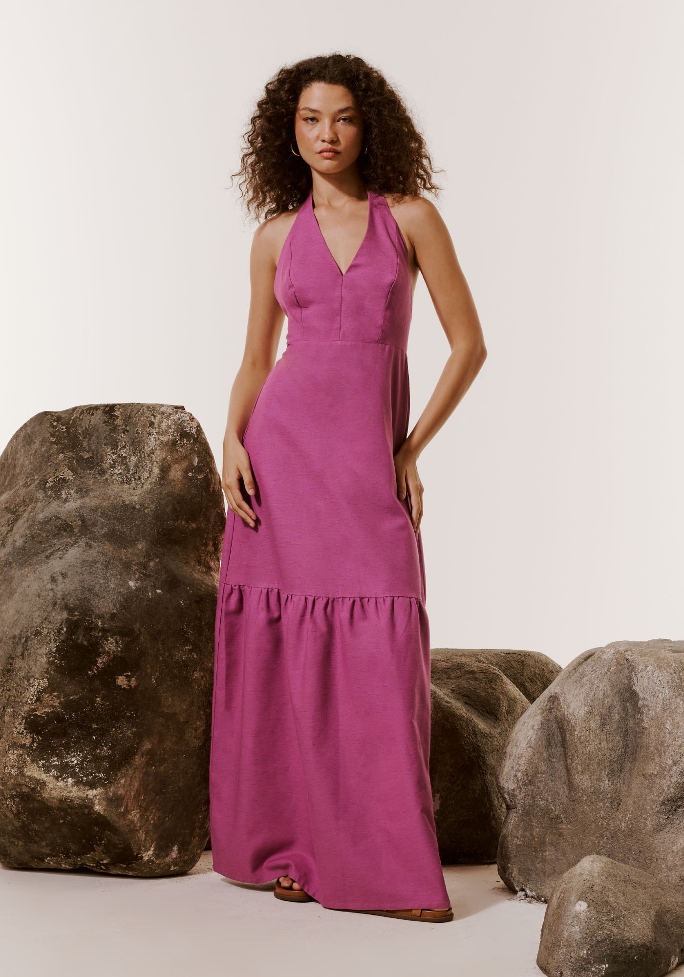 O vestido frente única é sinônimo depoder e elegância. Confeccionado em tecido 42% algodão 38% viscose 14% modal 6% linho, possui decote em V justo ao corpo que amarra no pescoço. O modelo ganha movimento e volume com a maria presente na parte de baixo.