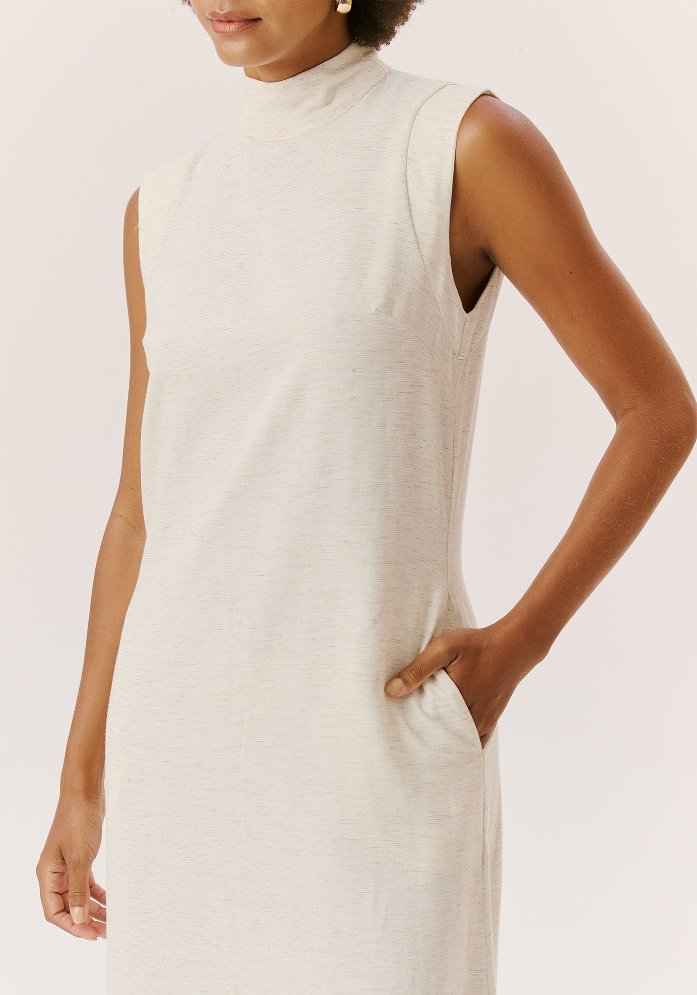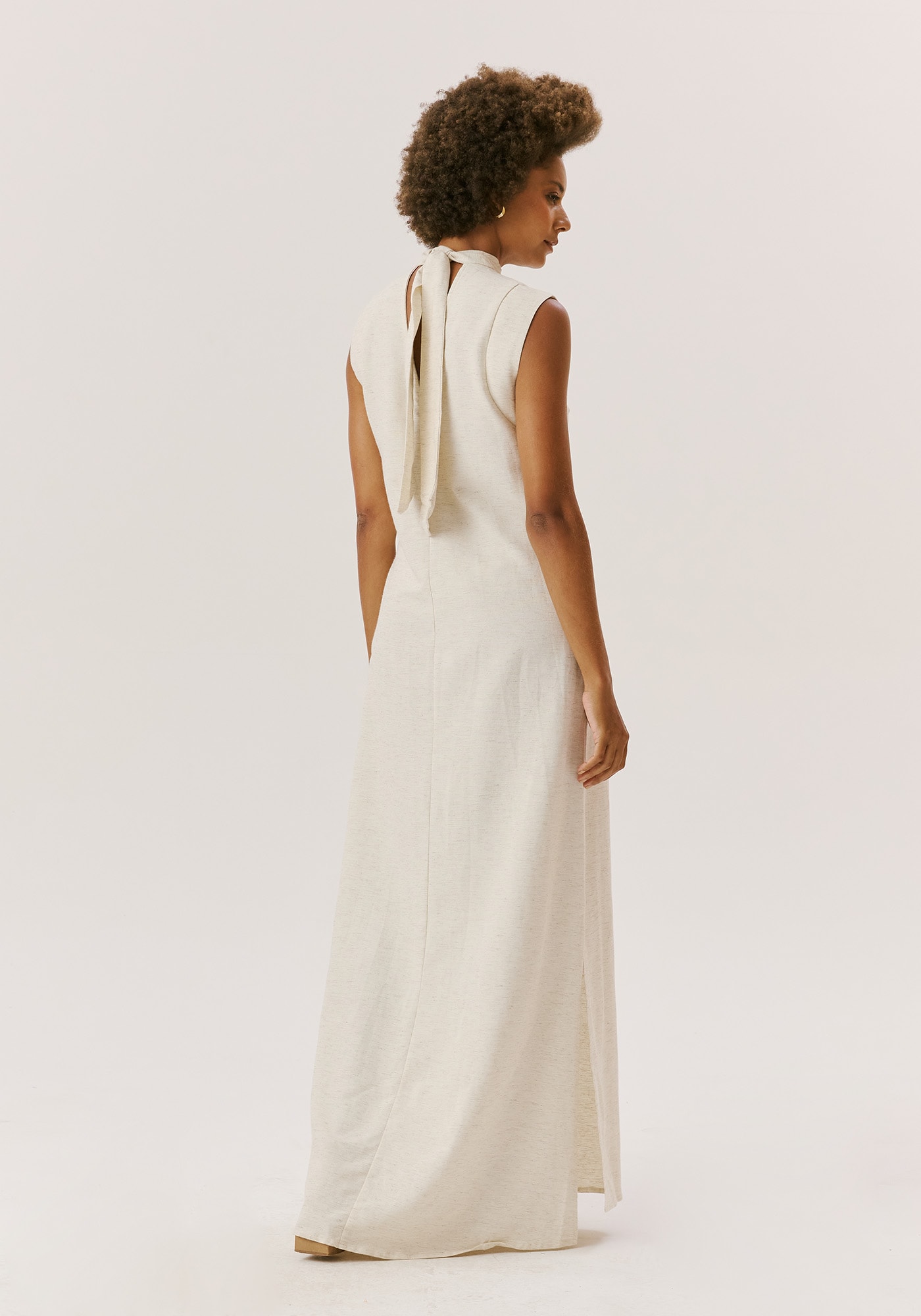 Este refinado vestidolongo apresenta uma modelagem sutilmente acinturada, destacando a silhueta comelegância. Confeccionado em tecido 42% algodão 14% modal 6% linho, possui gola alta amarrada nas costas, adicionando um toque sofisticado,enquanto o comprimento generoso é acentuado por duas fendas laterais, garantindonão apenas estilo, mas também proporcionando uma dose extra de elegância econforto.