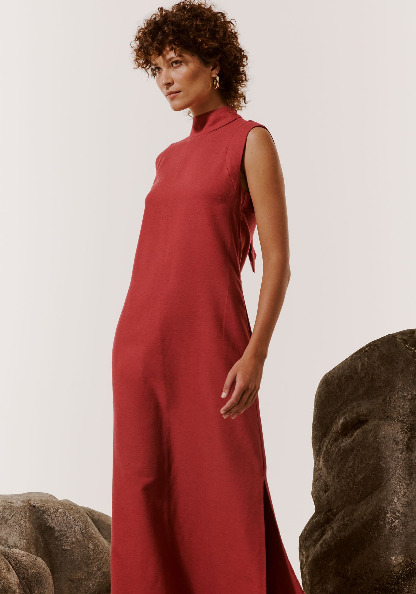 Este refinado vestidolongo apresenta uma modelagem sutilmente acinturada, destacando a silhueta comelegância. Confeccionado em tecido 42% algodão 14% modal 6% linho, possui gola alta amarrada nas costas, adicionando um toque sofisticado,enquanto o comprimento generoso é acentuado por duas fendas laterais, garantindonão apenas estilo, mas também proporcionando uma dose extra de elegância econforto.