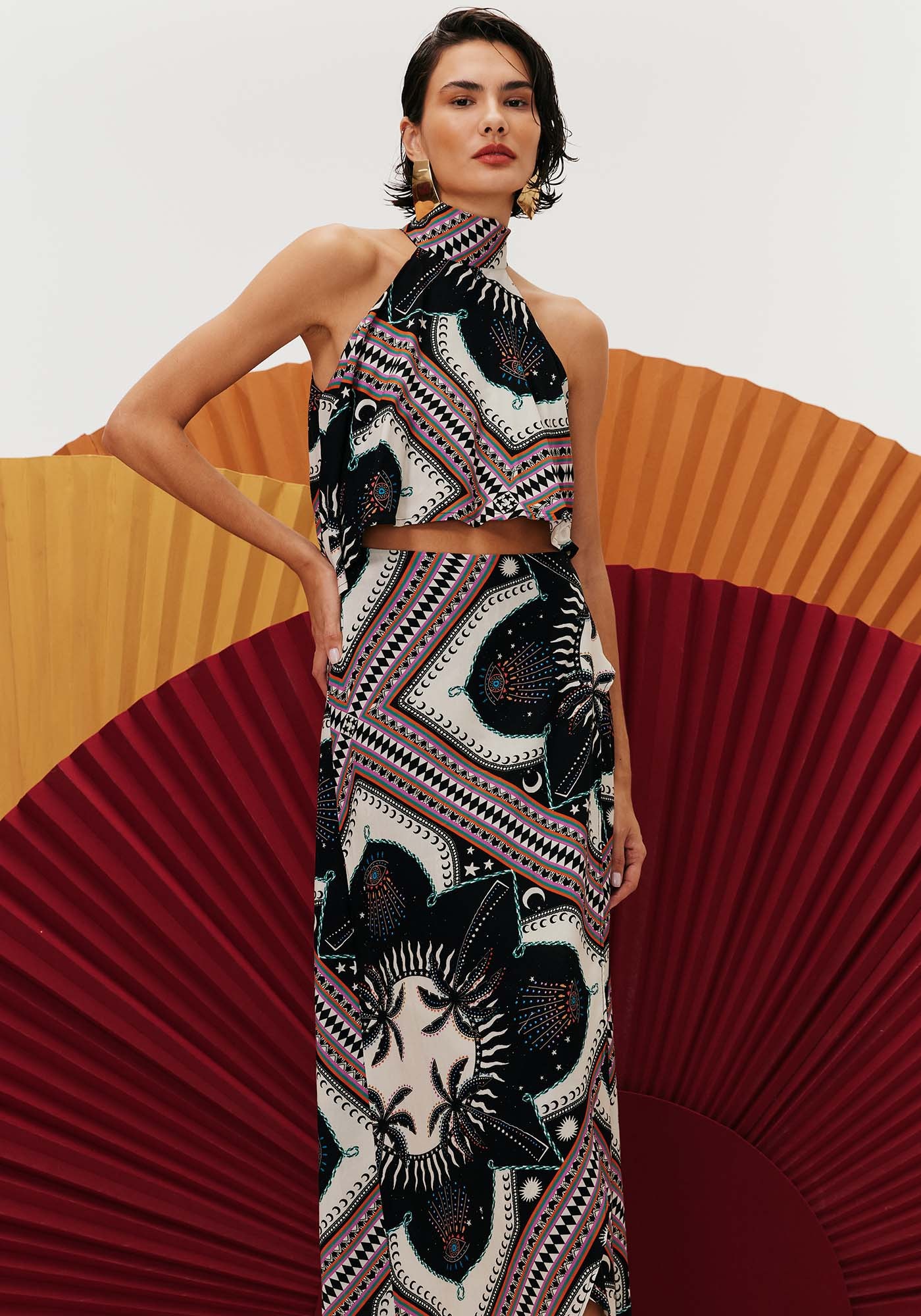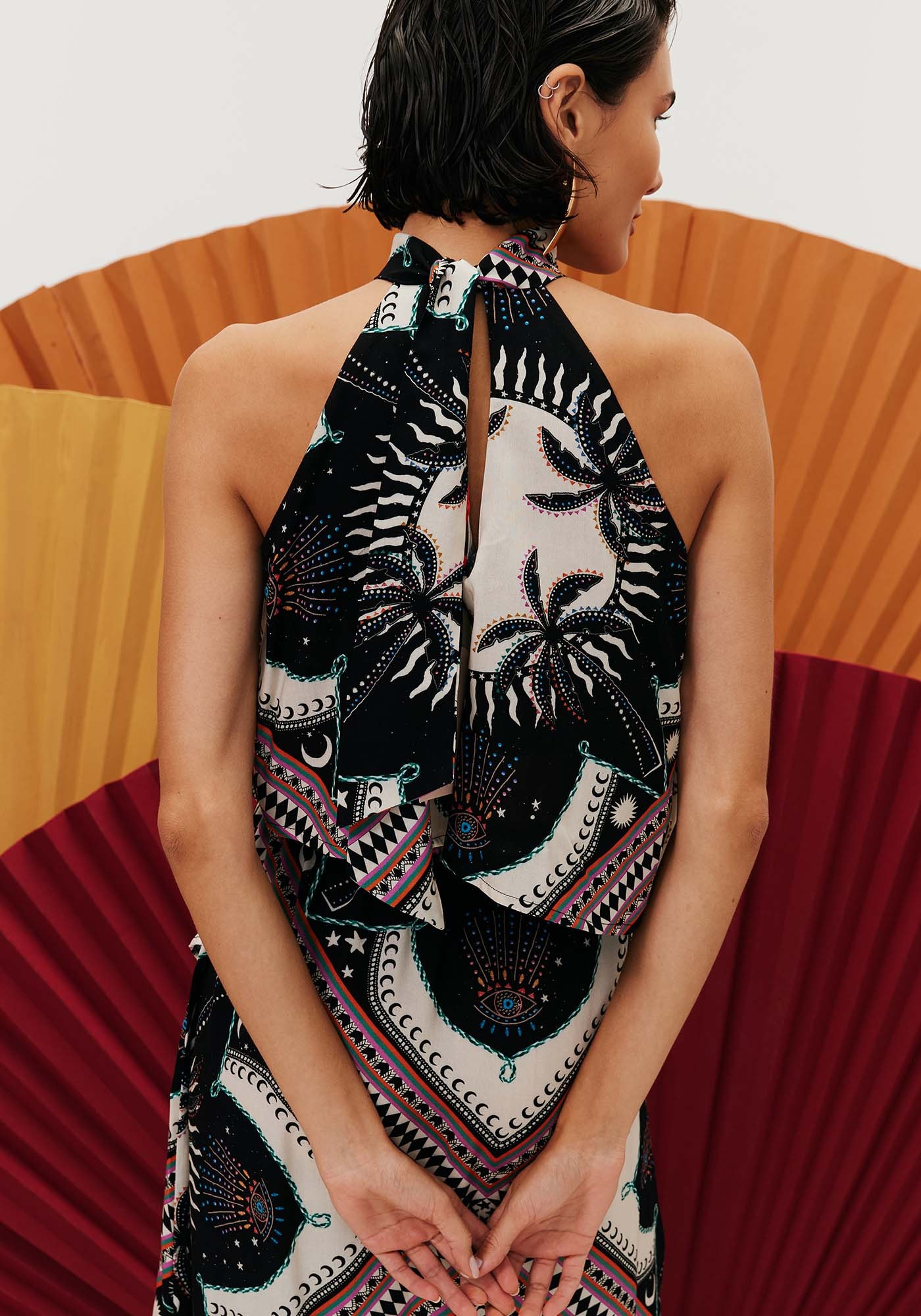O vestido estampado Cúmbia se detacapela beleza da sua modelagem diferenciada. Confeccionado em tecido 100%viscose, o vestido possui modelagem assimétrica, com recorte que valoriza asilhueta e gola alta com amarração na parte de trás do pescoço.