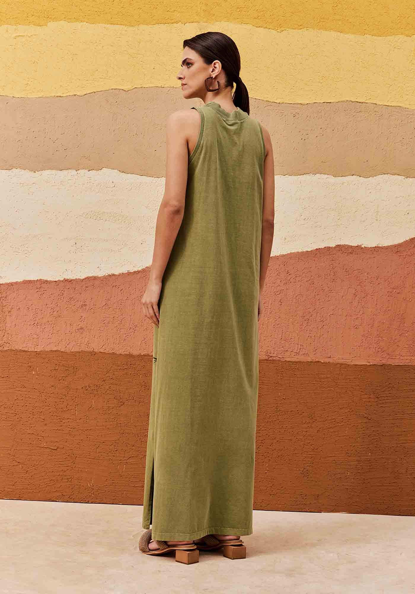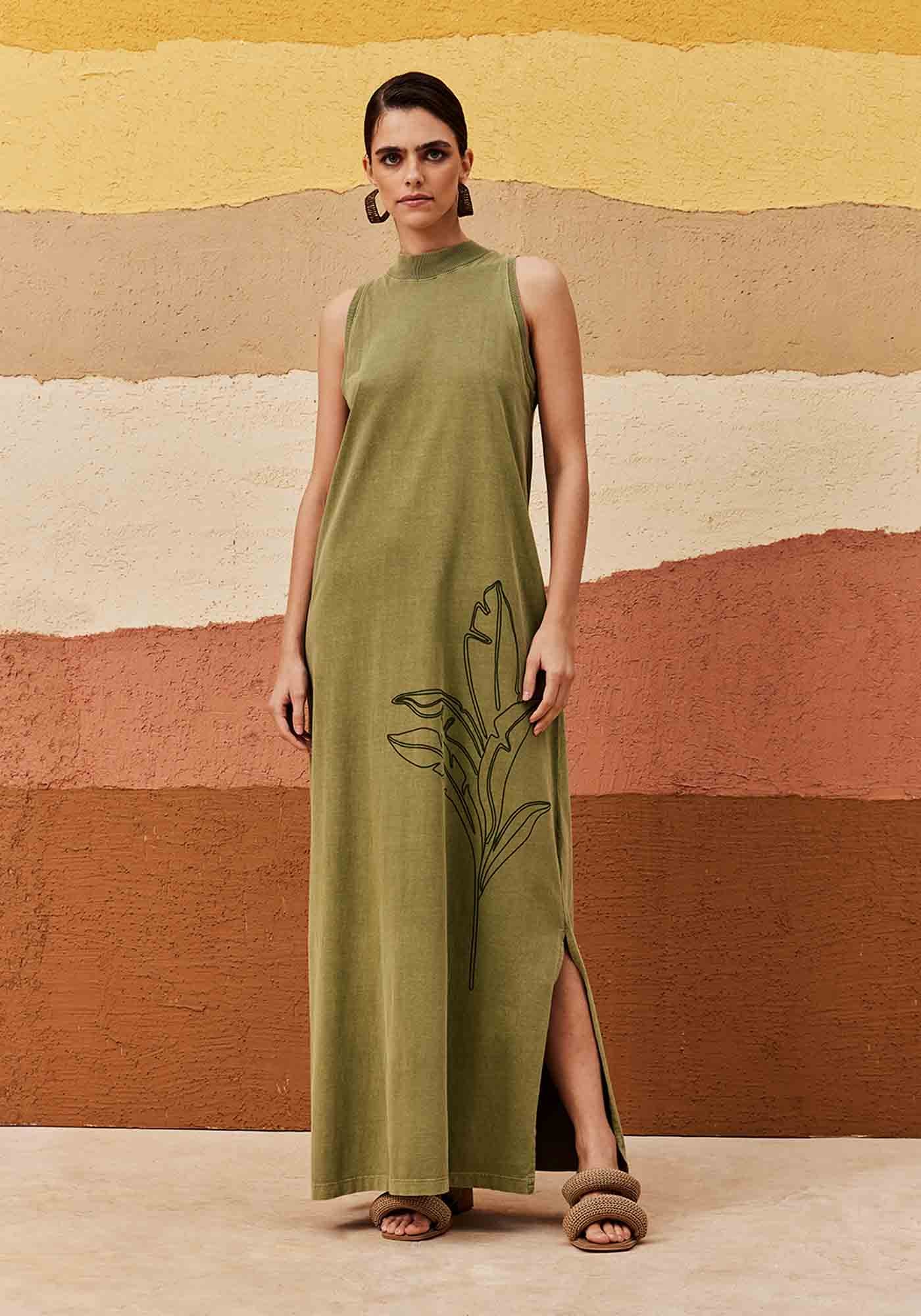 Este Vestido Longo confeccionado em Malha é a definição deelegância e praticidade. O modelo combina a sofisticação da gola alta com amodernidade das fendas laterais. O silk de folhagem na parte frontal adicionaum toque contemporâneo, criando um contraste único. Ideal para quem busca umvisual estiloso e despretensioso, o modelo regata permite liberdade demovimento enquanto exala charme.