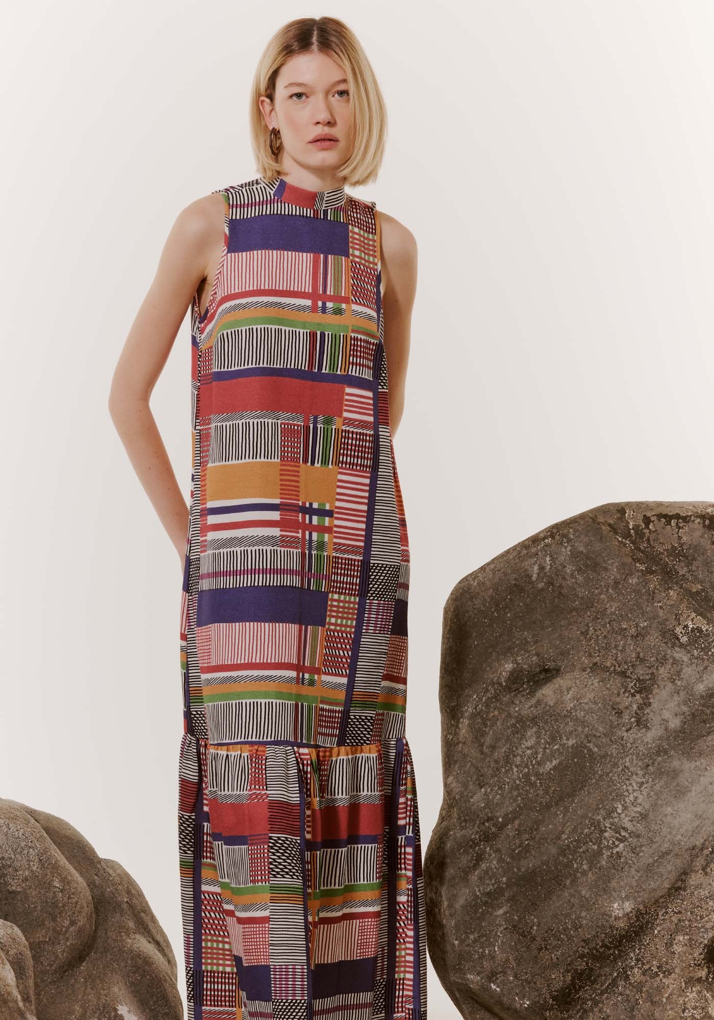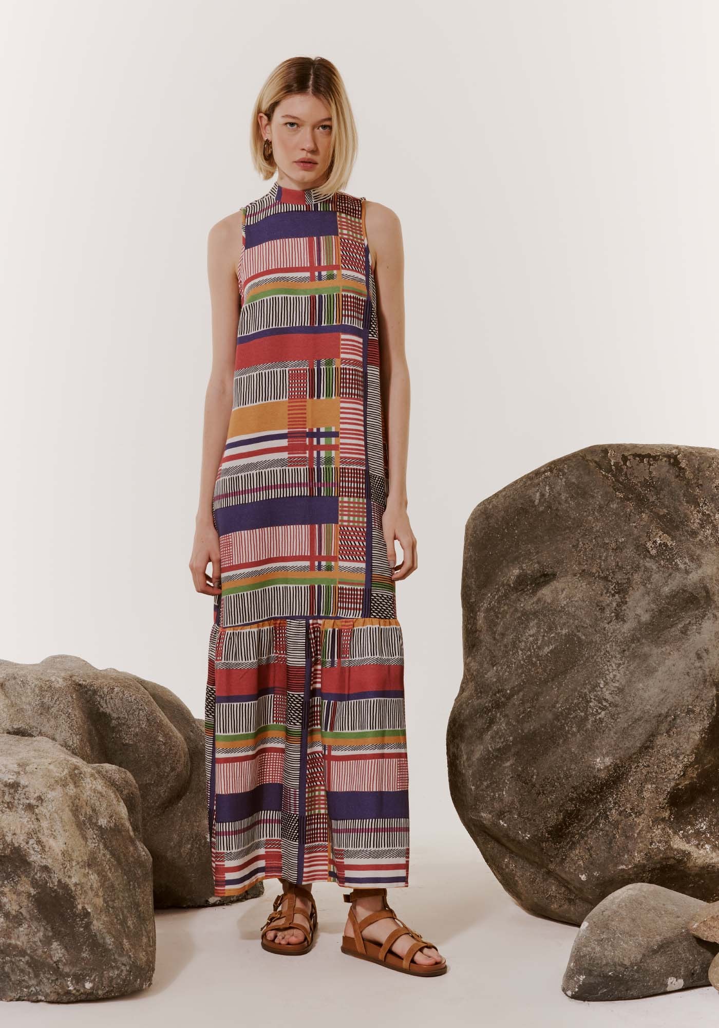 Confeccionado sem manga com golinha, amodelagem possui maria no comprimento, deixando o vestido longo com mais movimento.