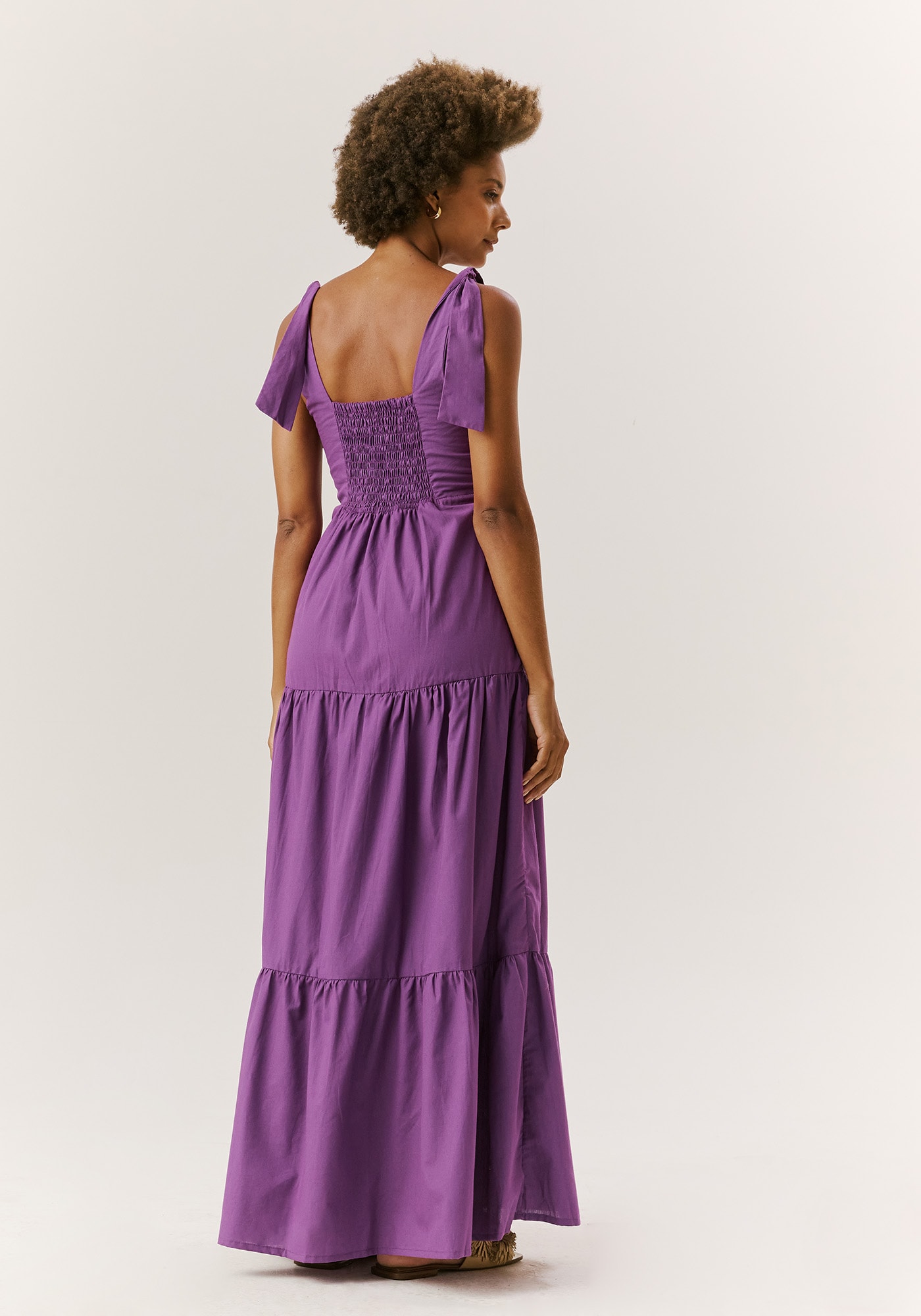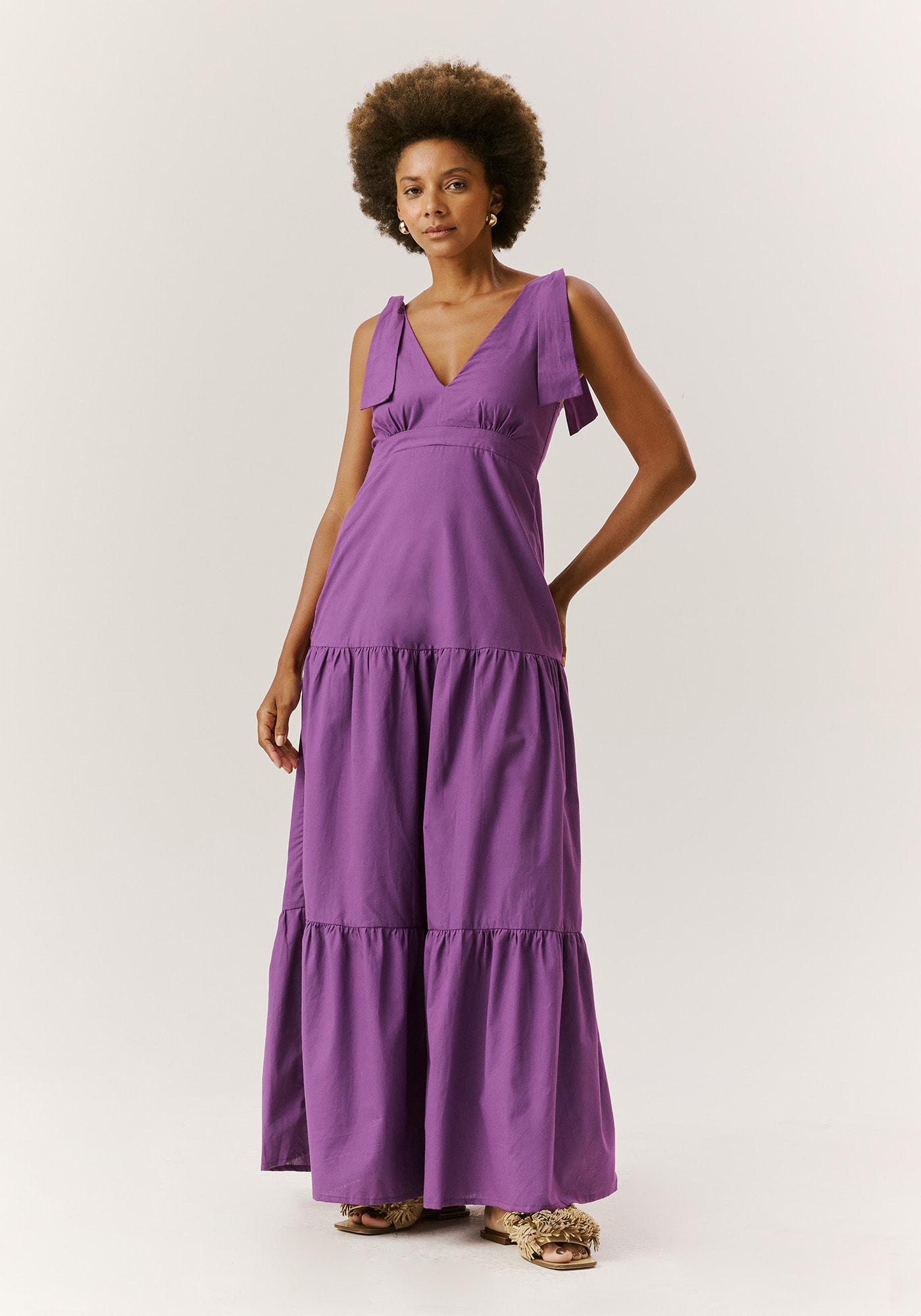 Confeccionado em tecido 100%algodão, o vestido longo é um modelo com decote V e pala abaixo do busto.Possui amarração em laço nos ombros, trazendo mais charme e beleza para a peça.As marias ao longo do comprimento dão volume e movimento para o vestido.
