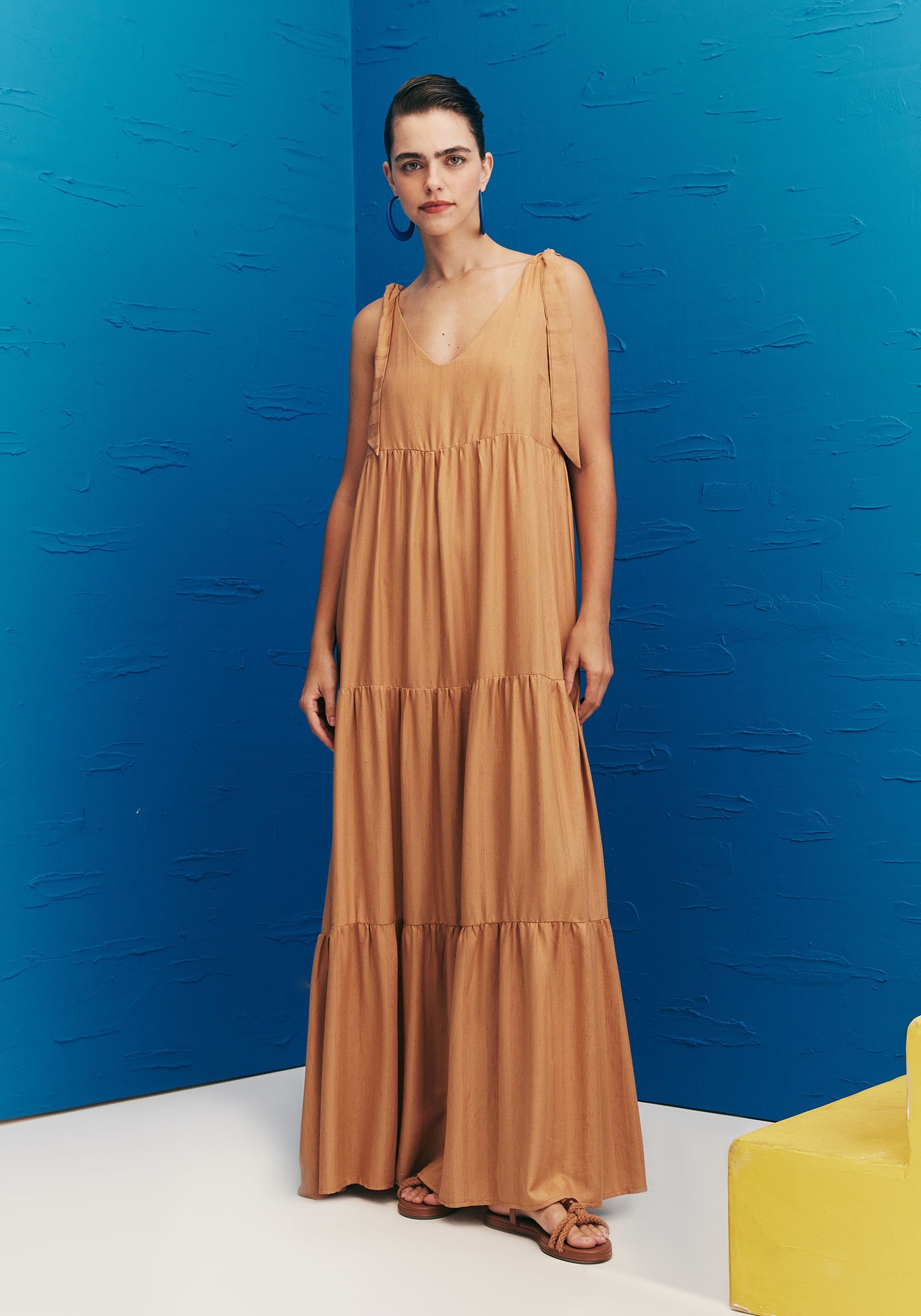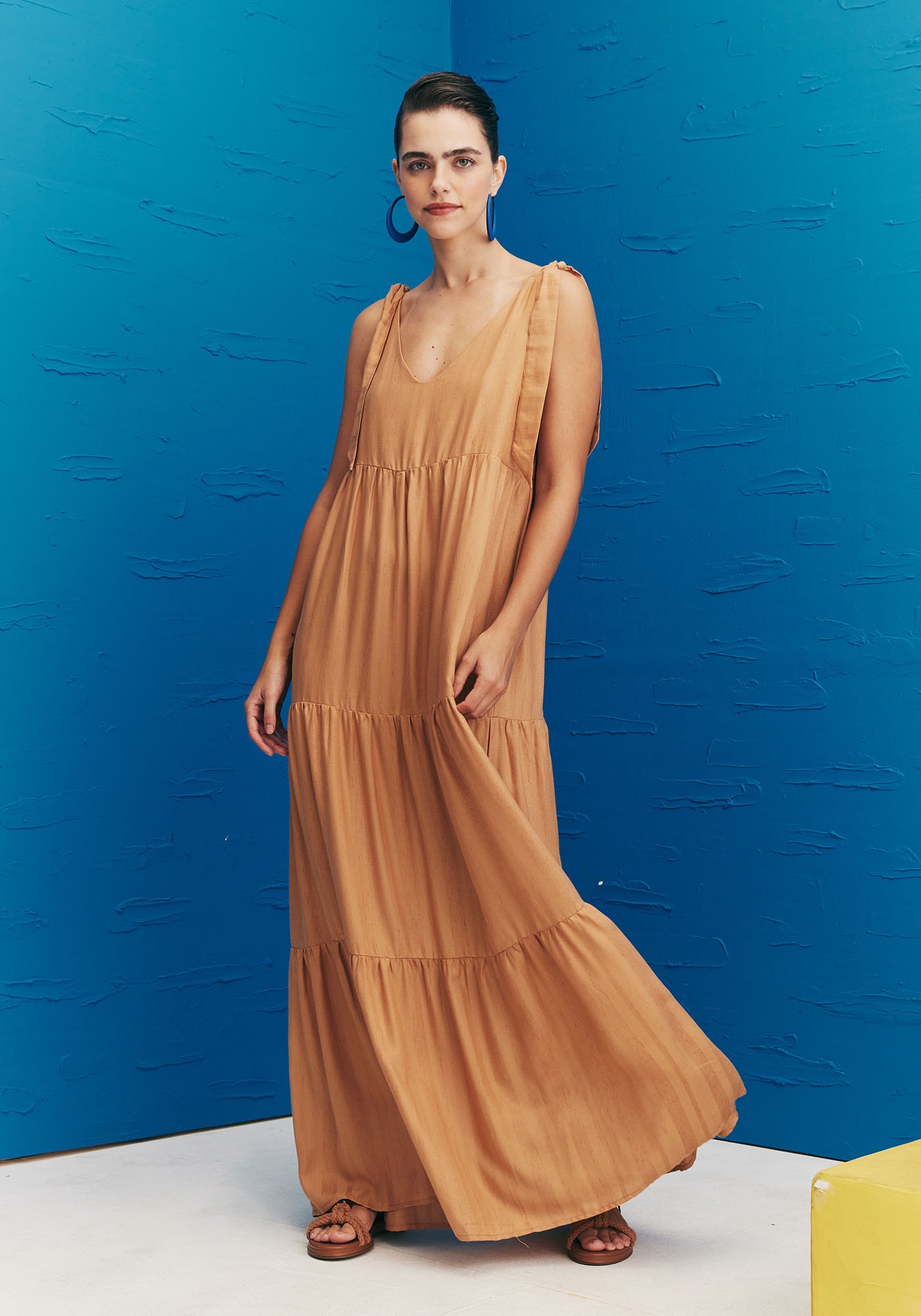 Se você busca um visual romântico,feminino e elegante o Vestido Longo Laços Ombros C/ Marias Liso é a peçaperfeita. Sua modelagem ampla confere modernidade e conforto ao visual,enquanto suas três marias junto aos laços na região do ombro trazem maisromantismo. Possui decote em V tanto na parte frontal como nas costas. Estemodelo prático, sofisticado e estiloso é perfeito para seu guarda-roupa deverão. Seu tecido é de composição 97% Viscose 3% Linho.