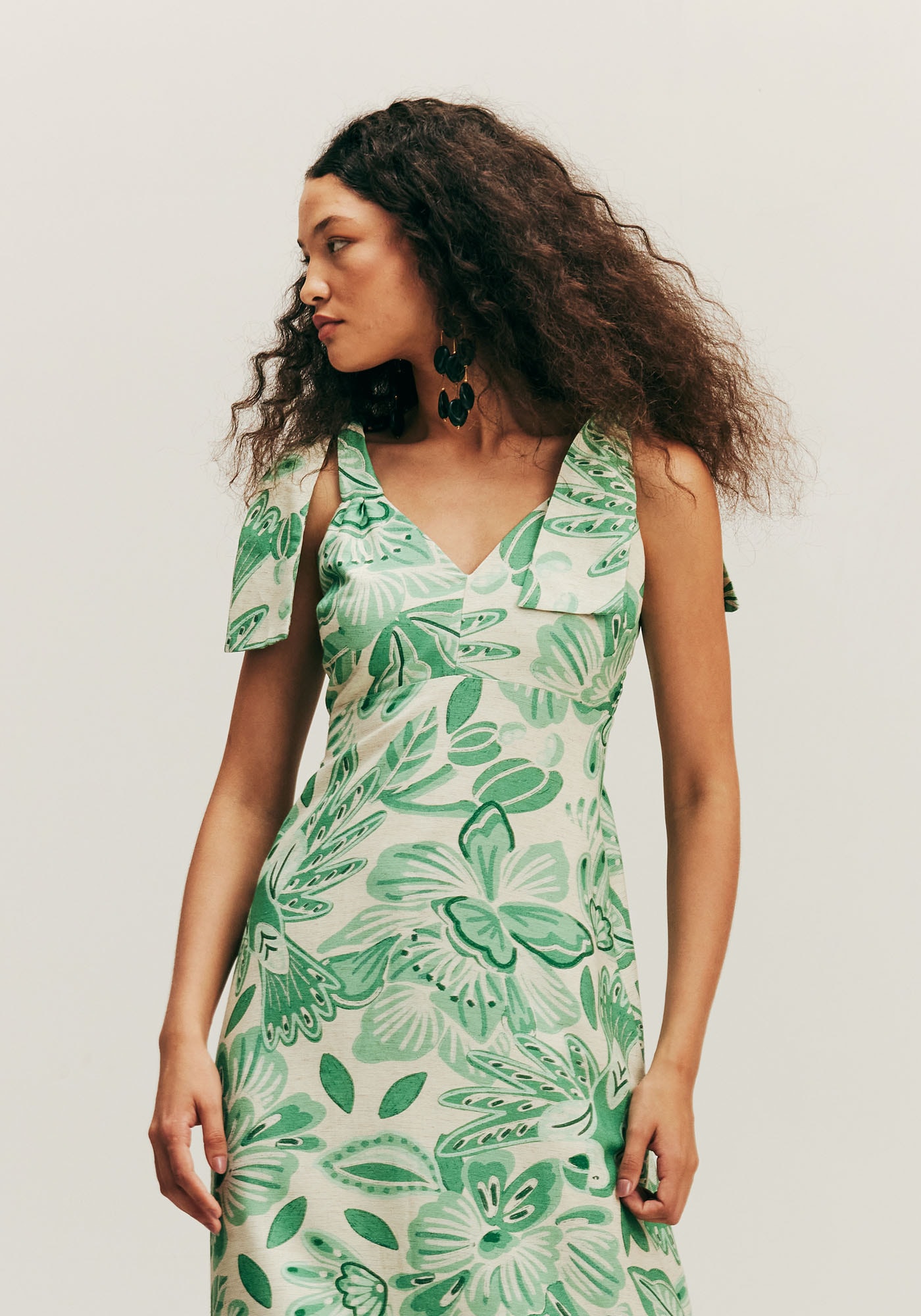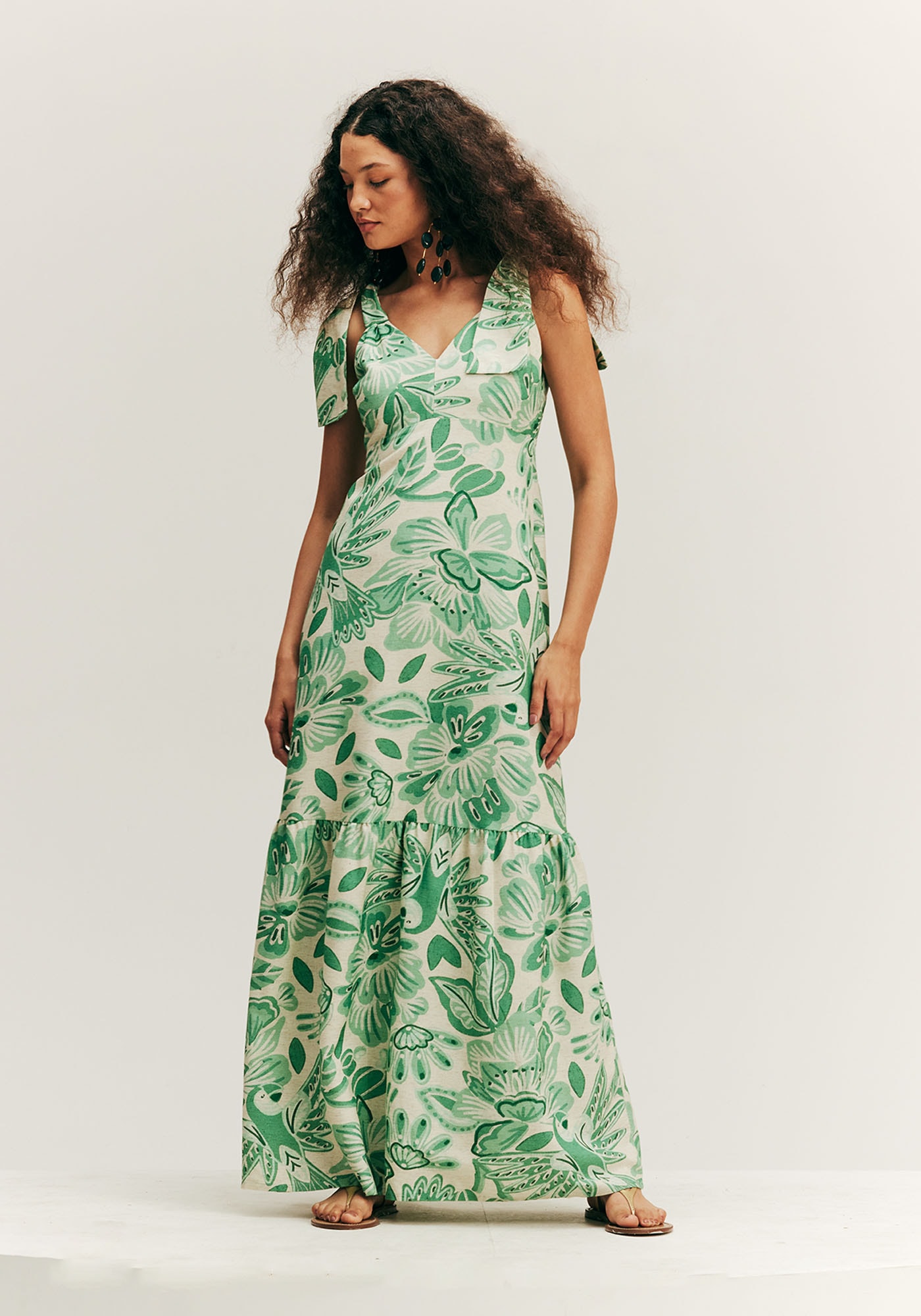 Confeccionado com uma luxuosa mistura de algodão(42%), viscose (38%), modal (14%) e linho (6%), este vestido longo personificapura elegância e presença. O tom sofisticado de verde na estampa adiciona umtoque chic à peça, complementado pelas alças com amarração nos ombros,proporcionando uma combinação refinada de estilo e conforto.