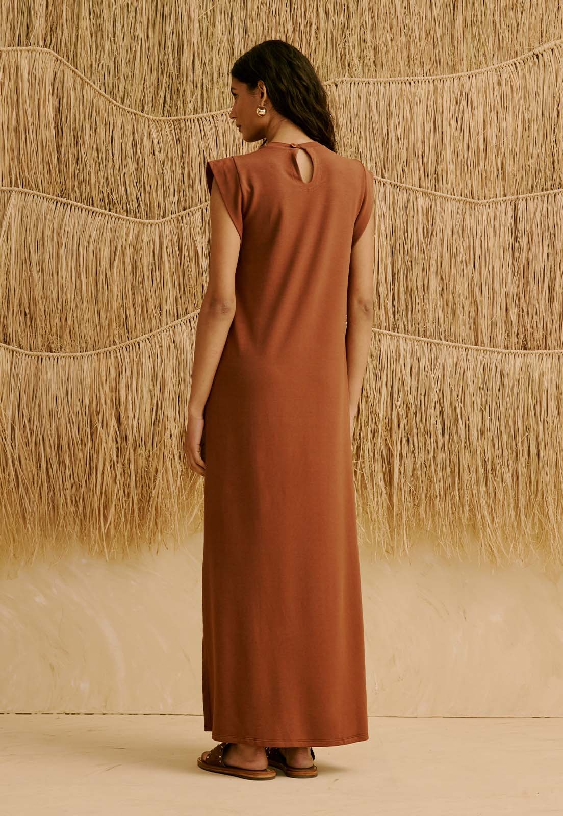 O Vestido Longo Reto Muscle Tee da CaCay tem modelagem ampla e elegante, com caimento fluido que acompanha o corpo. O busto veste leve, a cintura permanece solta e o quadril tem bastante liberdade, ideal para quem busca conforto prolongado. O comprimento longo e o detalhe muscle tee nos ombros criam uma silhueta moderna e atemporal. A forma é grande. Se estiver em dúvida entre dois tamanhos, recomendamos optar pelo menor, com base na tabela de medidas. A modelo da foto tem 1,75 m, veste manequim 36 e está usando o tamanho P.